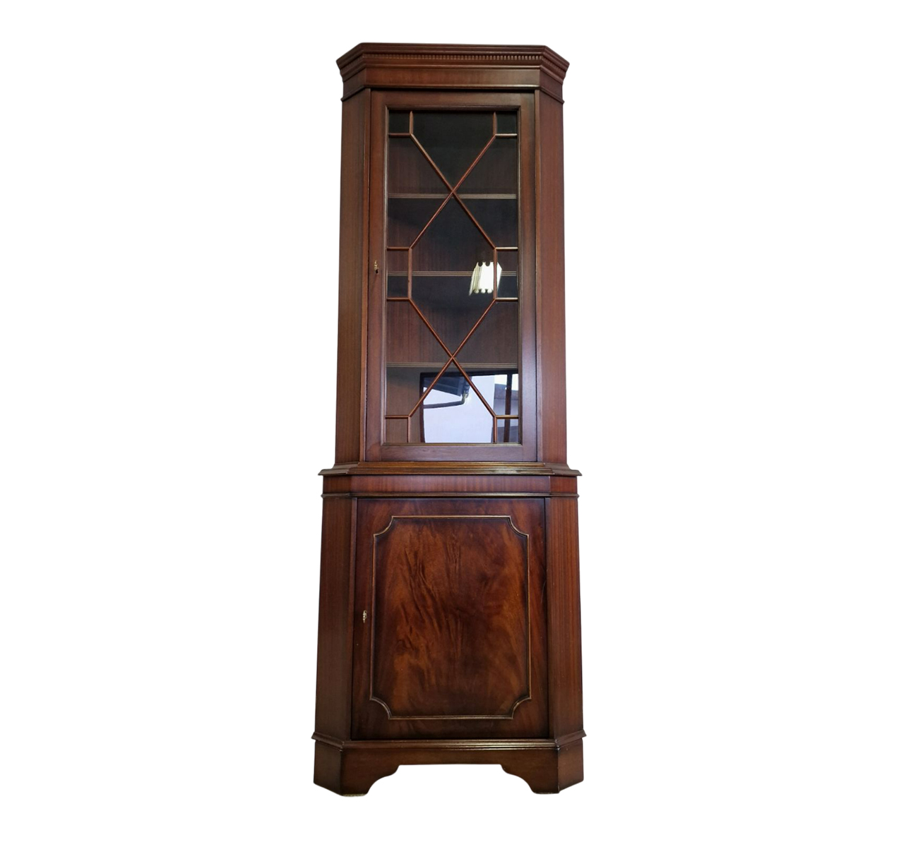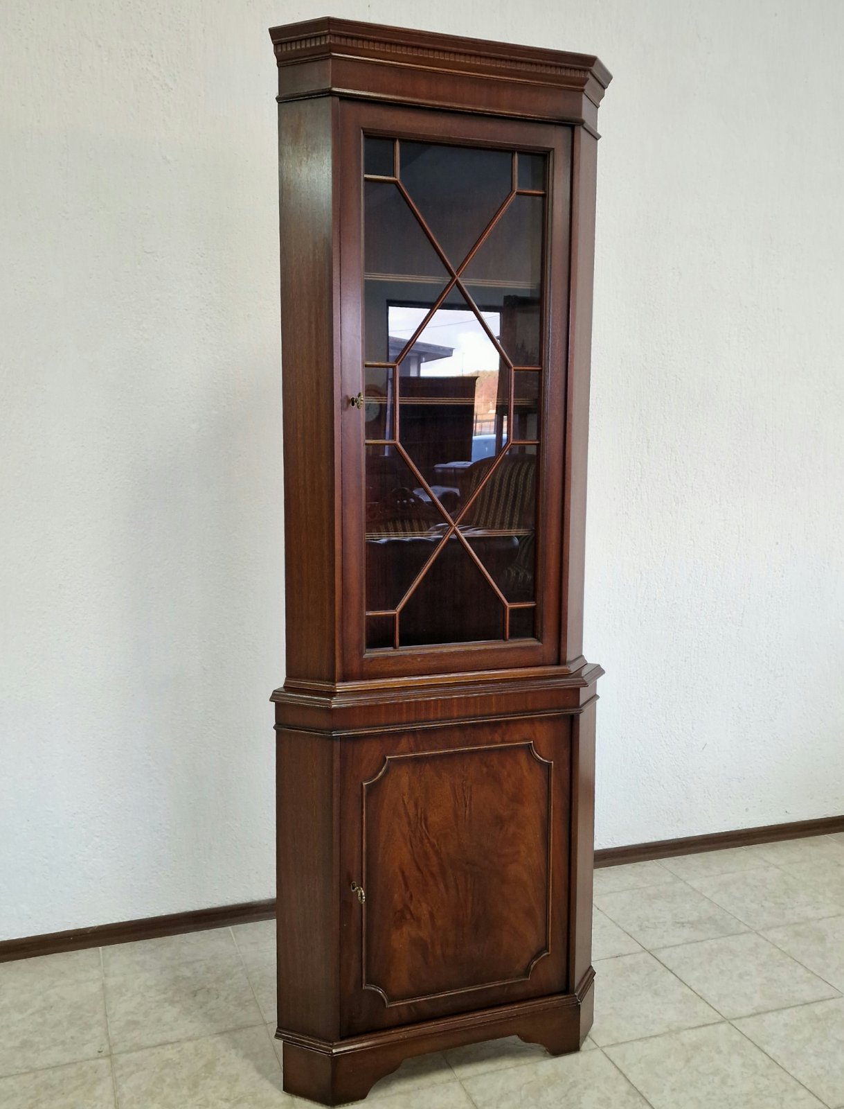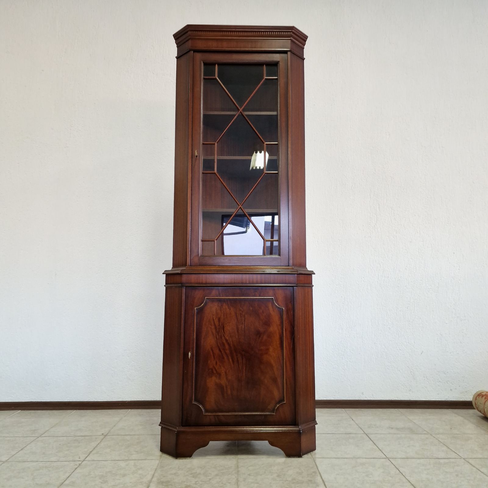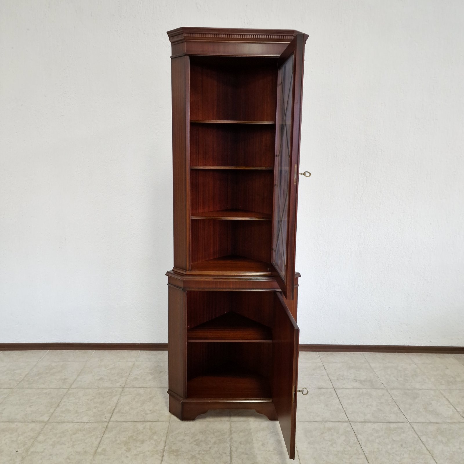 Представяме ви изискана ъглова витрина Chesterfield, изработена изцяло на ръка с внимание към всеки детайл. Конструкцията е от масивен махагон – благородно дърво, известно със своята здравина, стабилност и топъл, дълбок цвят, който придава на витрината класическа и впечатляваща визия. Моделът е съставен от две отделни части, което улеснява транспортирането и монтажа, а същевременно запазва цялостната елегантност и симетрия на дизайна.