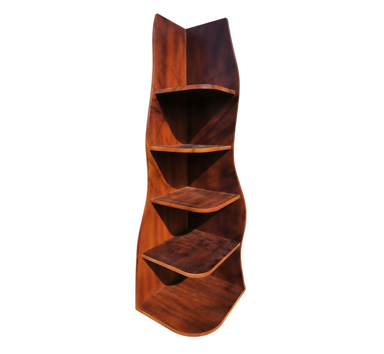 Тази елегантна ъглова витрина-шкафче е стилно и практично решение за всеки дом. Изработена е от дърво с наситен топъл кафяв цвят, който придава уют и изисканост на помещението. Дизайнът ѝ следва плавна, вълнообразна линия, която добавя модерен и артистичен акцент. Разполага с няколко стабилни рафта, разположени асиметрично за по-интересна визия. Всеки рафт предлага достатъчно пространство за декорации, книги, сувенири или саксийни растения. Компактната ѝ форма я прави идеална за оптимално използване на ъглови пространства. Гладката повърхност подчертава естествената текстура и красота на дървесината. Конструкцията е стабилна и надеждна, подходяща за дългосрочна употреба. Моделът съчетава функционалност и естетика в едно практично решение за интериора. Тази витрина е отличен избор за хол, офис или спалня, където стилът среща удобството.
