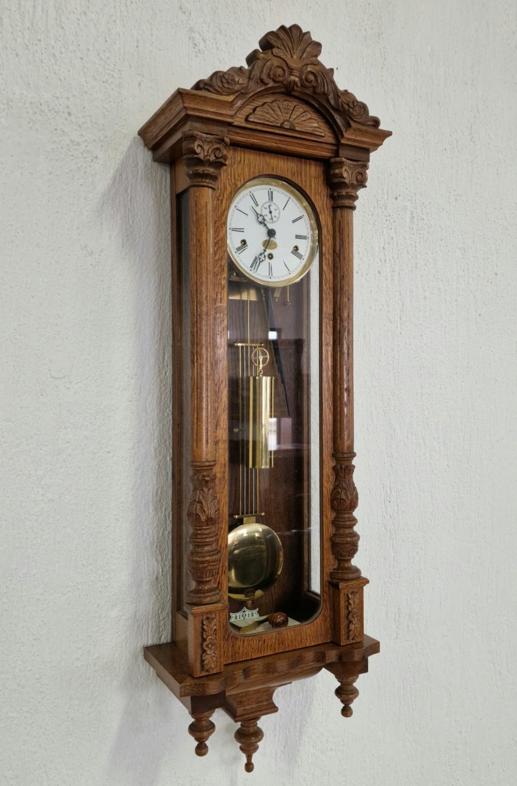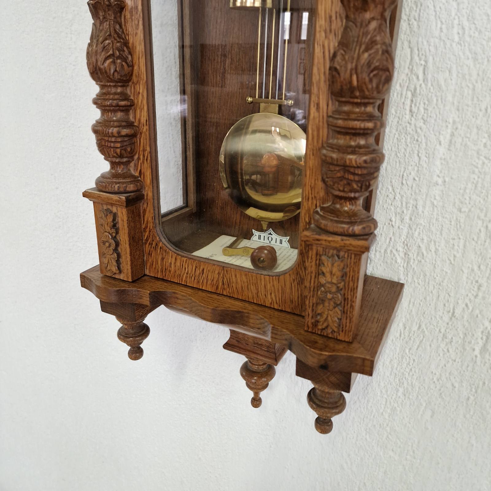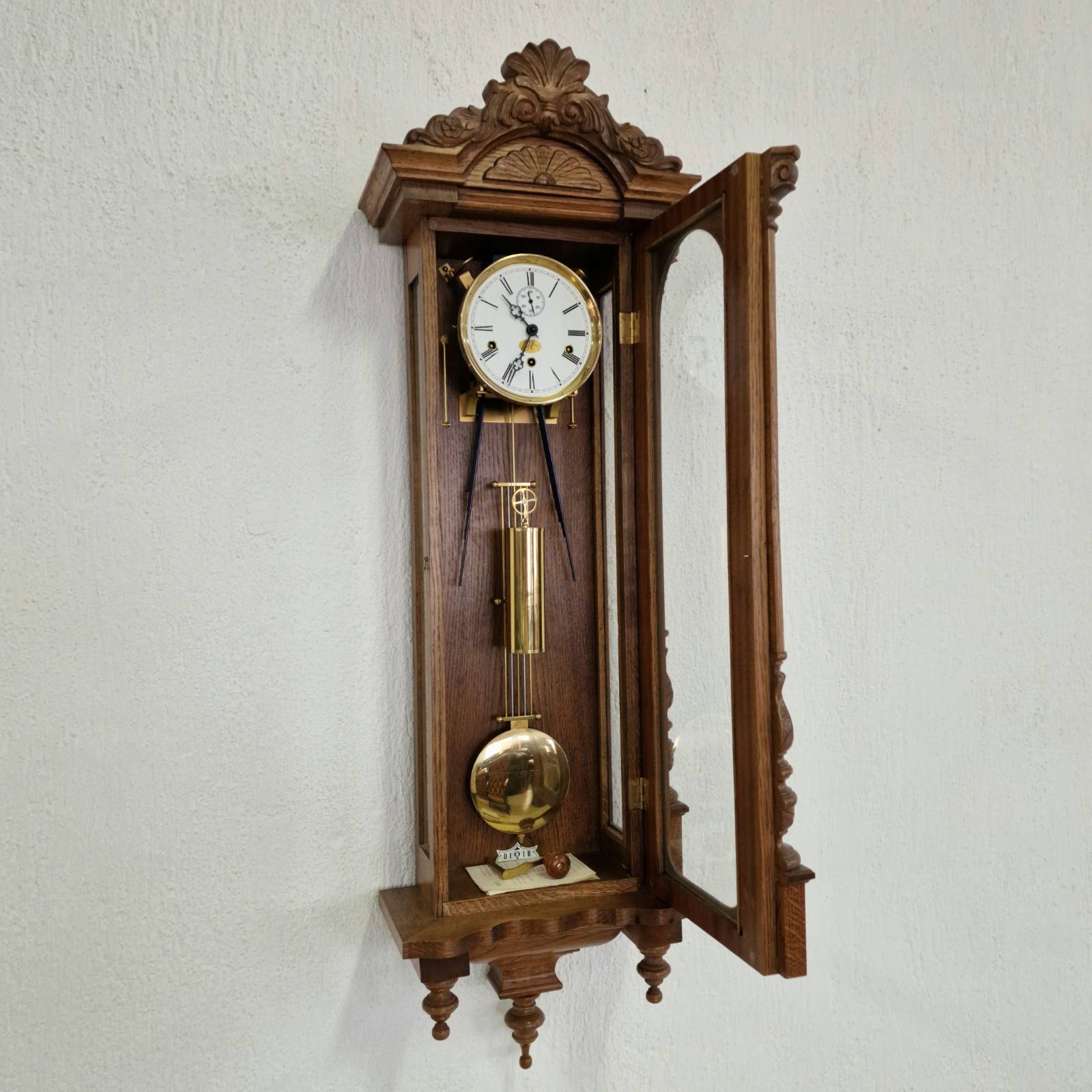 Представяме Ви един изключителен екземпляр на класическото немско часовникарство. Този великолепен стенен часовник, производство на реномираната марка Kieninger, съчетава прецизността на немския механизъм с майсторството на традиционната дърворезба. Корпусът е изработен от масивен дъб, което придава на часовника топлина, стабилност и дълготрайност. Отличава се с богата и детайлна дърворезба по целия корпус и декоративен завършек, подчертаващ античния му характер.