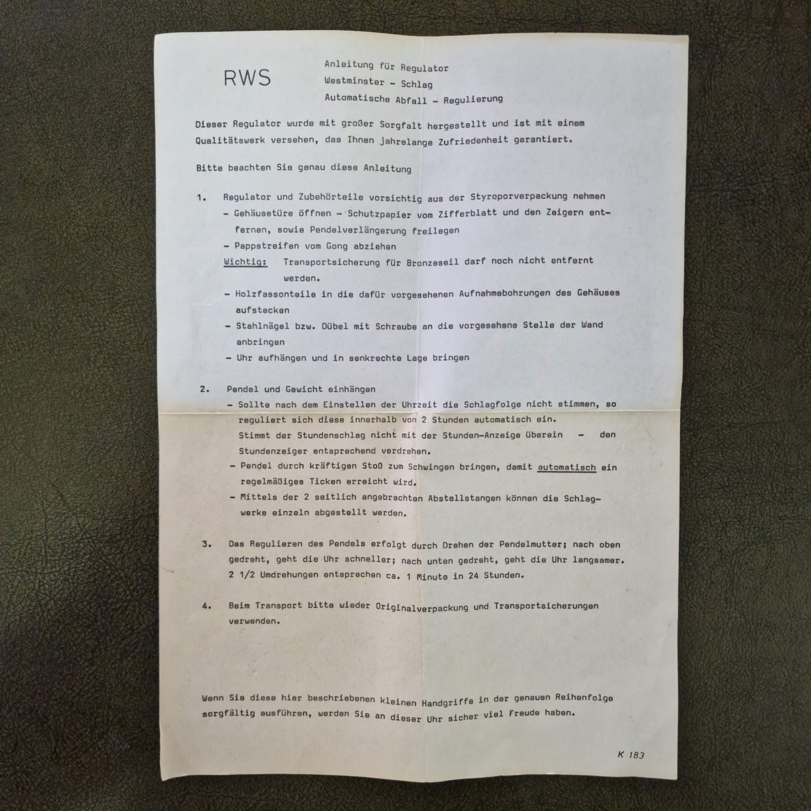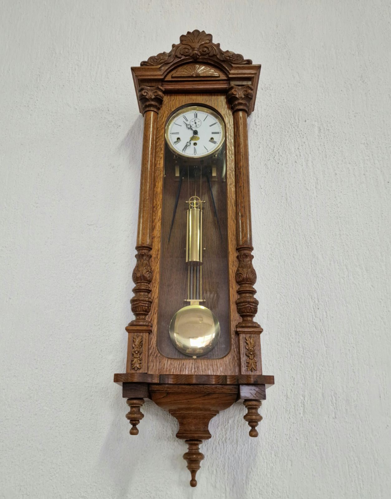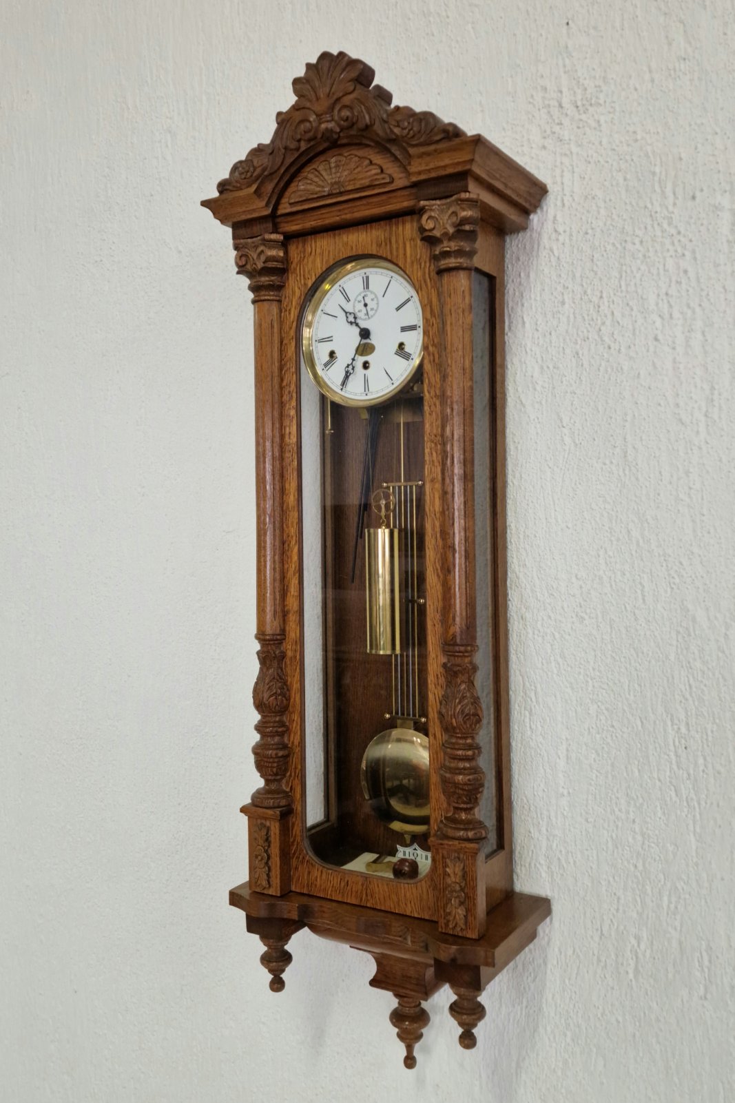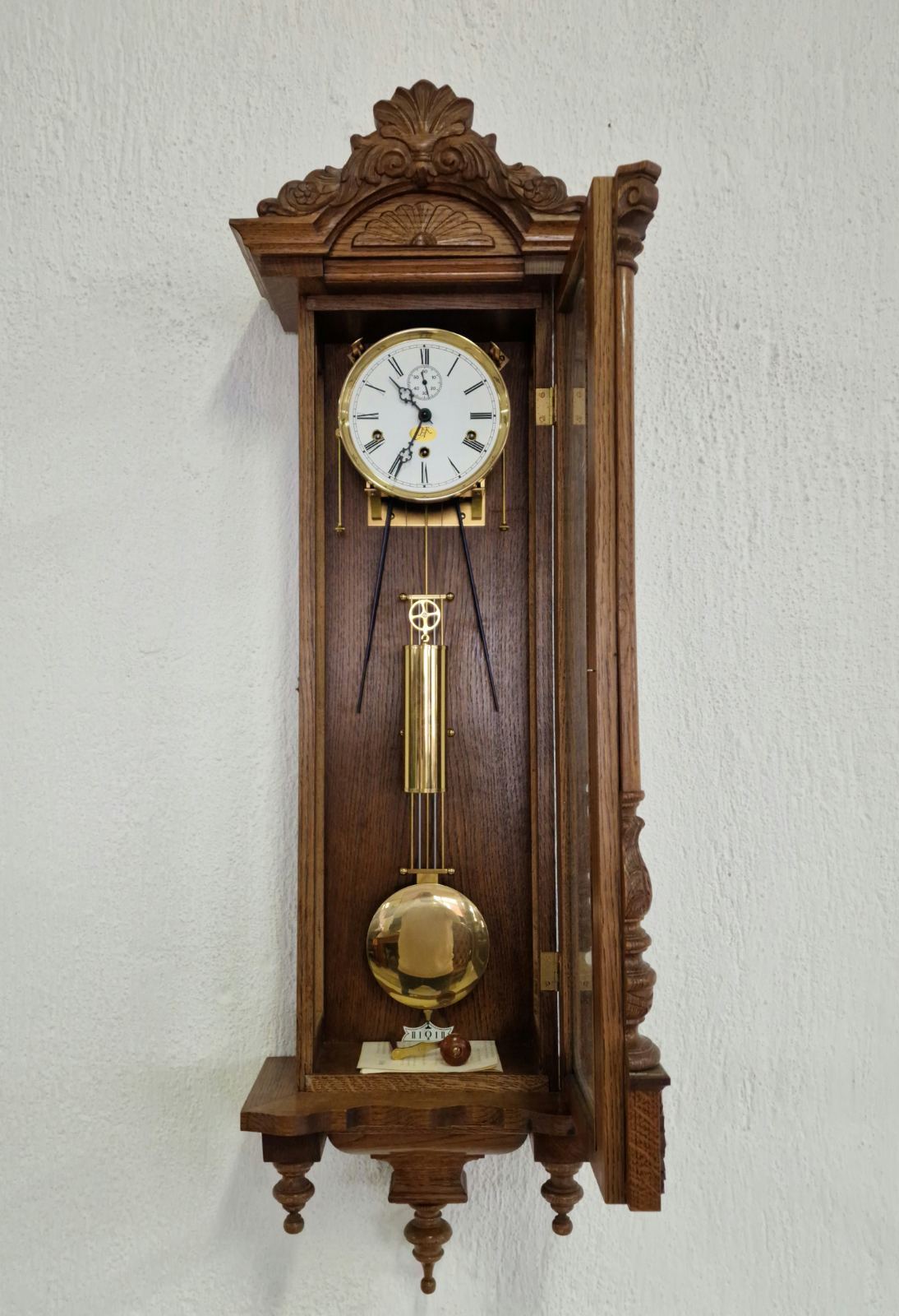 Представяме Ви един изключителен екземпляр на класическото немско часовникарство. Този великолепен стенен часовник, производство на реномираната марка Kieninger, съчетава прецизността на немския механизъм с майсторството на традиционната дърворезба. Корпусът е изработен от масивен дъб, което придава на часовника топлина, стабилност и дълготрайност. Отличава се с богата и детайлна дърворезба по целия корпус и декоративен завършек, подчертаващ античния му характер.