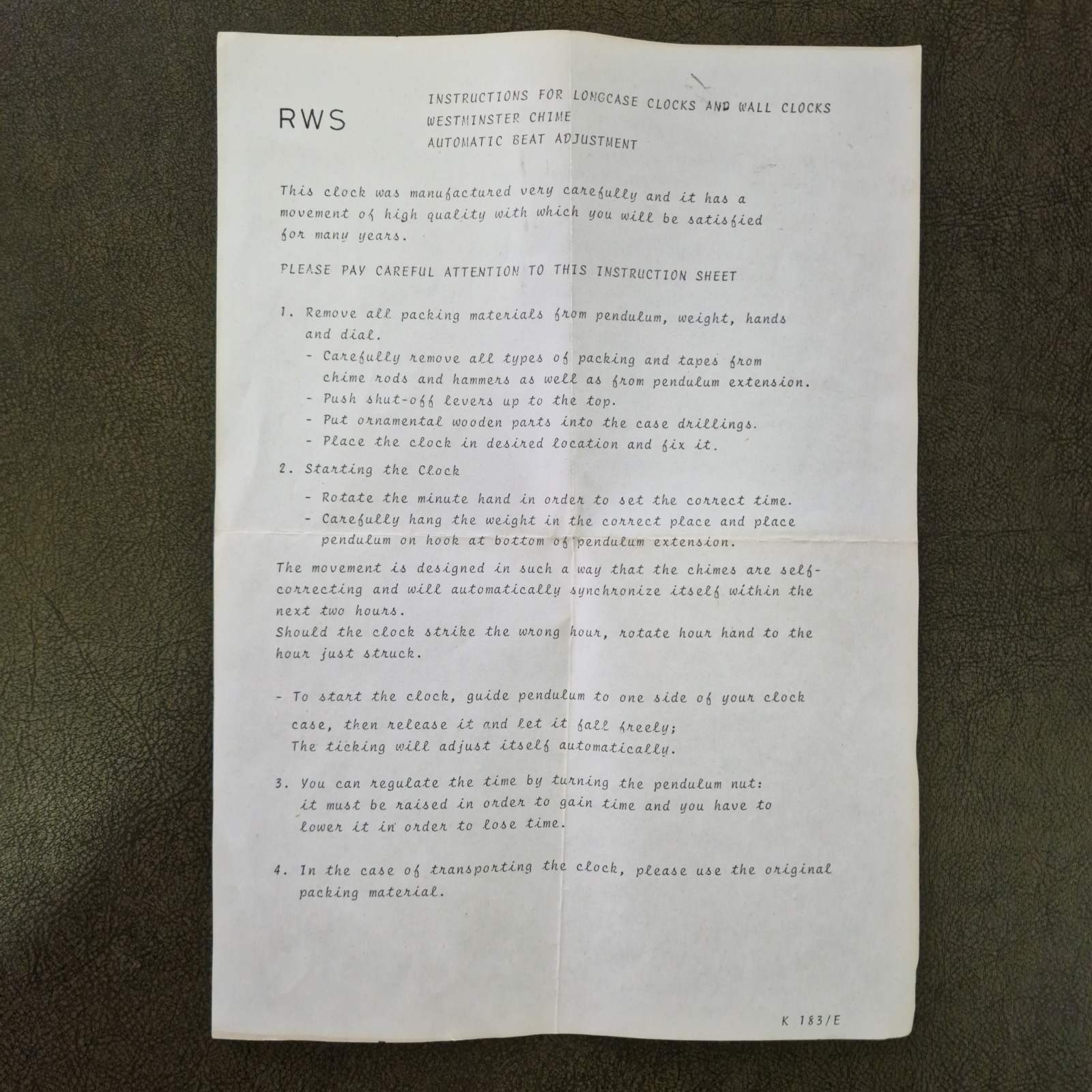Часовникът е с механичен механизъм, задвижван от две полирани месингови тежести и голямо махало. Навиването става ръчно с ключ, което гарантира автентично изживяване. Разполага с елегантен бял циферблат с черни арабски цифри и стилни черни стоманени стрелки. В долната част е интегриран и малък циферблат за секундите. Механизмът включва функция за отброяване на часовете и половин часовете, което добавя уют и чар във всеки дом.