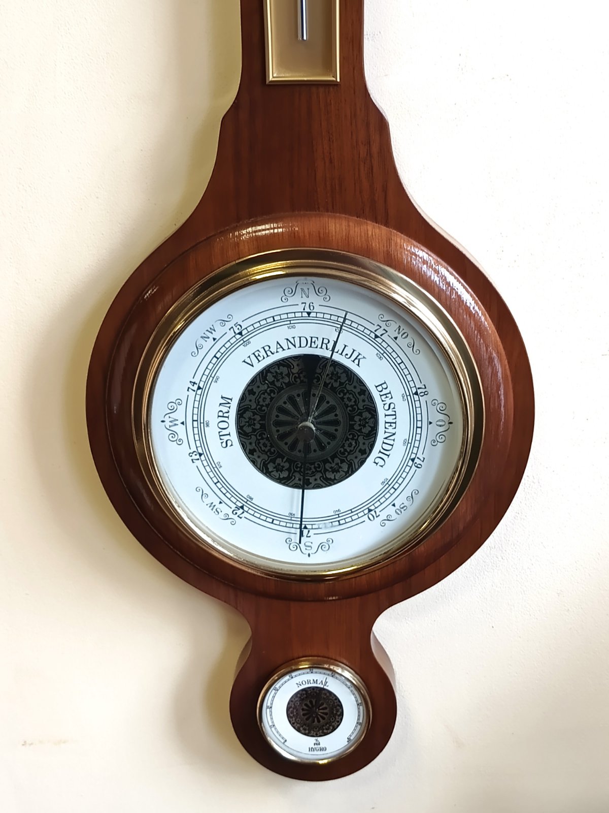 Античният стенен барометър е елегантен уред за измерване на атмосферното налягане, използва се предимно за прогнозиране на времето. Изработен от дърво и месинг с декоративни елементи и класически циферблат, той съчетава функционалност и ретро чар. Подходящ е както за колекционери, така и като стилен акцент в интериора.