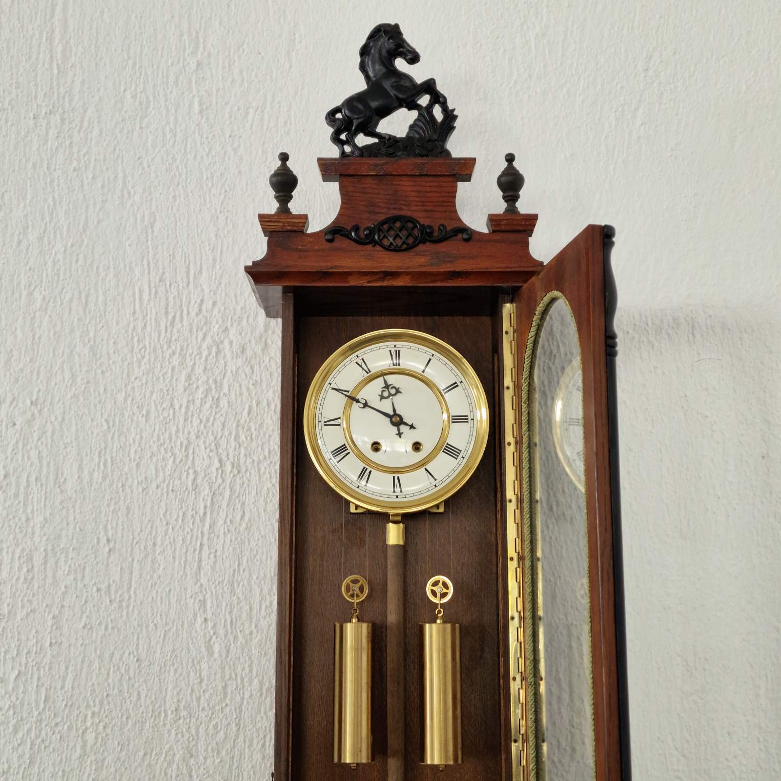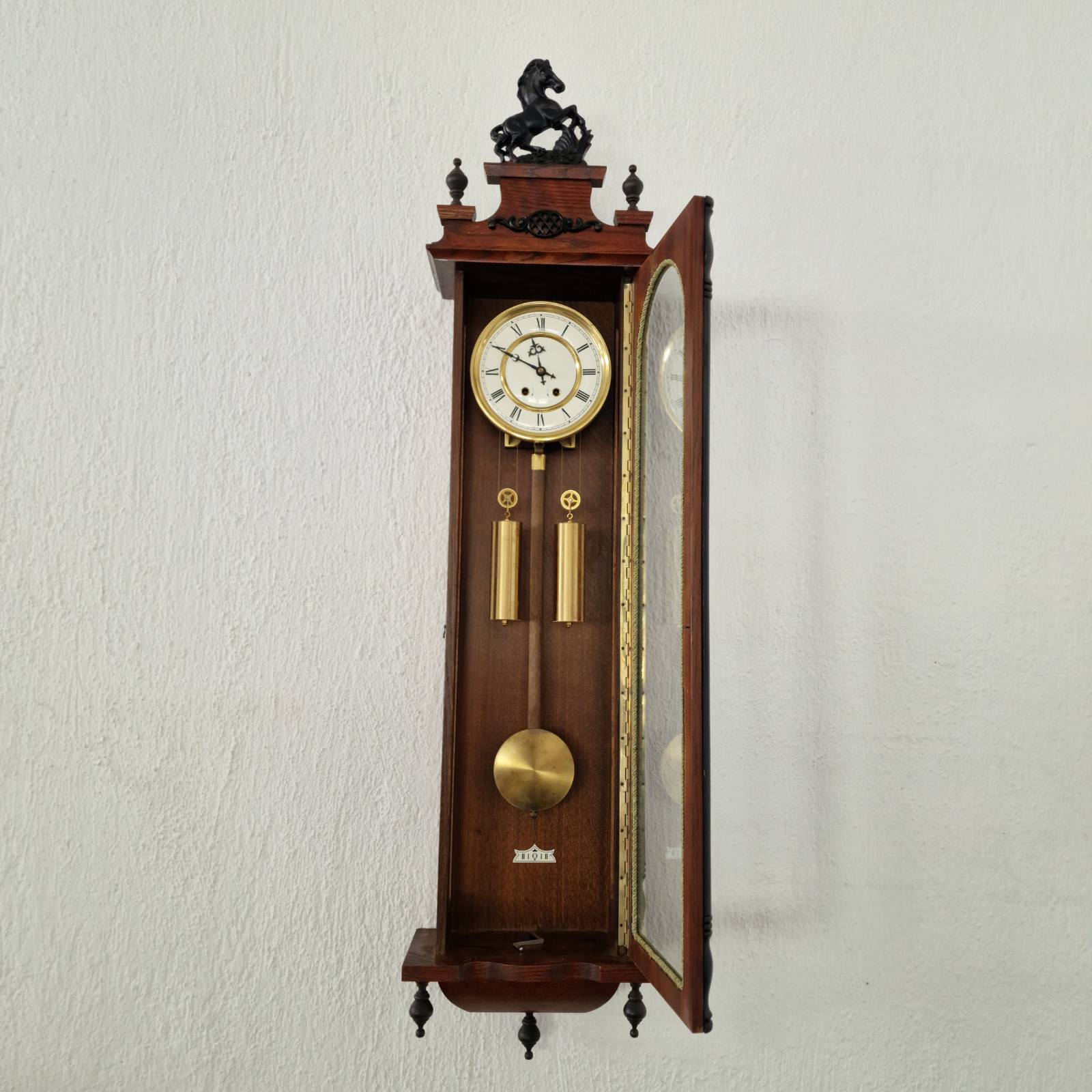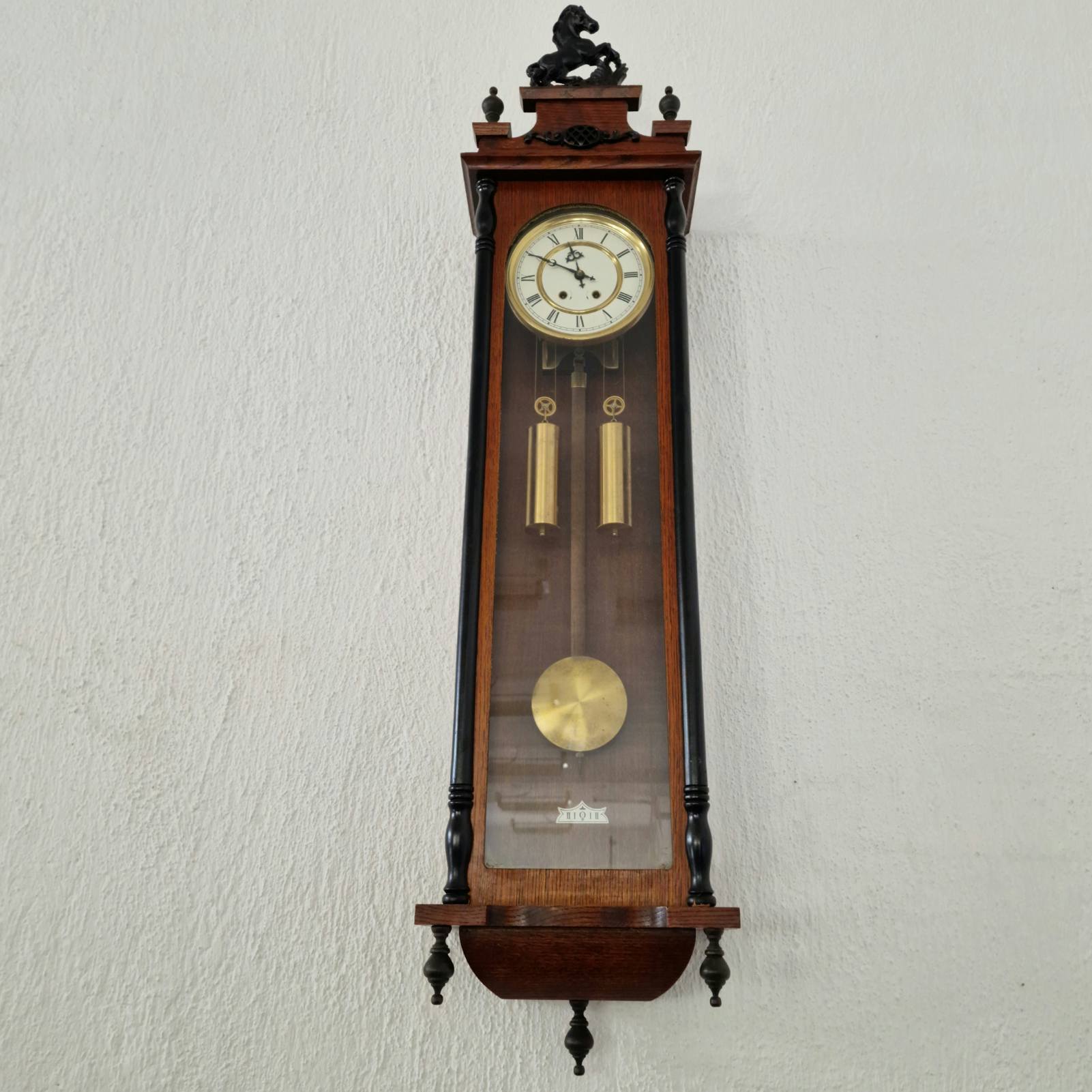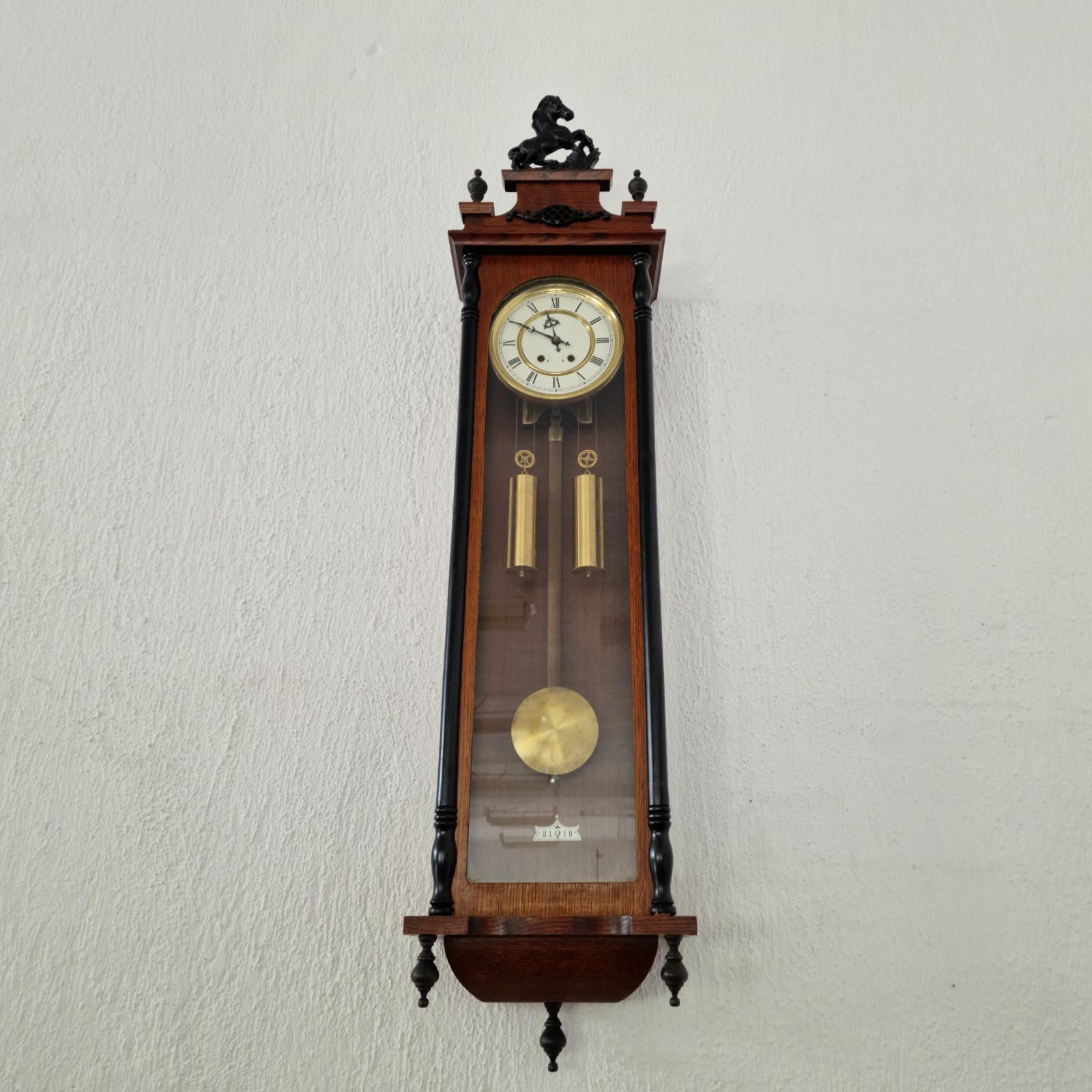 Изключително изискан античен стенен часовник, произведен във Франция, изработен ръчно от масивен дъб. Този часовник е впечатляващ пример за класическо часовникарско изкуство и естетика.