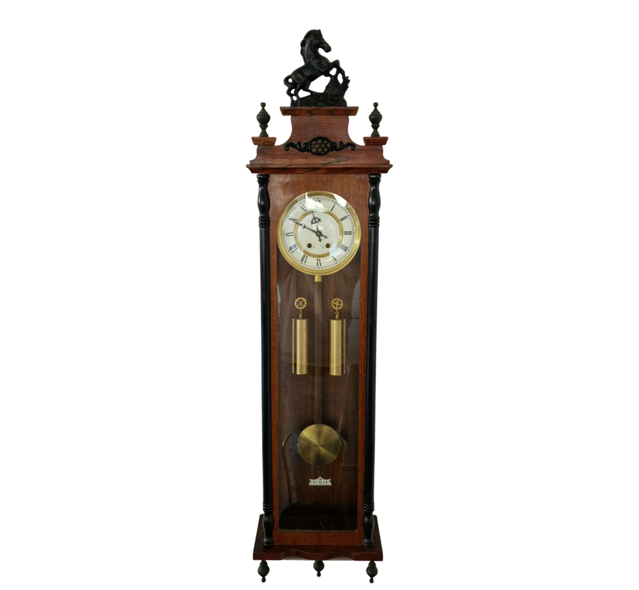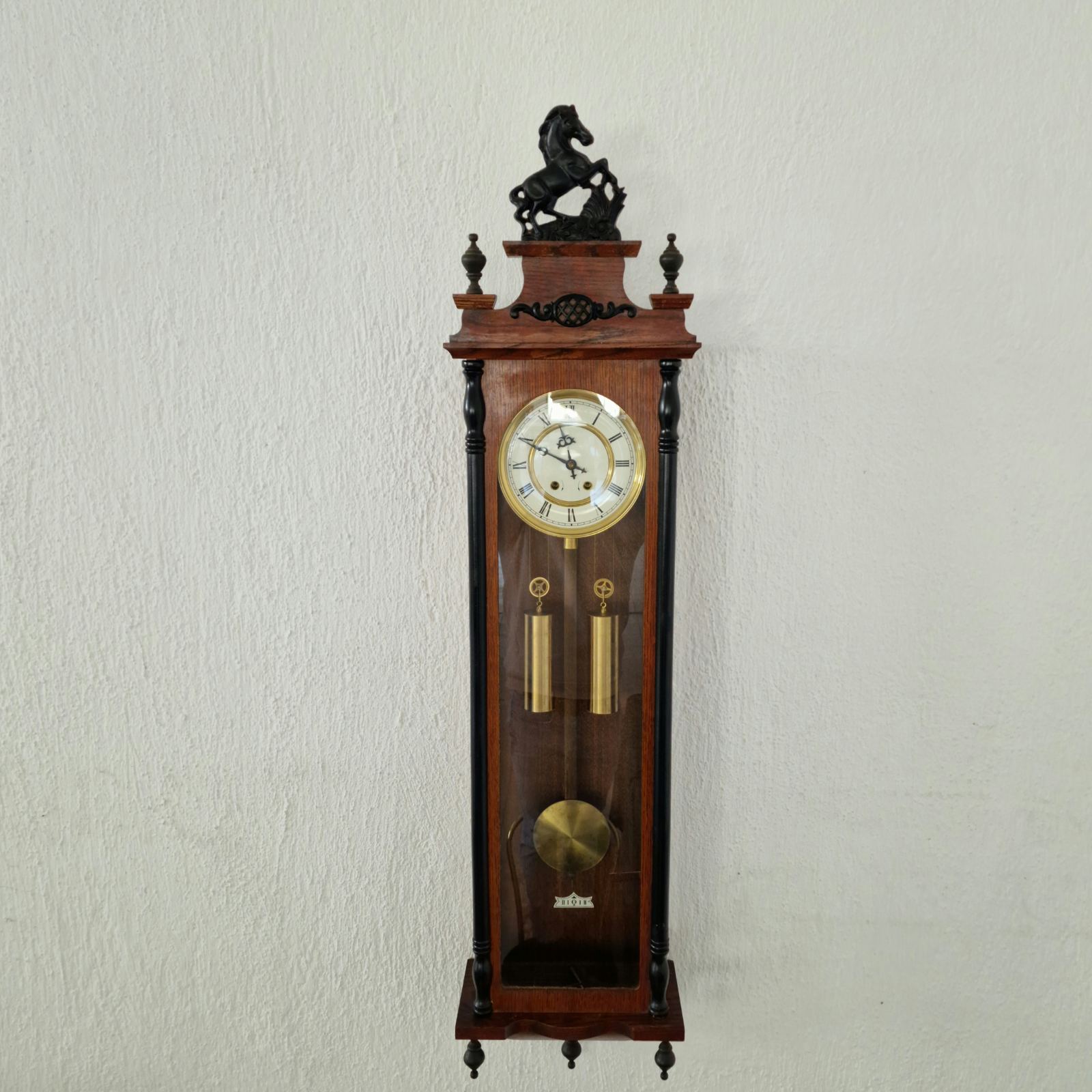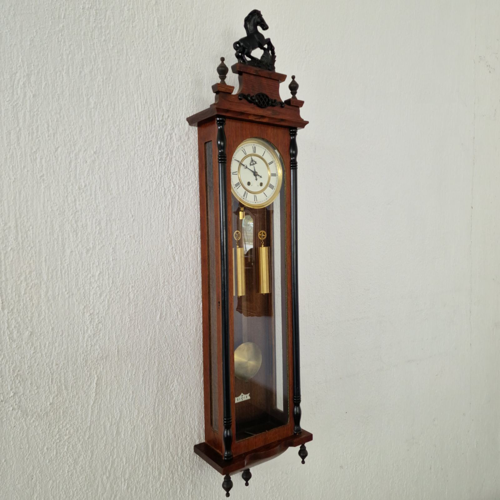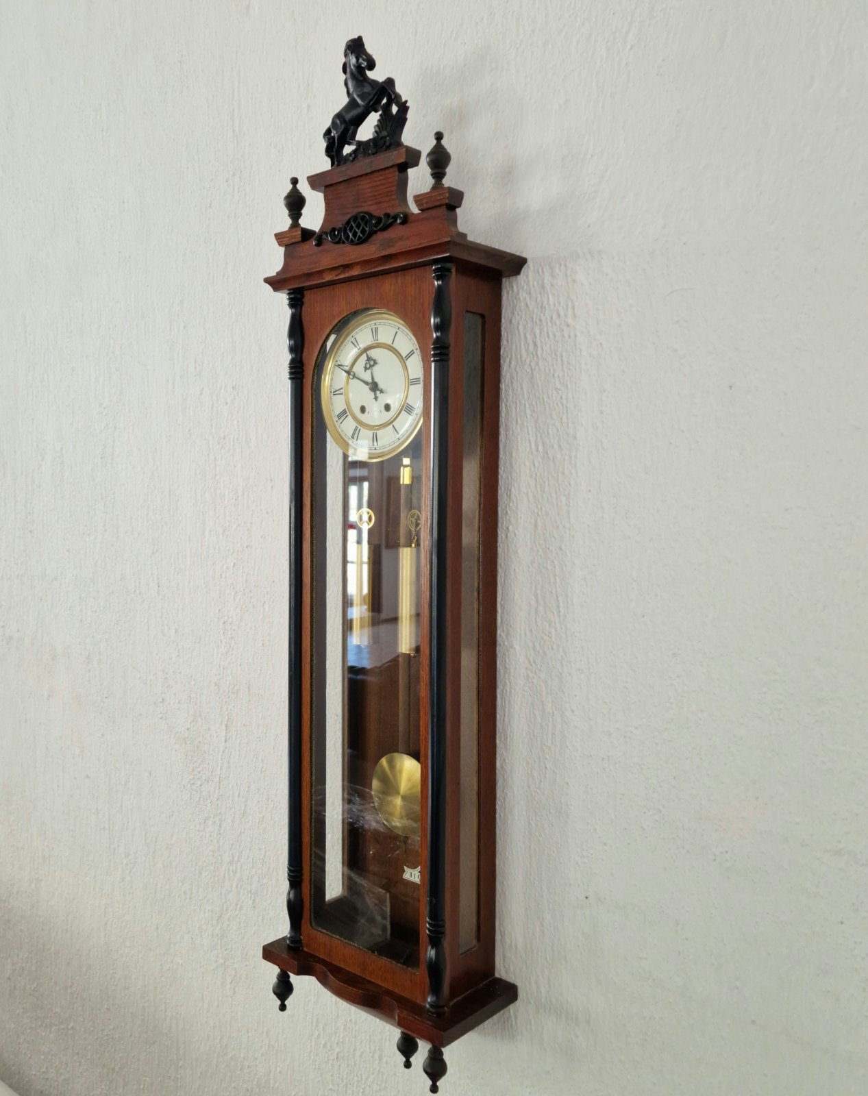 Изключително изискан античен стенен часовник, произведен във Франция, изработен ръчно от масивен дъб. Този часовник е впечатляващ пример за класическо часовникарско изкуство и естетика.