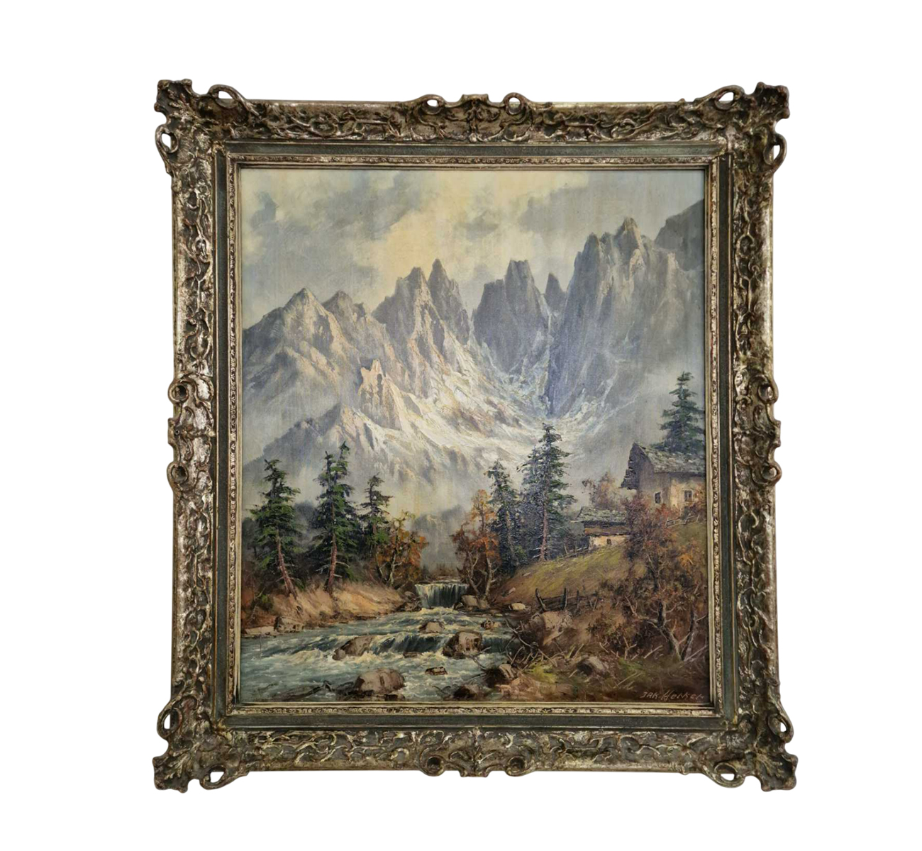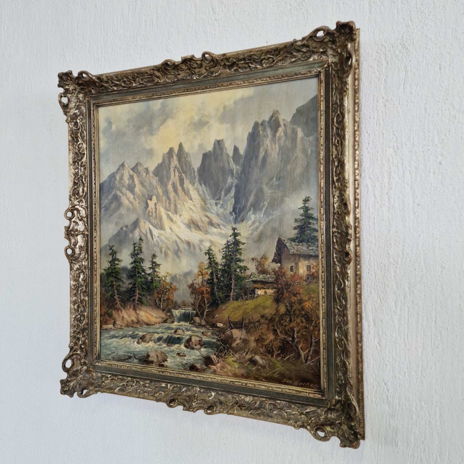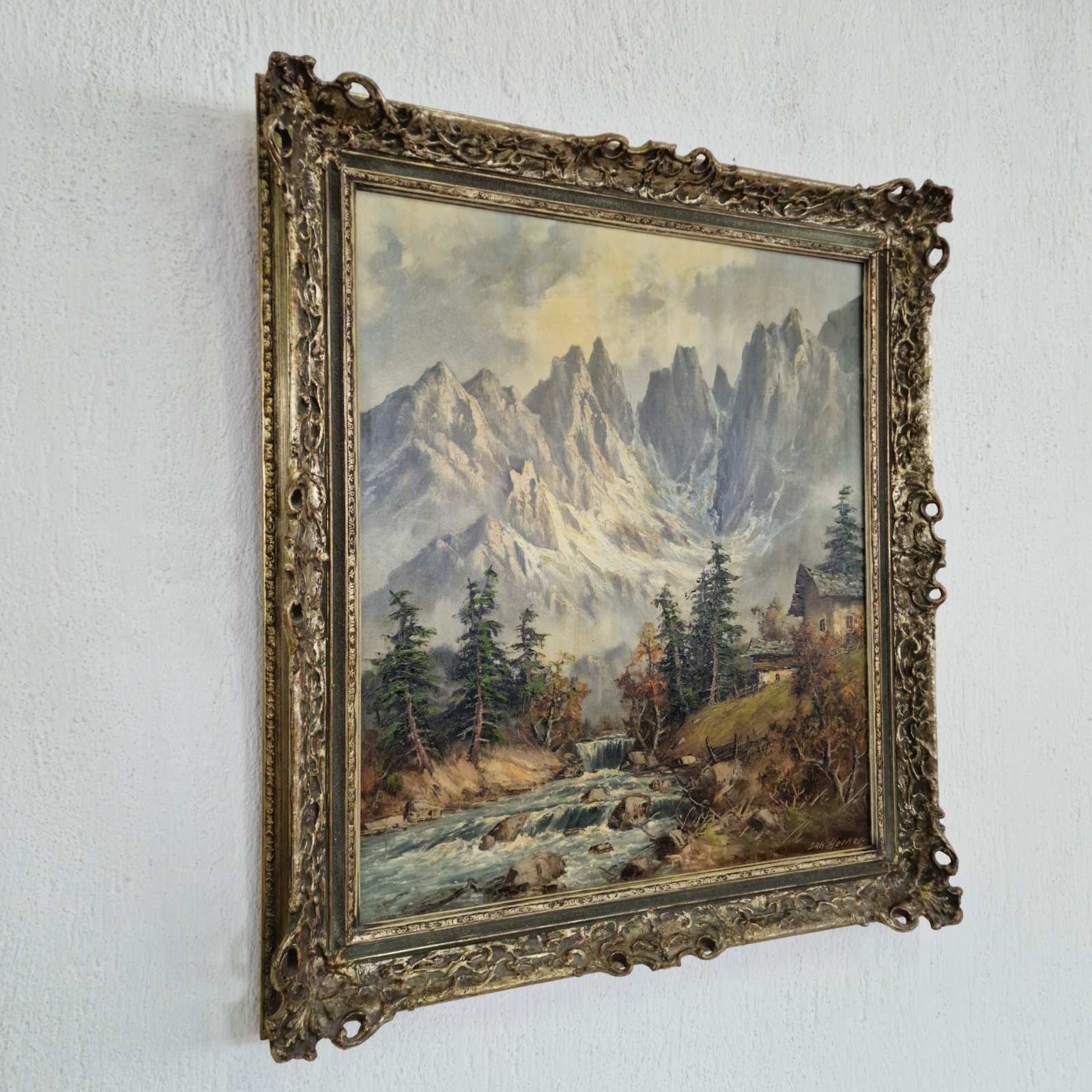 Елегантна антична картина, изработена върху платно, представяща впечатляващ планински пейзаж с река, алпийска архитектура и драматичен планински релеф. Произведението е поставено в масивна, богато орнаментирана дървена рамка, която подчертава класическия характер и художествената стойност на картината.