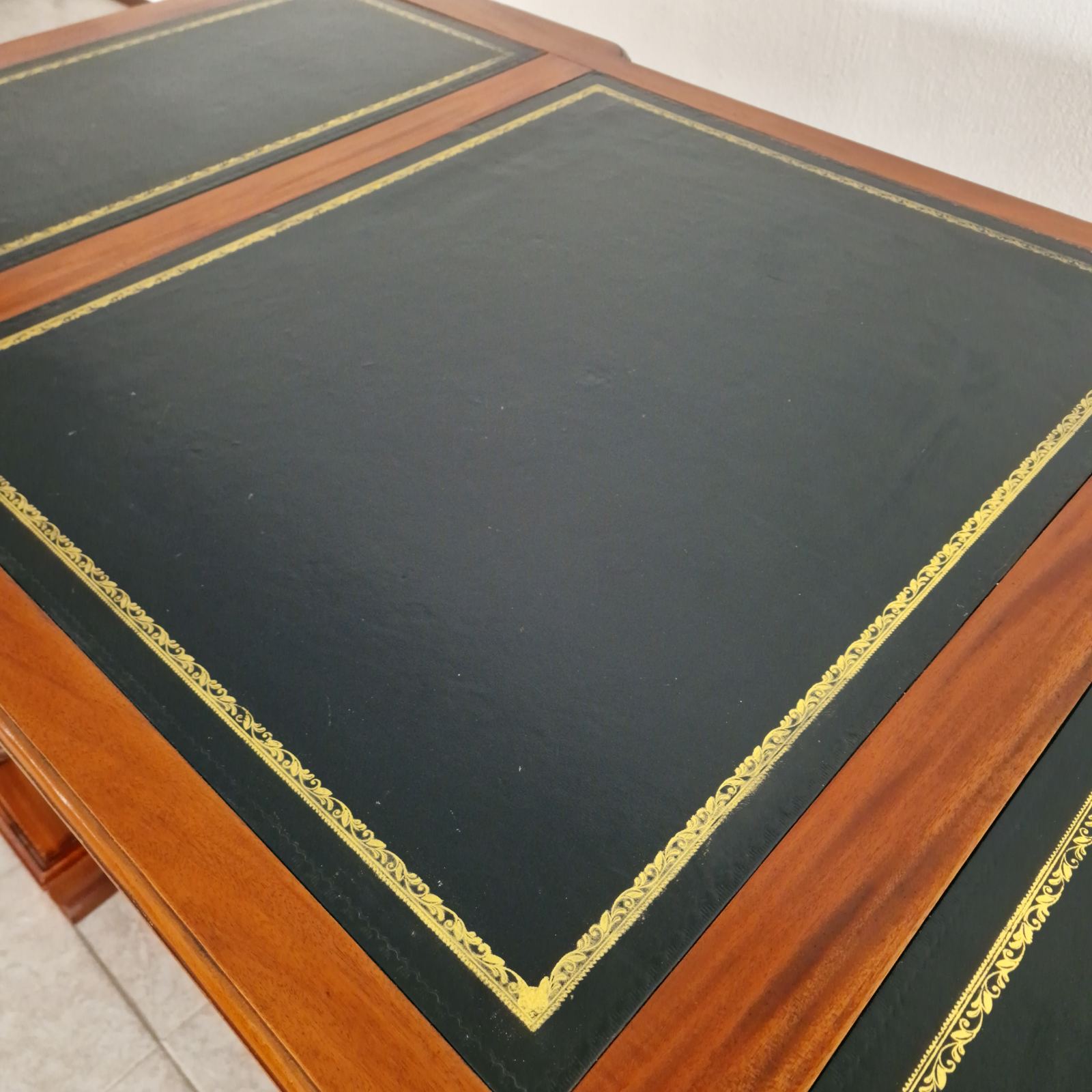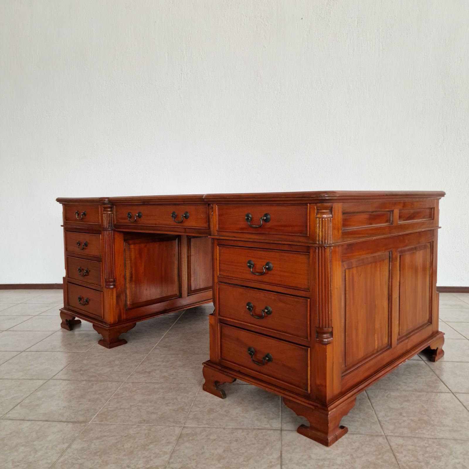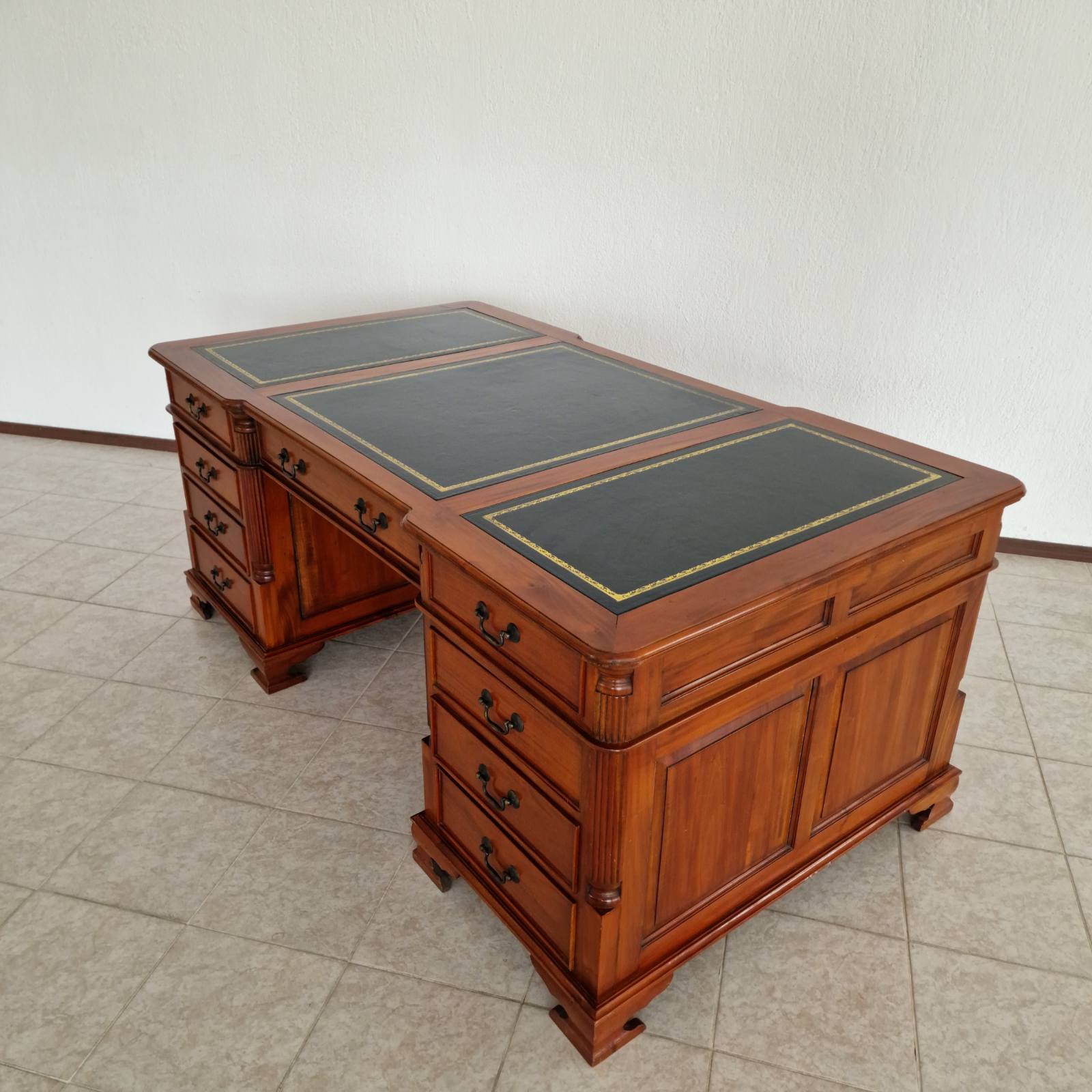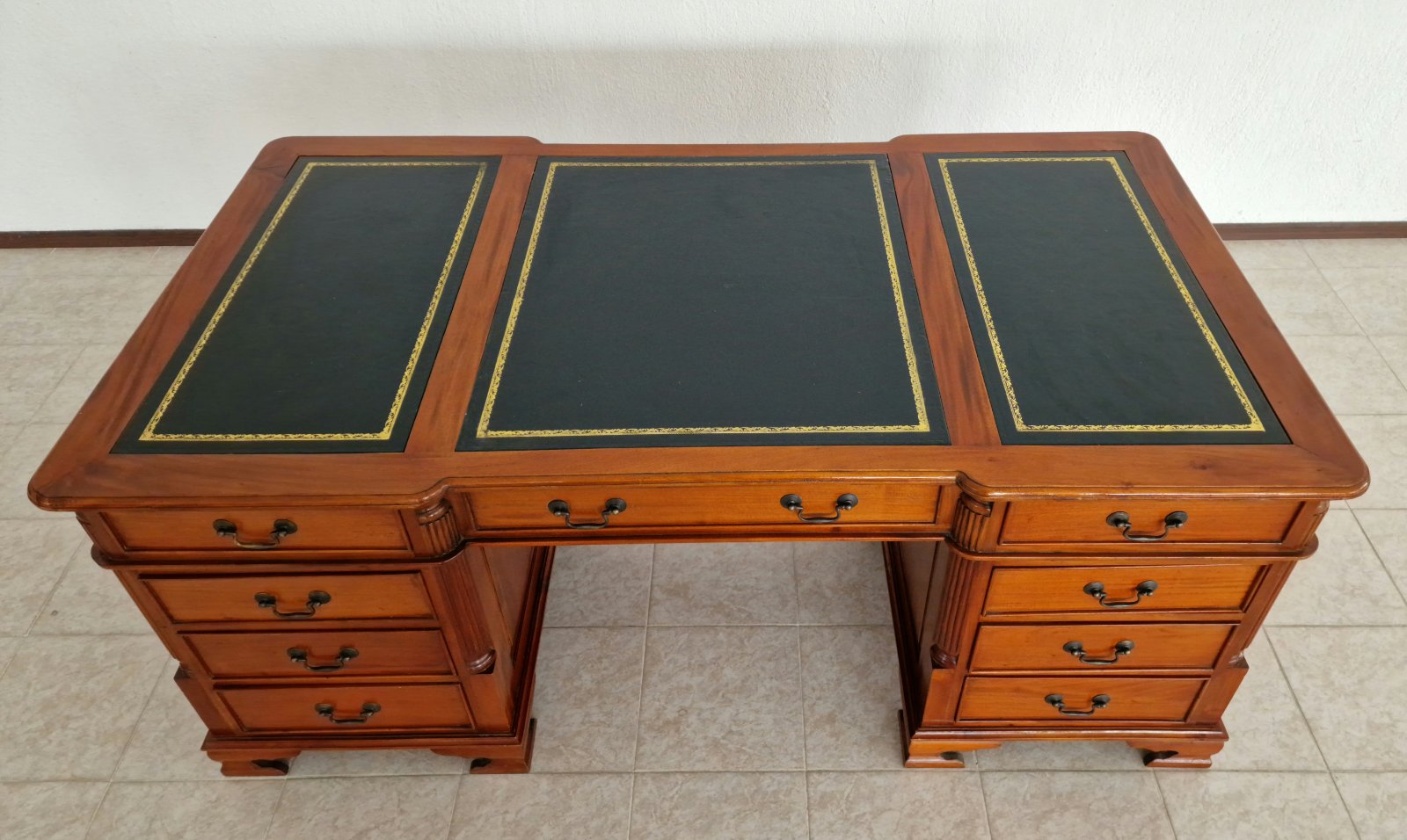 Бюрото е изцяло ръчно изработено от масивен махагон, отличаващ се с дълбок топъл цвят и изящна дърворезба. Плотът е покрит с висококачествена естествена телешка кожа в тъмнозелен нюанс, обшита с декоративен кант, който подчертава класическия характер на модела. Конструкцията е двулицева, което позволява бюрото да бъде поставено свободно в пространството – детайл, който свидетелства за високото му качество и стил.