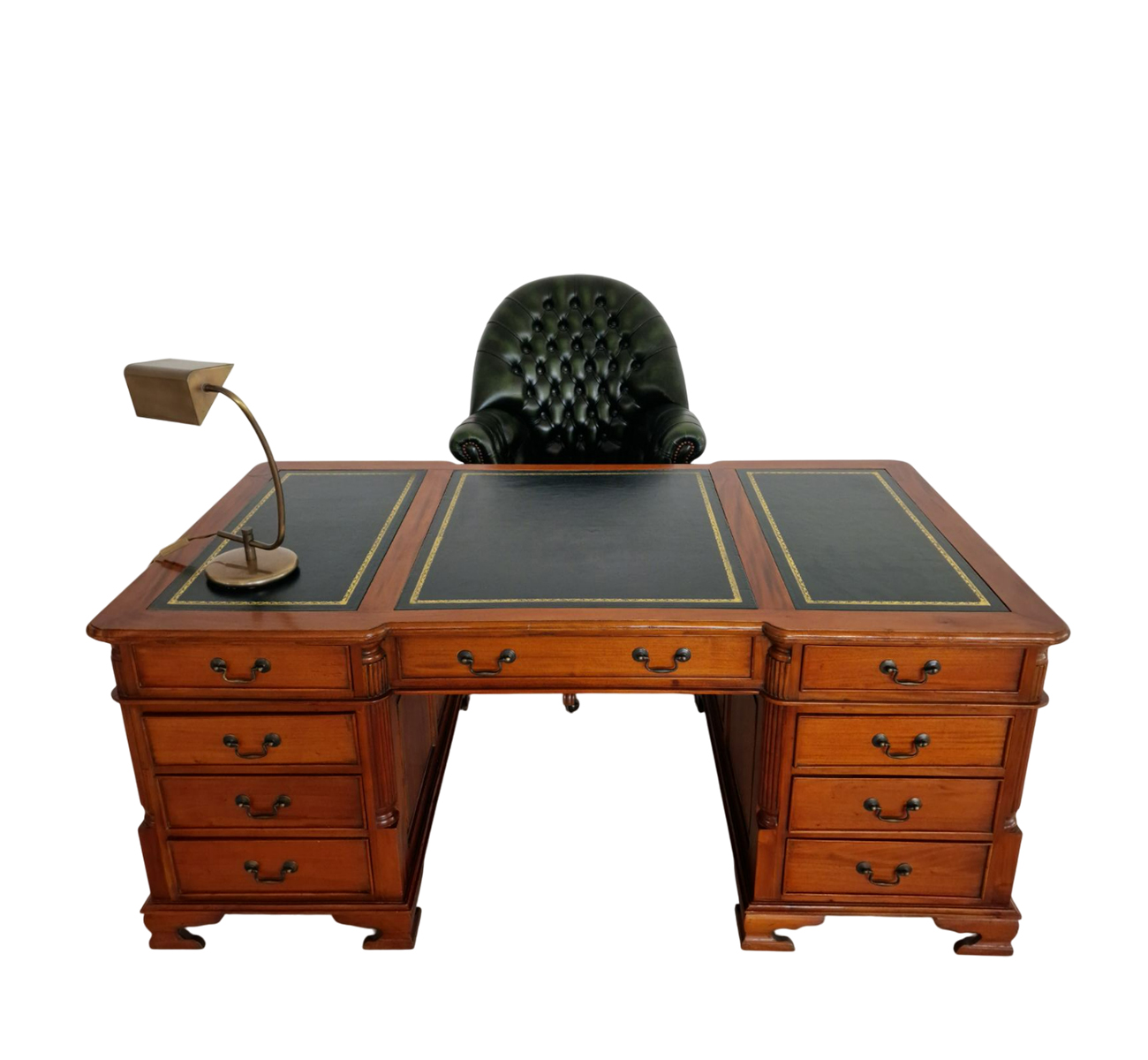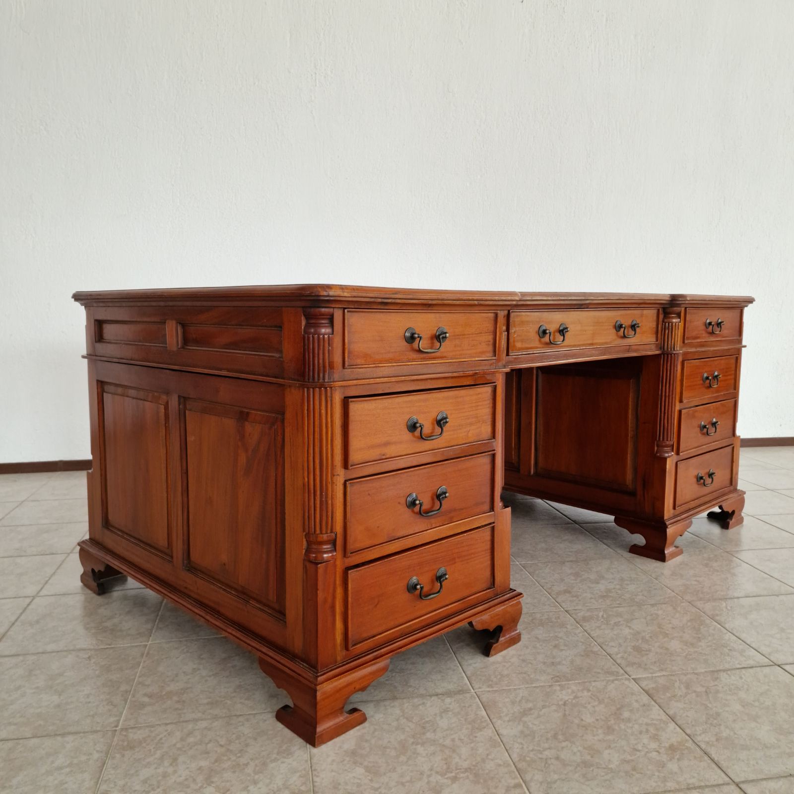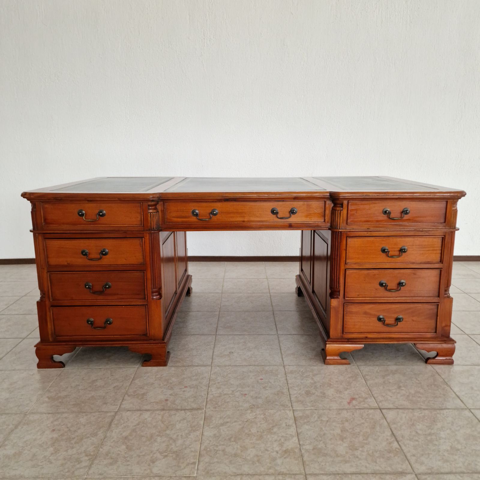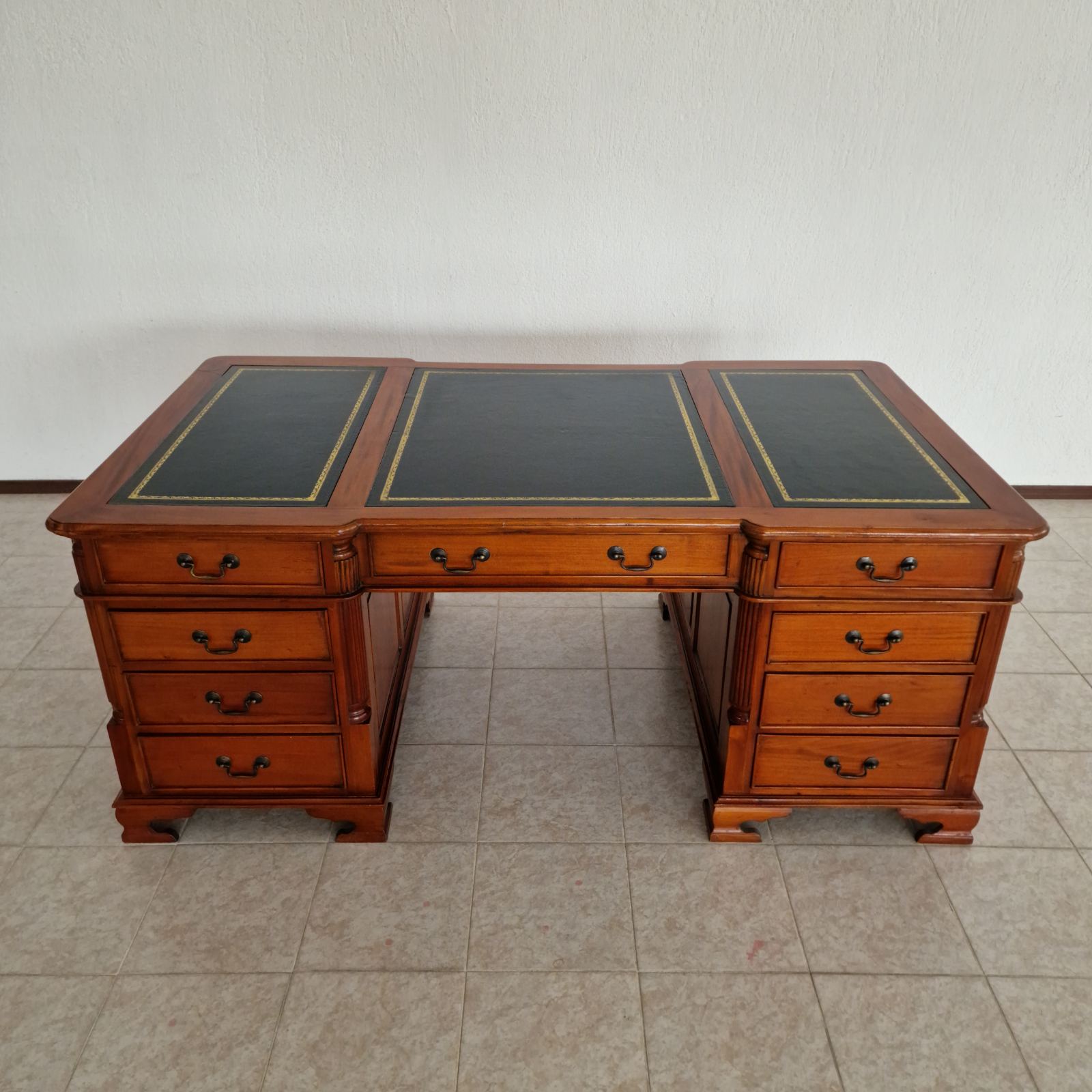 Бюрото е изцяло ръчно изработено от масивен махагон, отличаващ се с дълбок топъл цвят и изящна дърворезба. Плотът е покрит с висококачествена естествена телешка кожа в тъмнозелен нюанс, обшита с декоративен кант, който подчертава класическия характер на модела. Конструкцията е двулицева, което позволява бюрото да бъде поставено свободно в пространството – детайл, който свидетелства за високото му качество и стил.