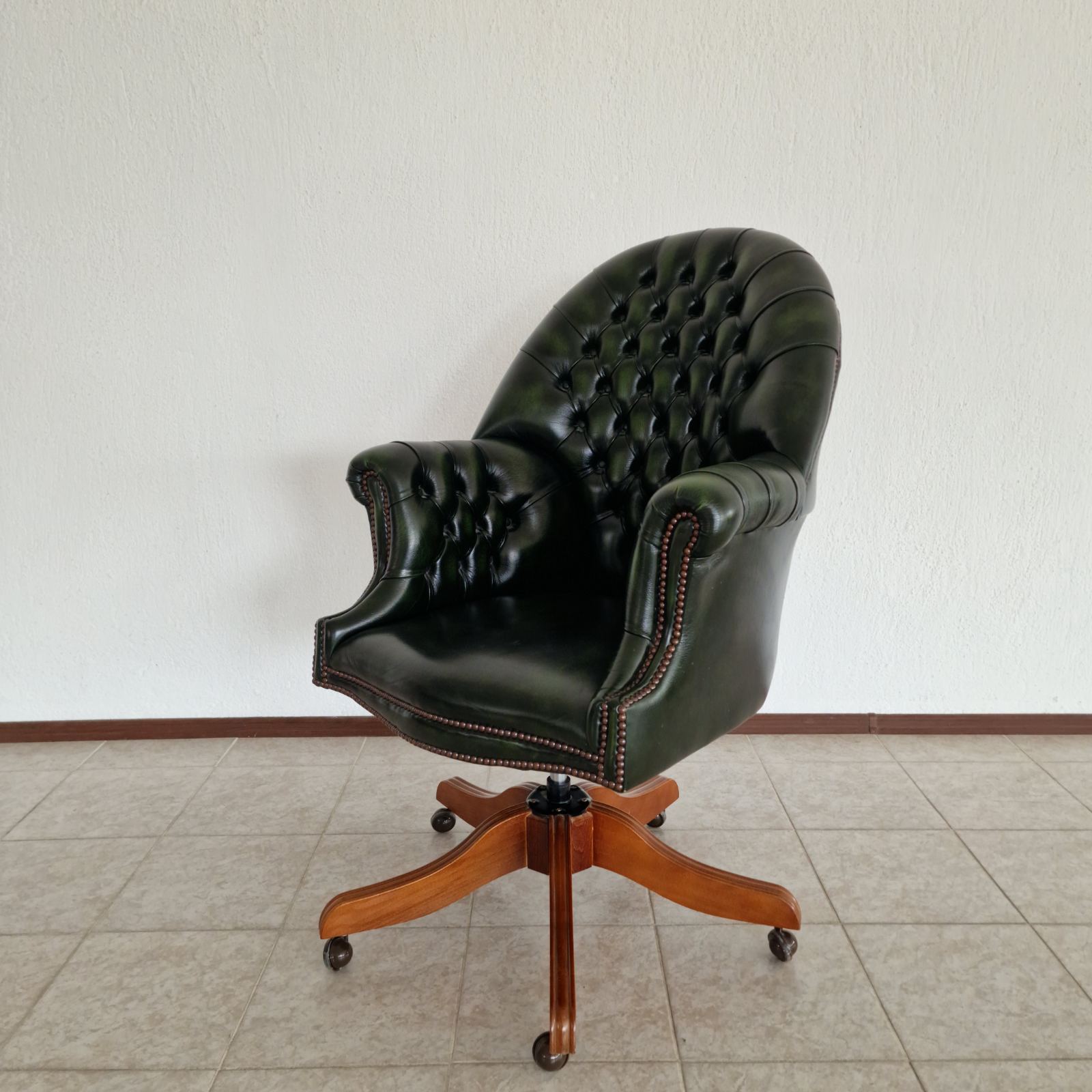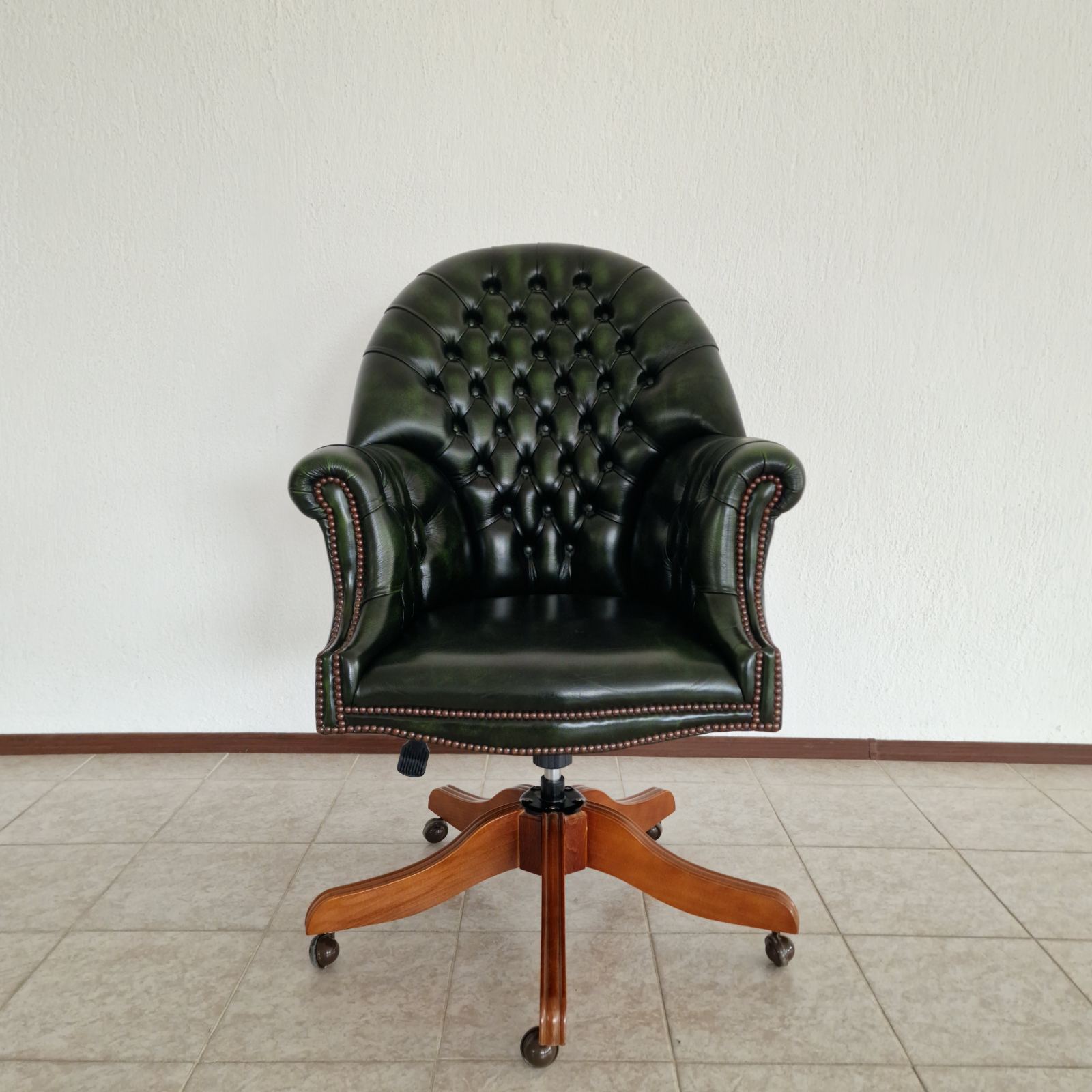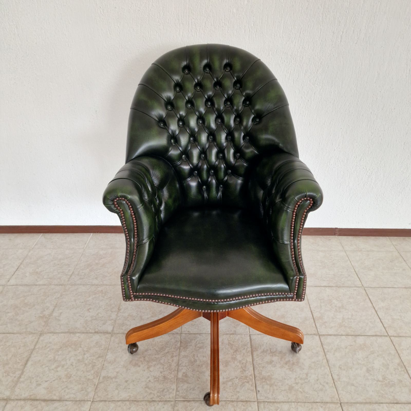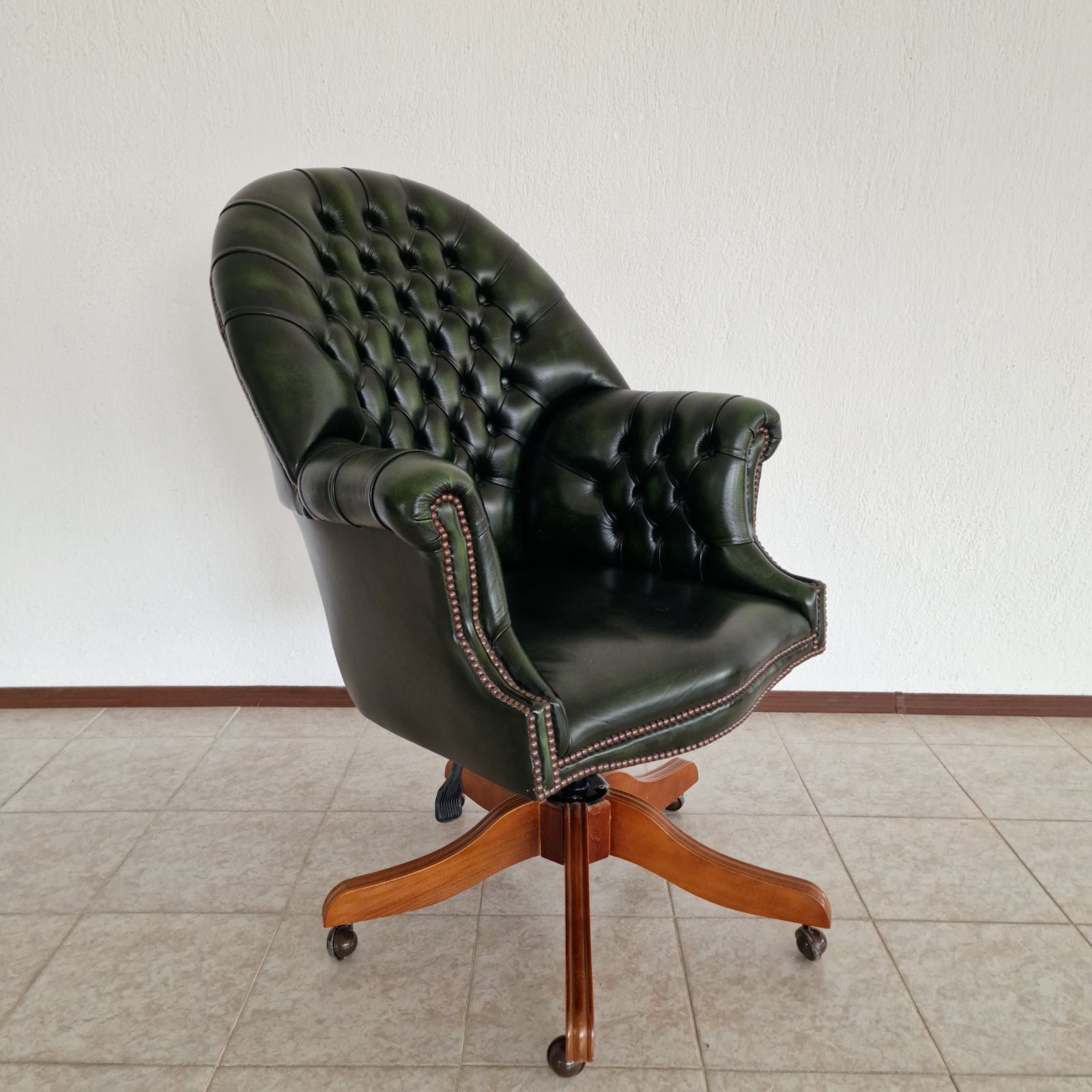 Столът Chesterfield е изработен в същия дух на елегантност и комфорт. Тапициран е с естествена телешка кожа, съчетана с масивна дървена основа от махагон. Разполага с регулируема височина и люлеещ механизъм, осигуряващи максимално удобство при работа или почивка.