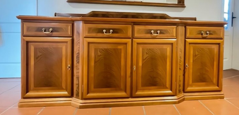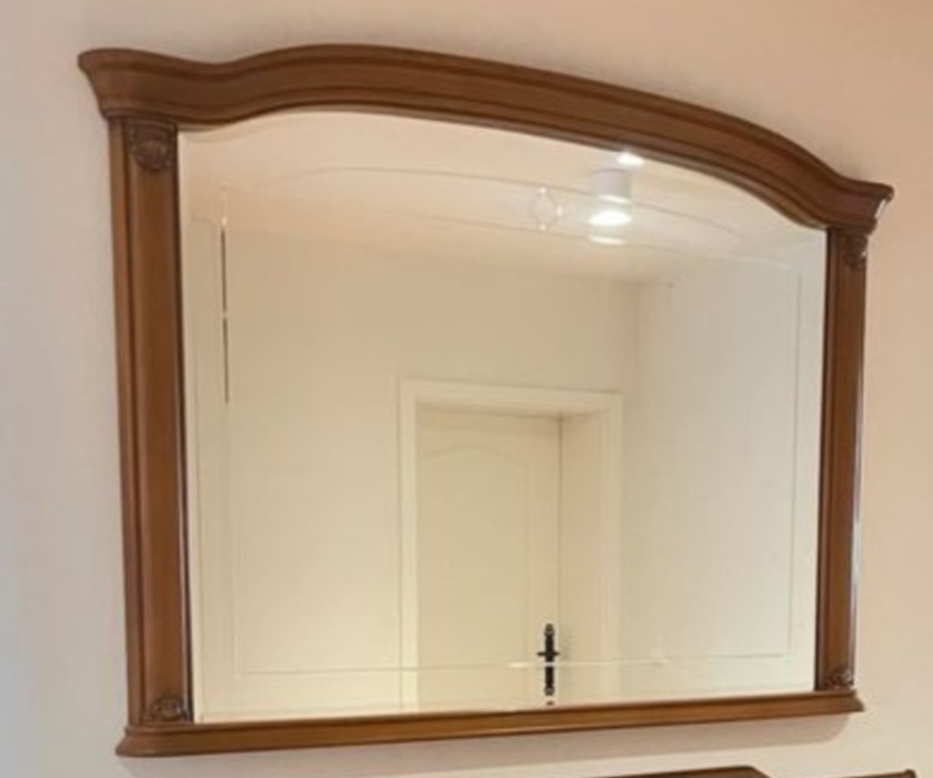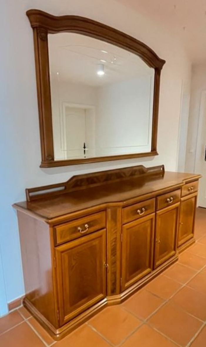 Елегантен и стилен френски шкаф-комод с голямо огледало, изработен от масивен орех. Впечатлява с класически дизайн, красив фладер на дървото и прецизна изработка, характерна за френските мебели.