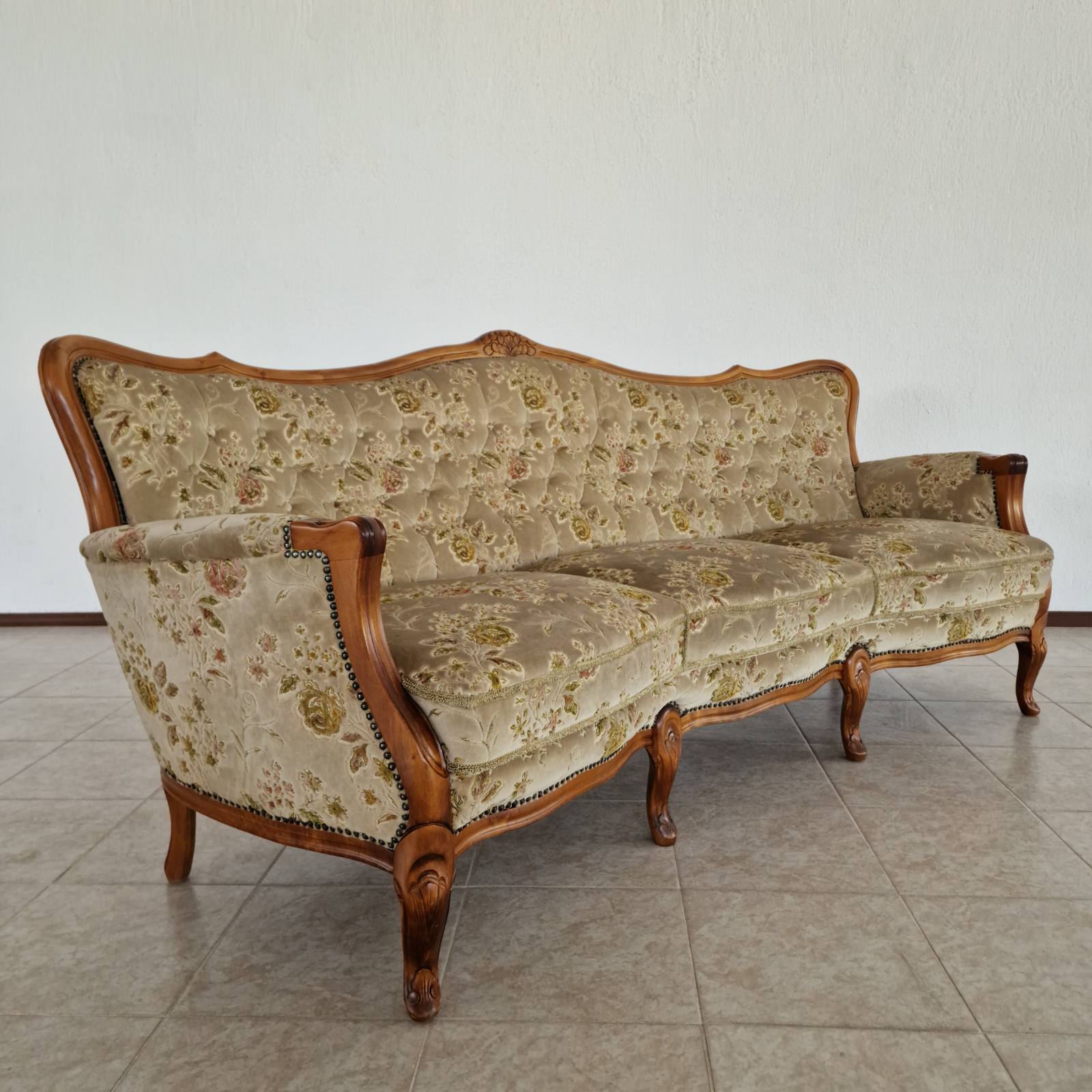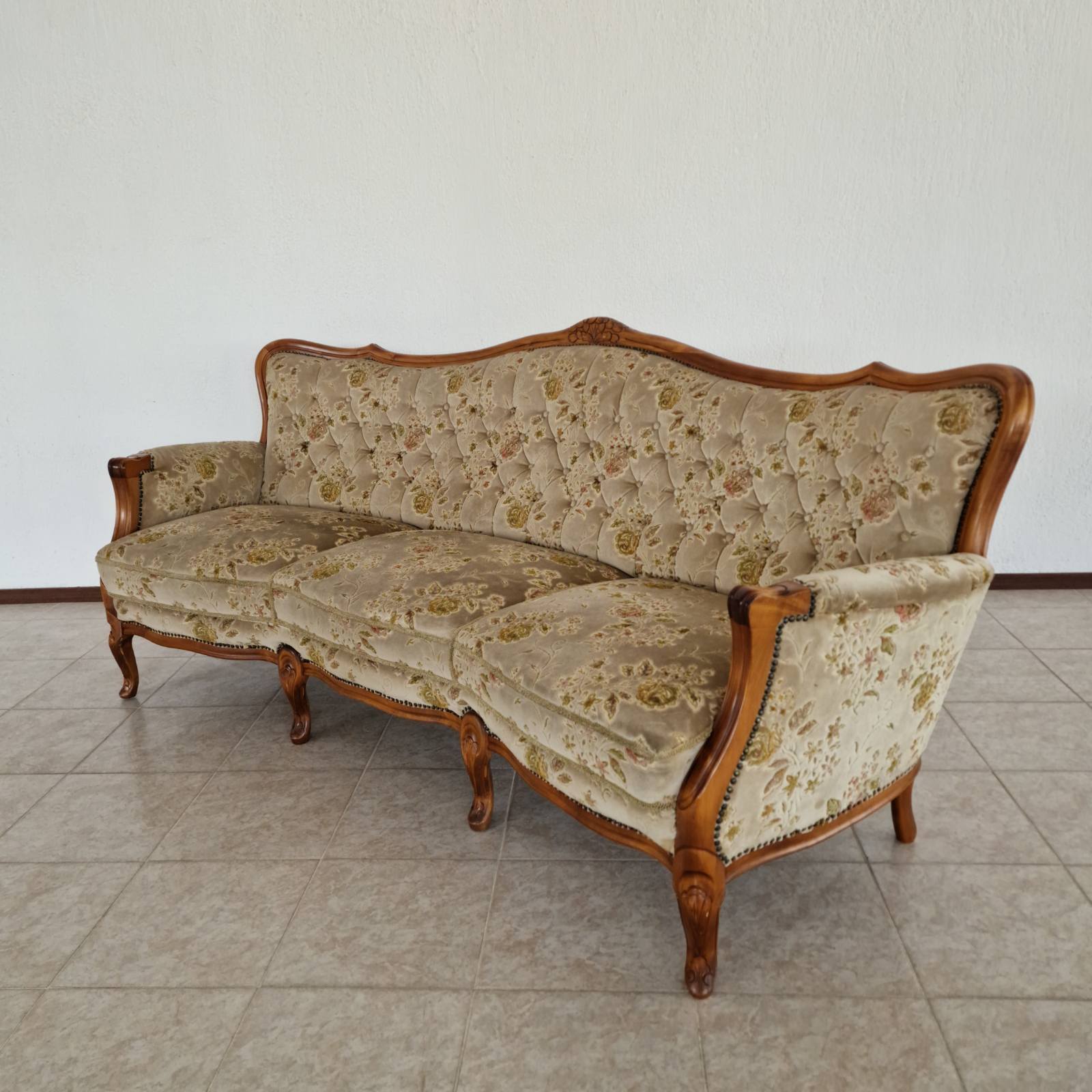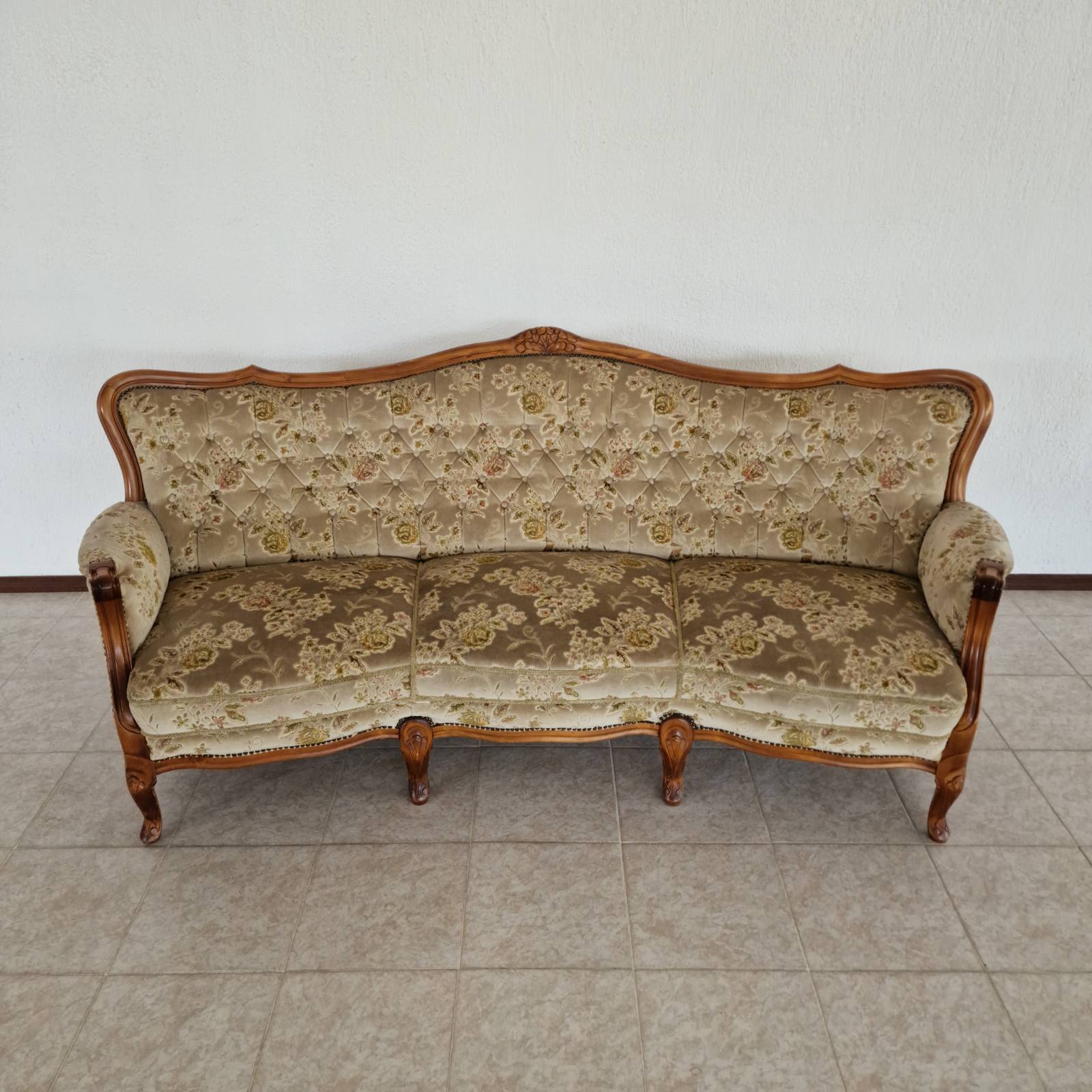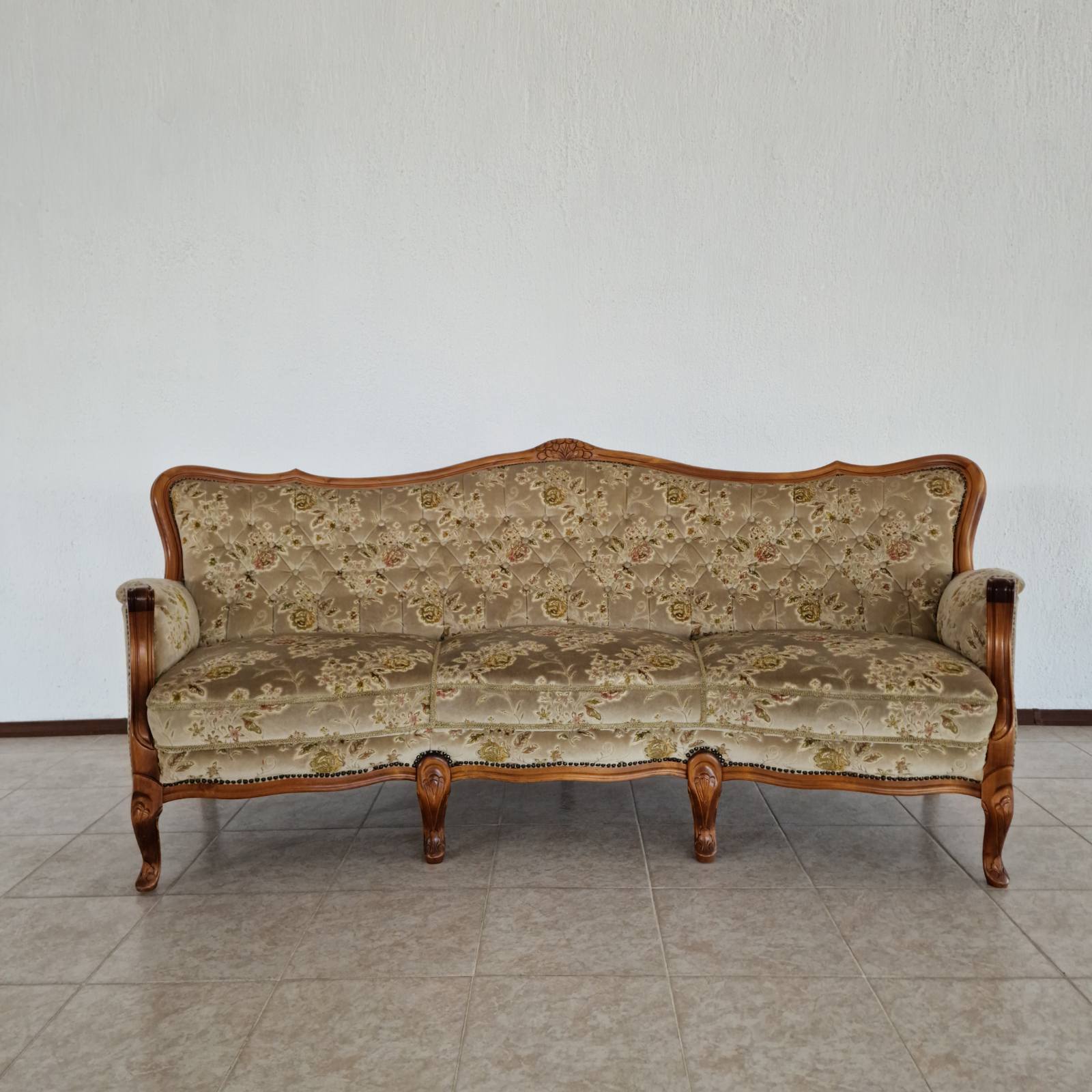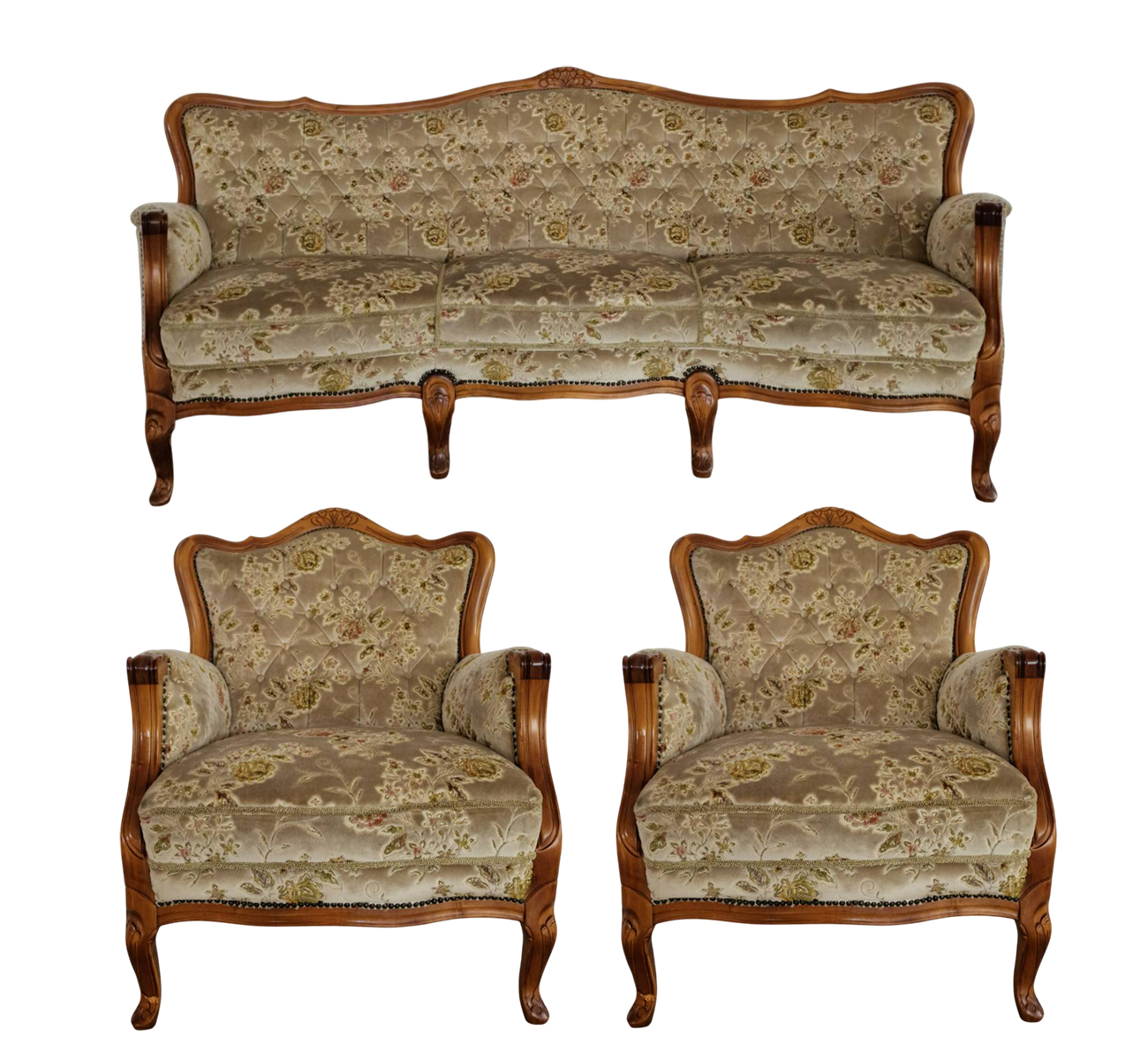 Елегантна холна гарнитура в стил Chippendale, изработена от масивен орех с изключително фина английска дърворезба. Комплектът включва триместен диван и два фотьойла, отличаващи се с перфектно състояние и безупречна дамаска.