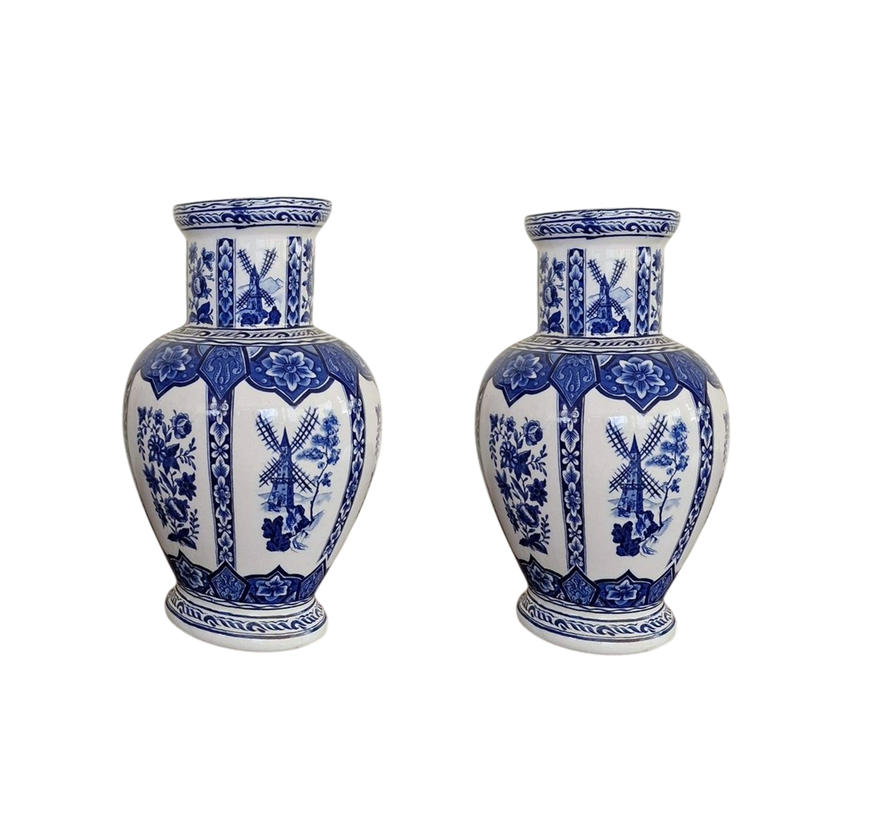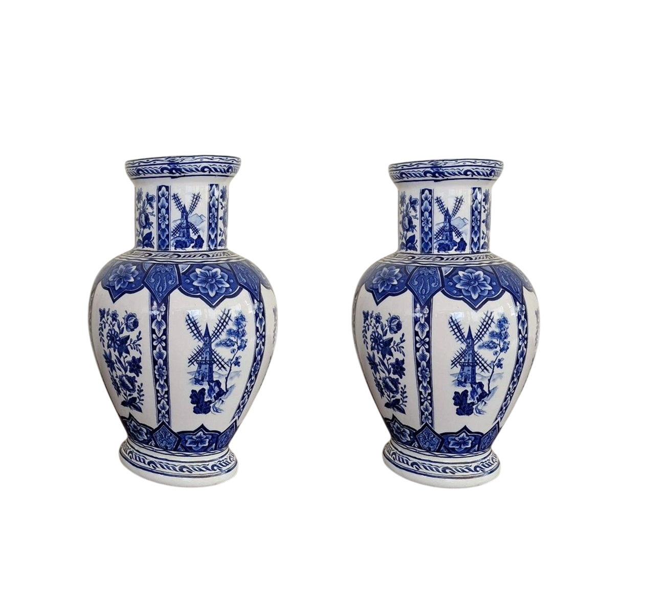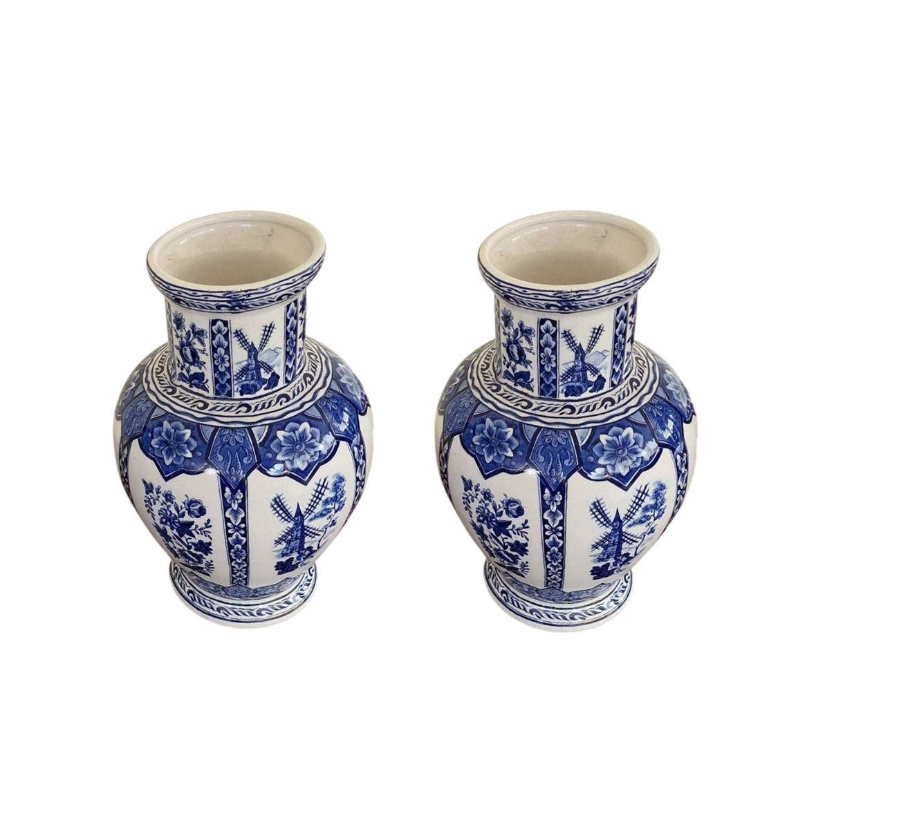 Тези красиви порцеланови вази в бял и син цвят съчетават елегантност и традиция. Всеки детайл от дизайна е изпипан с внимание – флоралните елементи и нежната вятърна мелница придават на вазите уникален, живописен вид, вдъхновен от природата и традиционното европейско изкуство. Тези вази ще бъдат великолепно допълнение към всяка обстановка, добавяйки стил и хармония в интериора. Подходящи за декорация на маса, витрина или специално място, където могат да изпъкнат с красотата си.