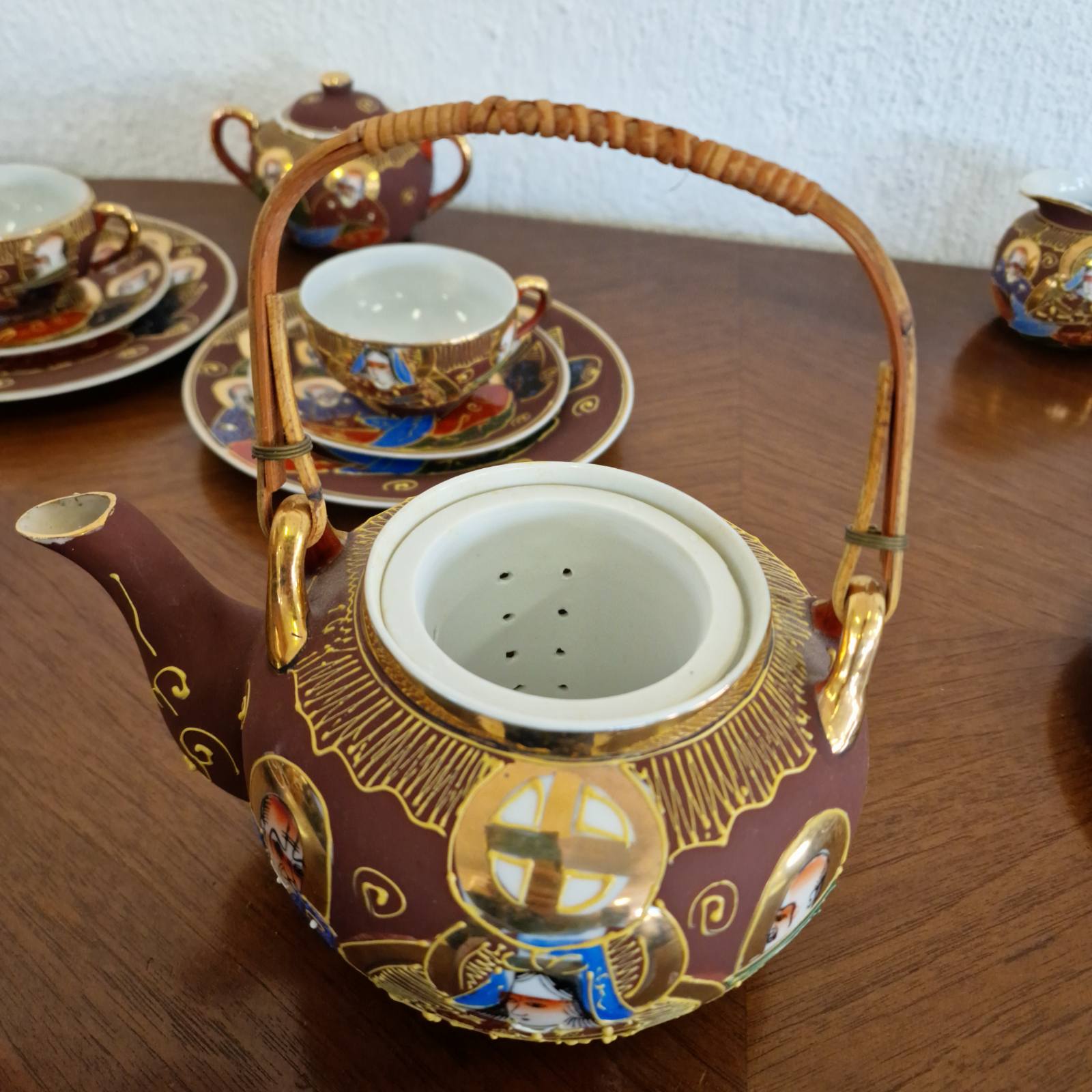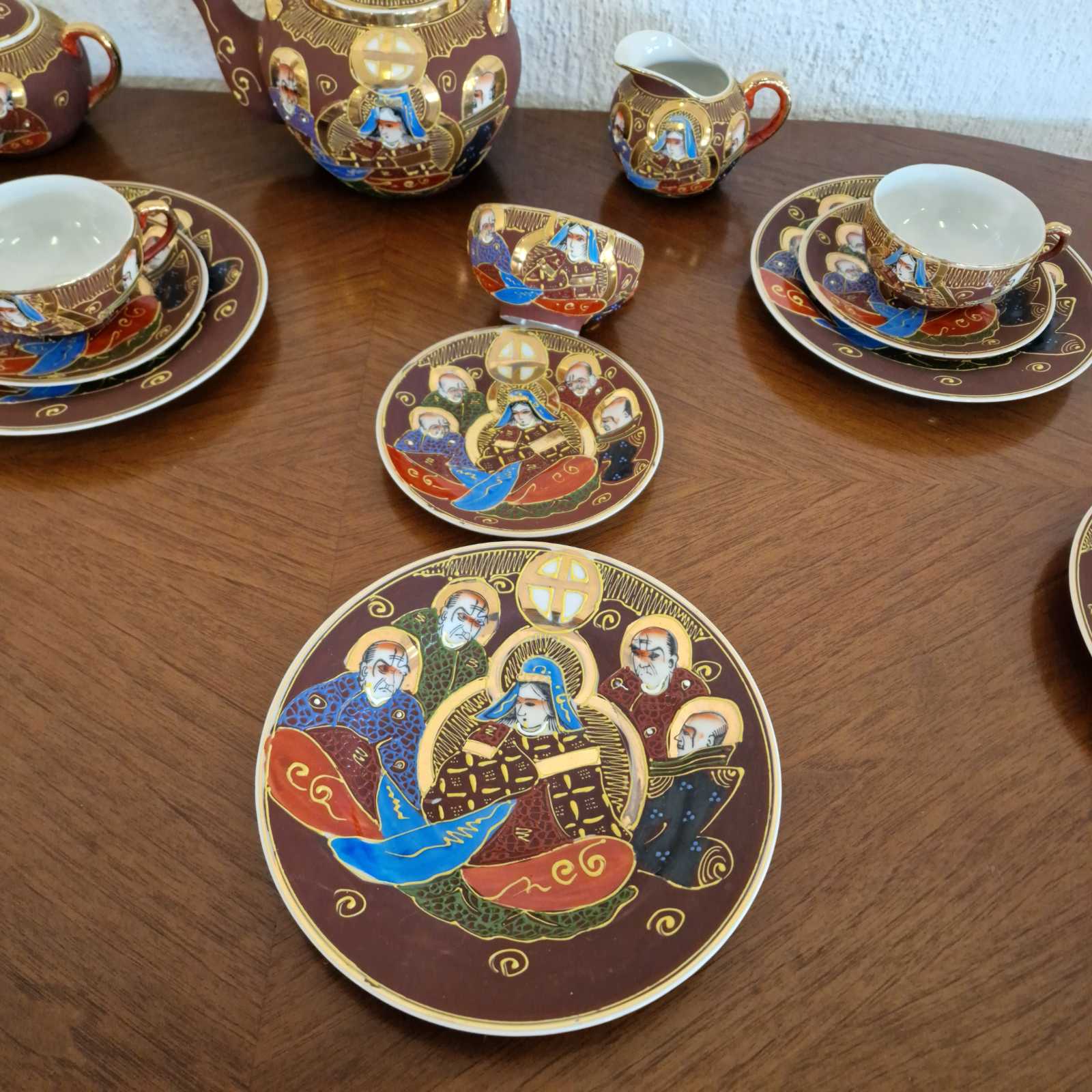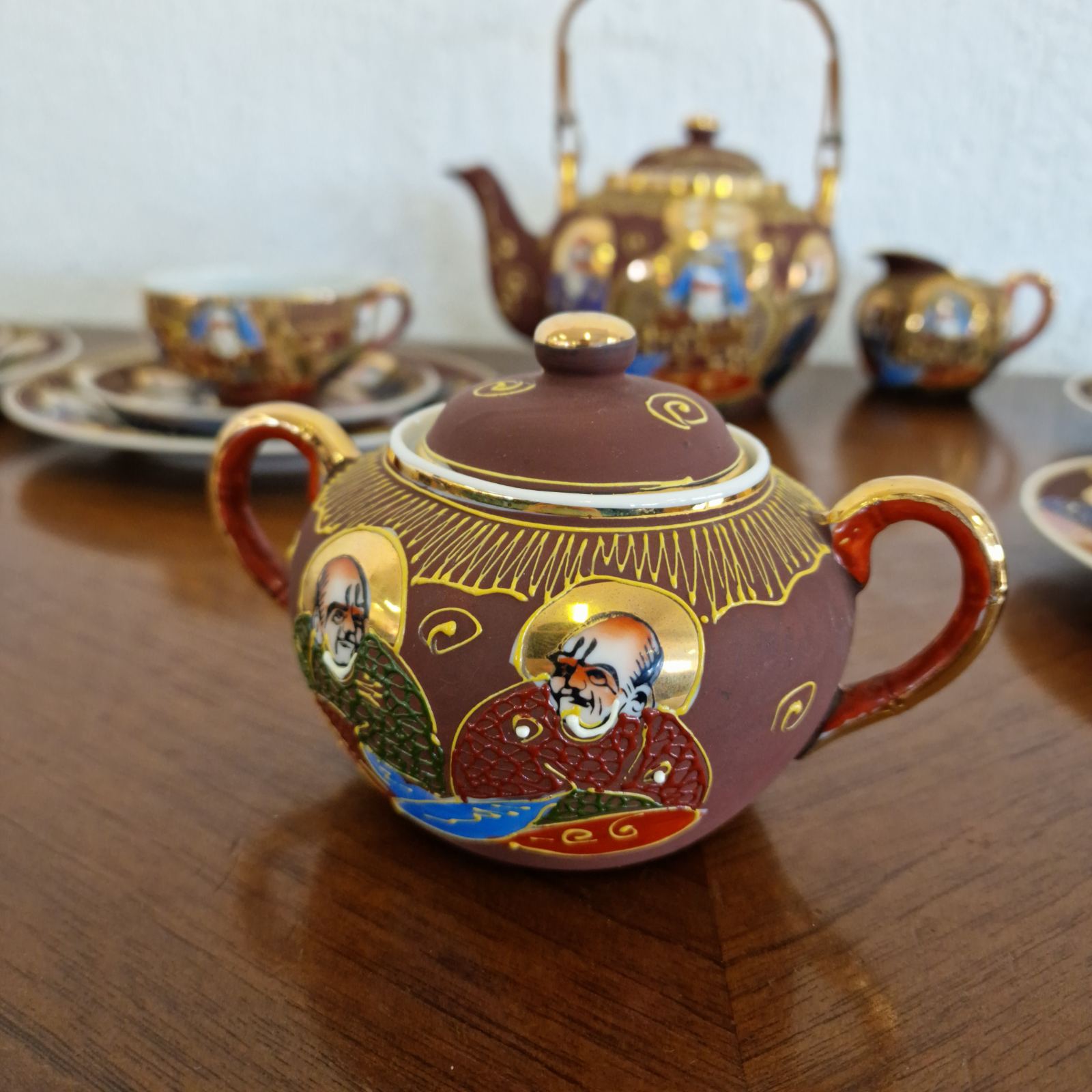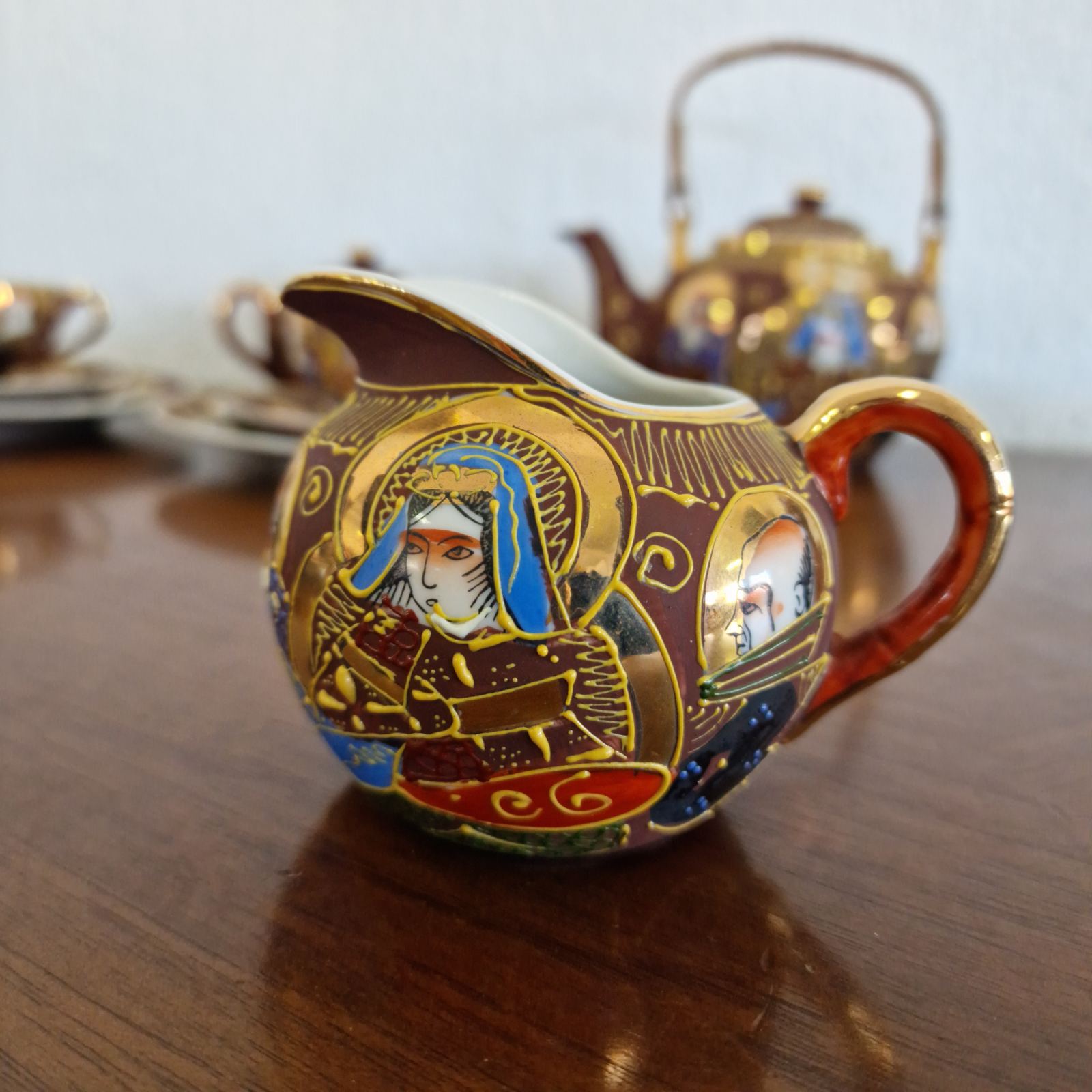 Изключително красив комплект за чай от фин костен порцелан в стил Satsuma, впечатляващ с богата ръчна декорация, ориенталски фигурални сцени и златна орнаментика. Комплектът излъчва лукс и аристократичен чар и е създаден като декоративен и представителен сервиз.
