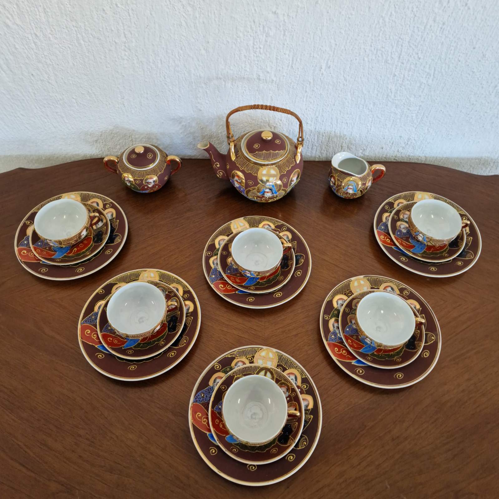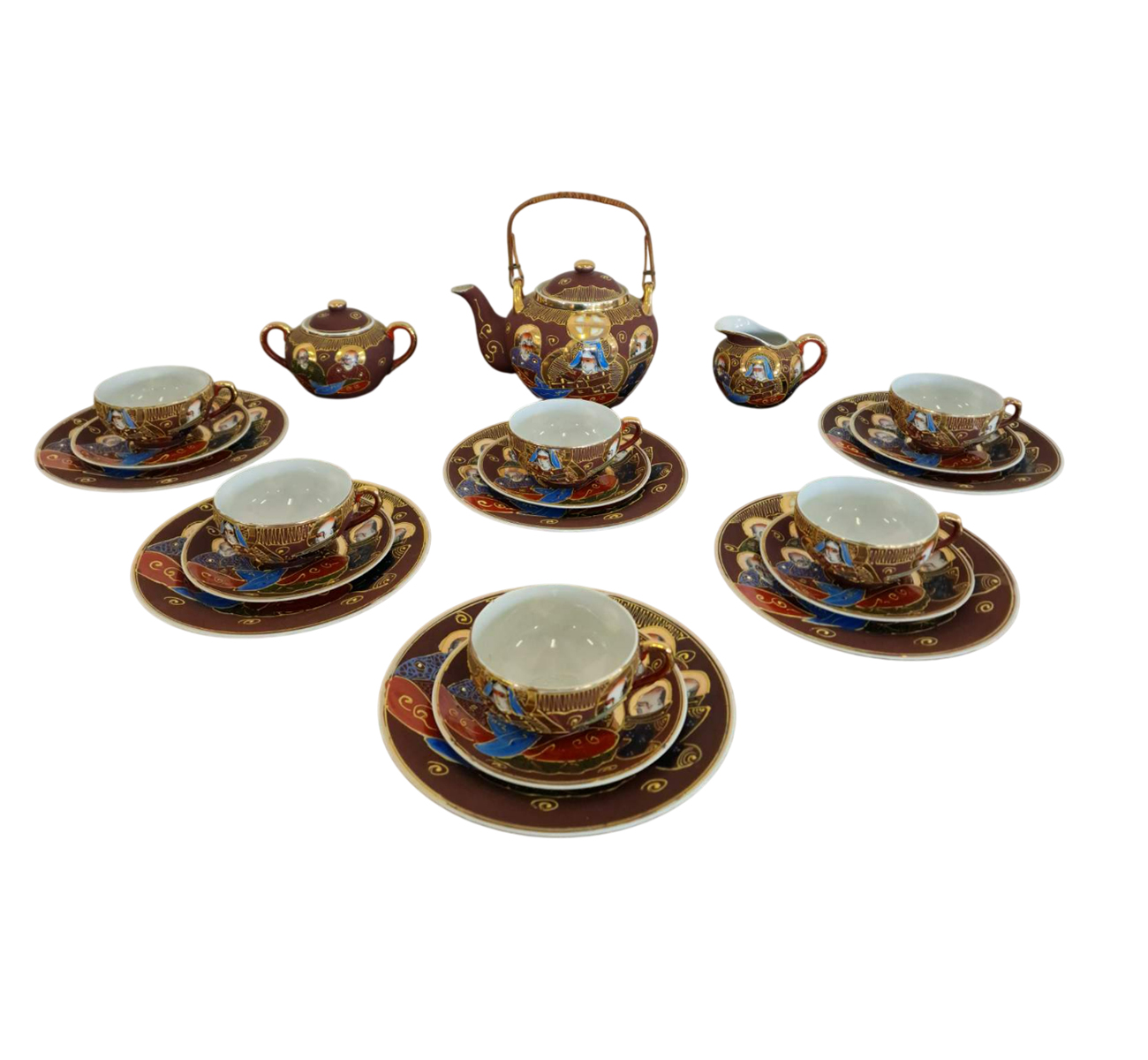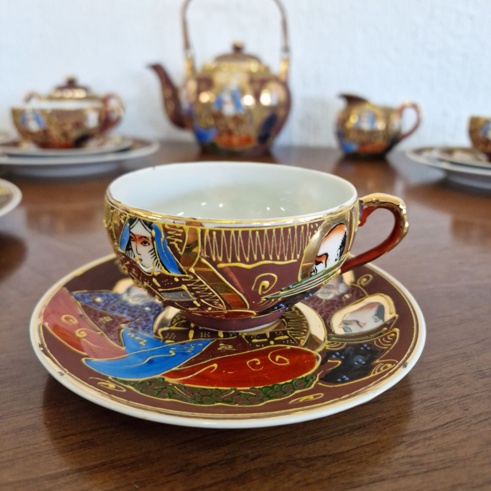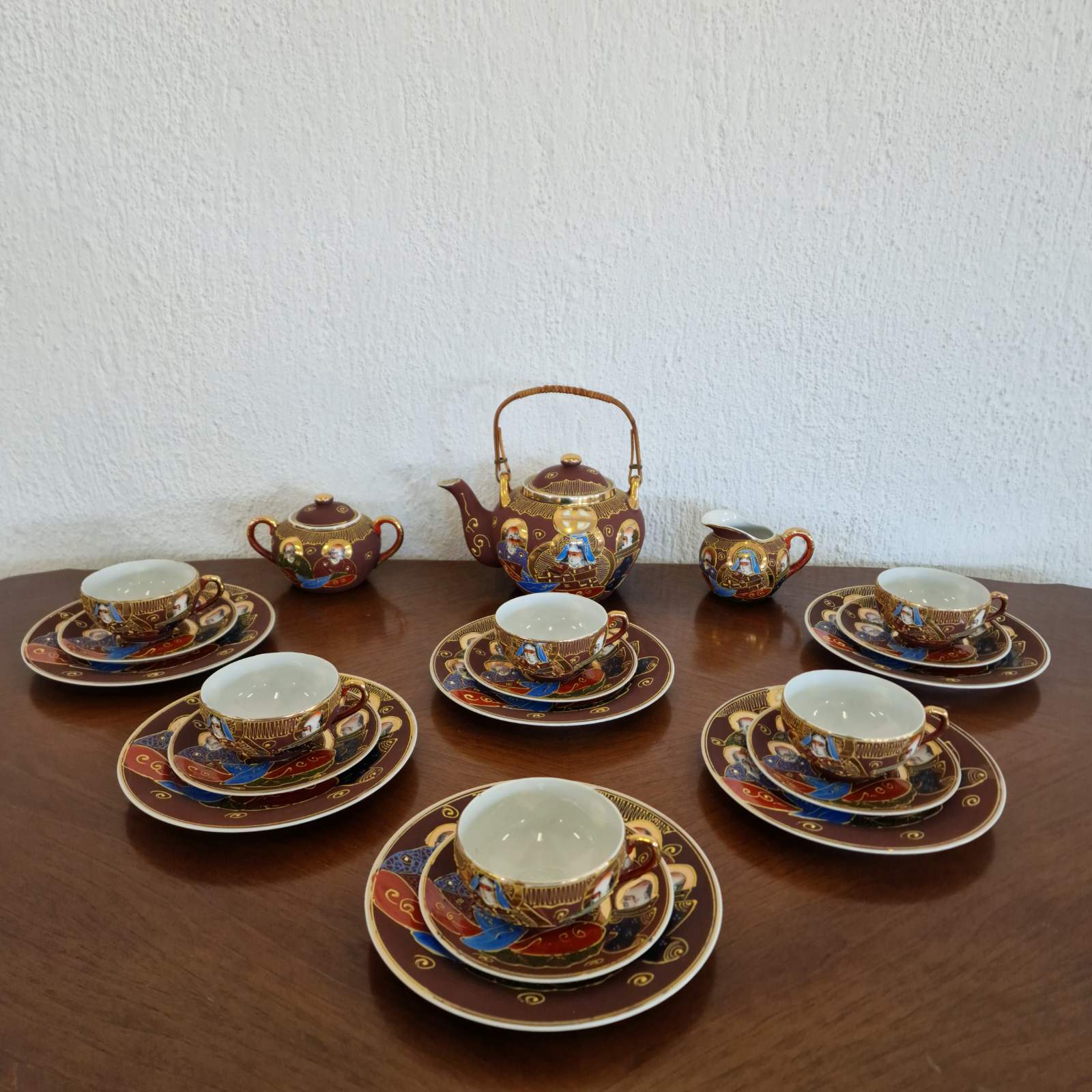 Изключително красив комплект за чай от фин костен порцелан в стил Satsuma, впечатляващ с богата ръчна декорация, ориенталски фигурални сцени и златна орнаментика. Комплектът излъчва лукс и аристократичен чар и е създаден като декоративен и представителен сервиз.
