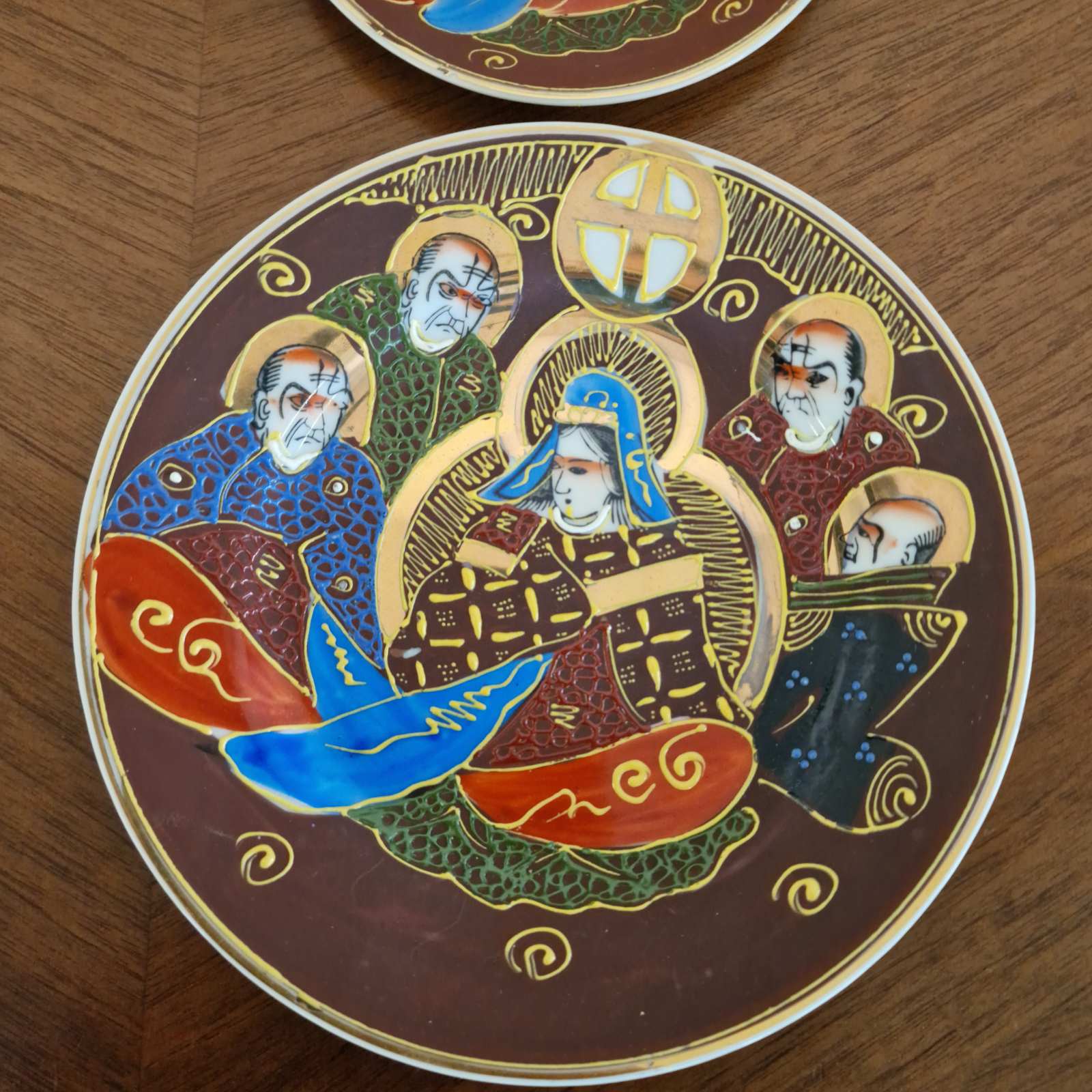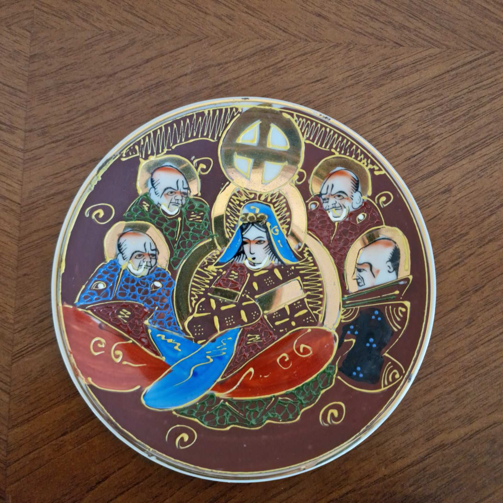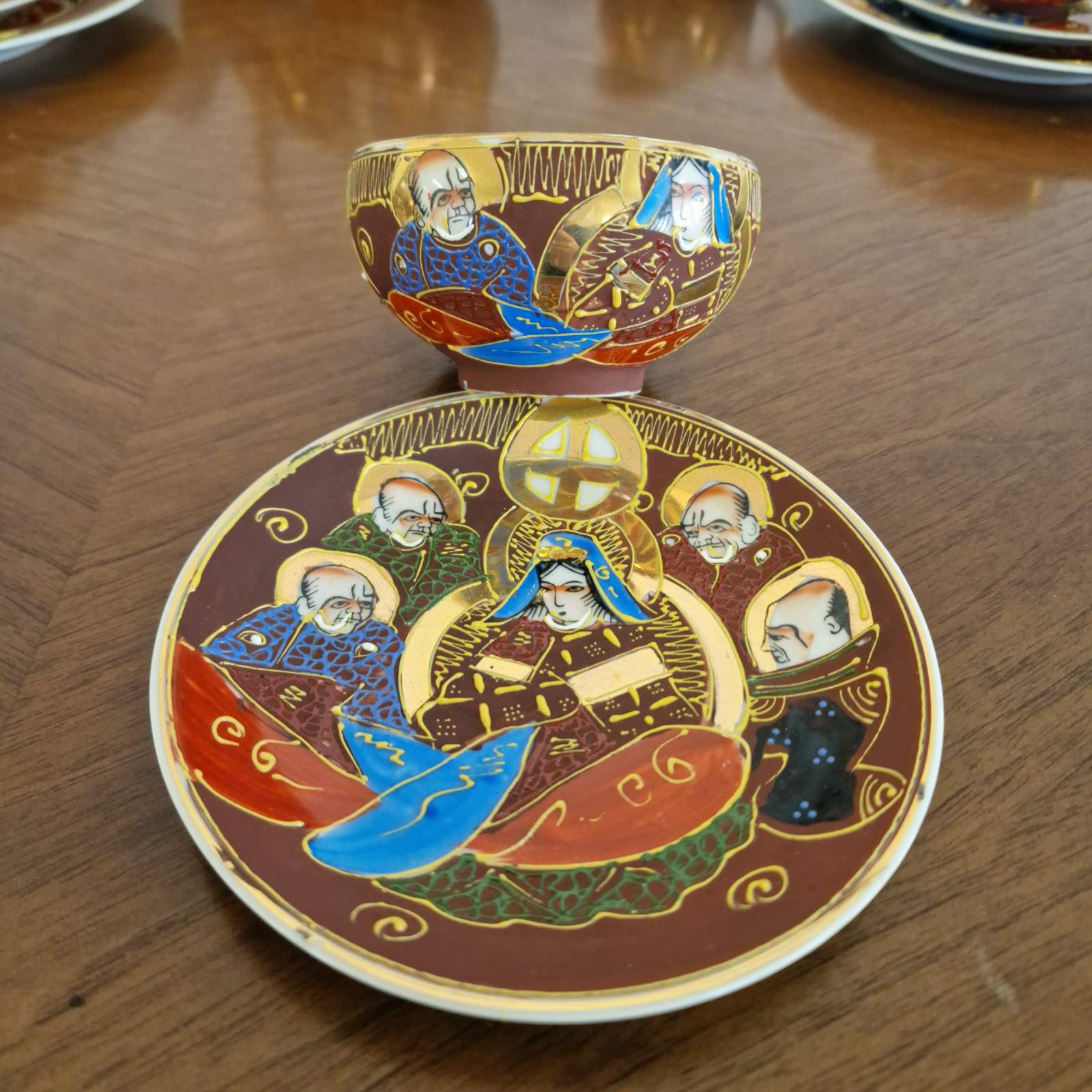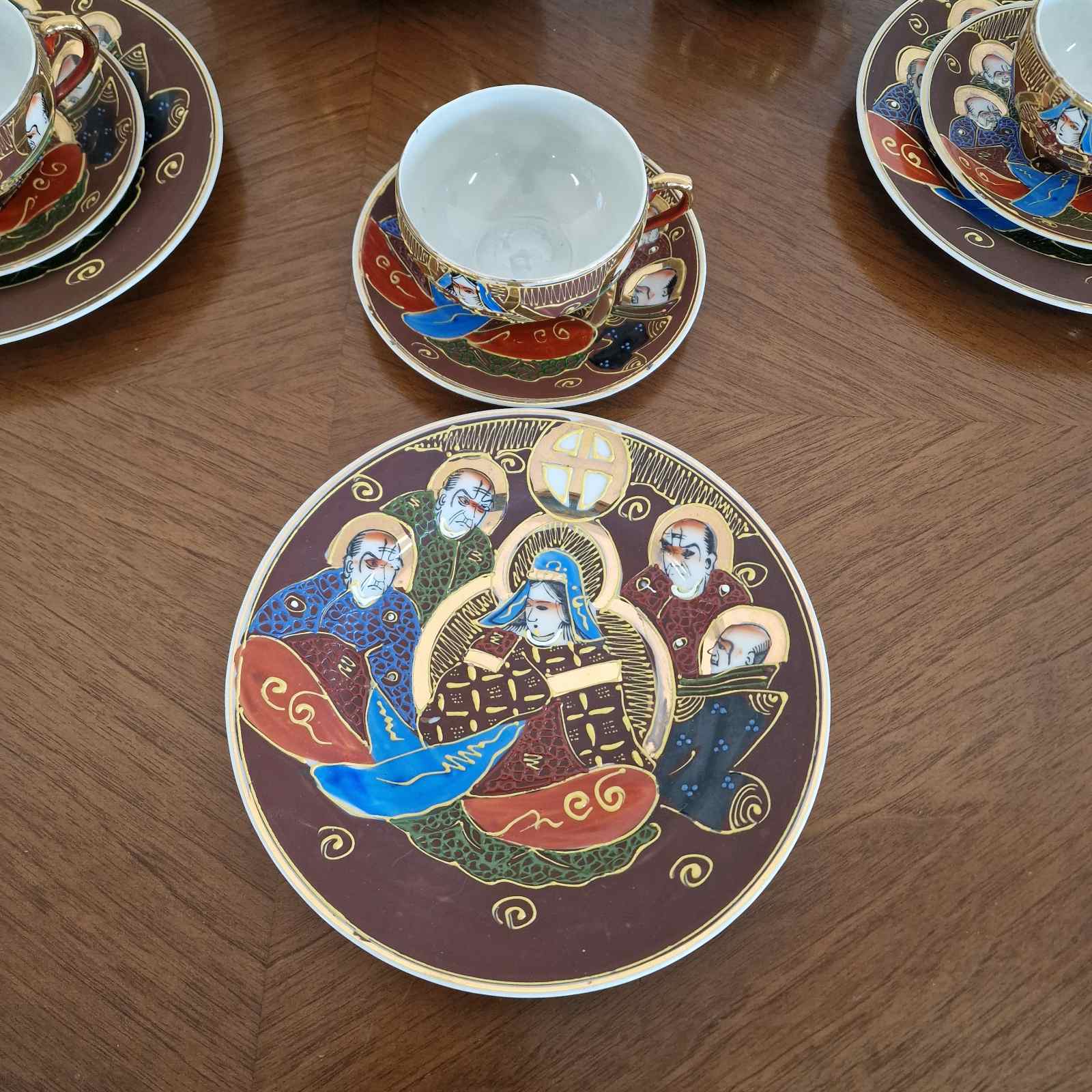 Изключително красив комплект за чай от фин костен порцелан в стил Satsuma, впечатляващ с богата ръчна декорация, ориенталски фигурални сцени и златна орнаментика. Комплектът излъчва лукс и аристократичен чар и е създаден като декоративен и представителен сервиз.