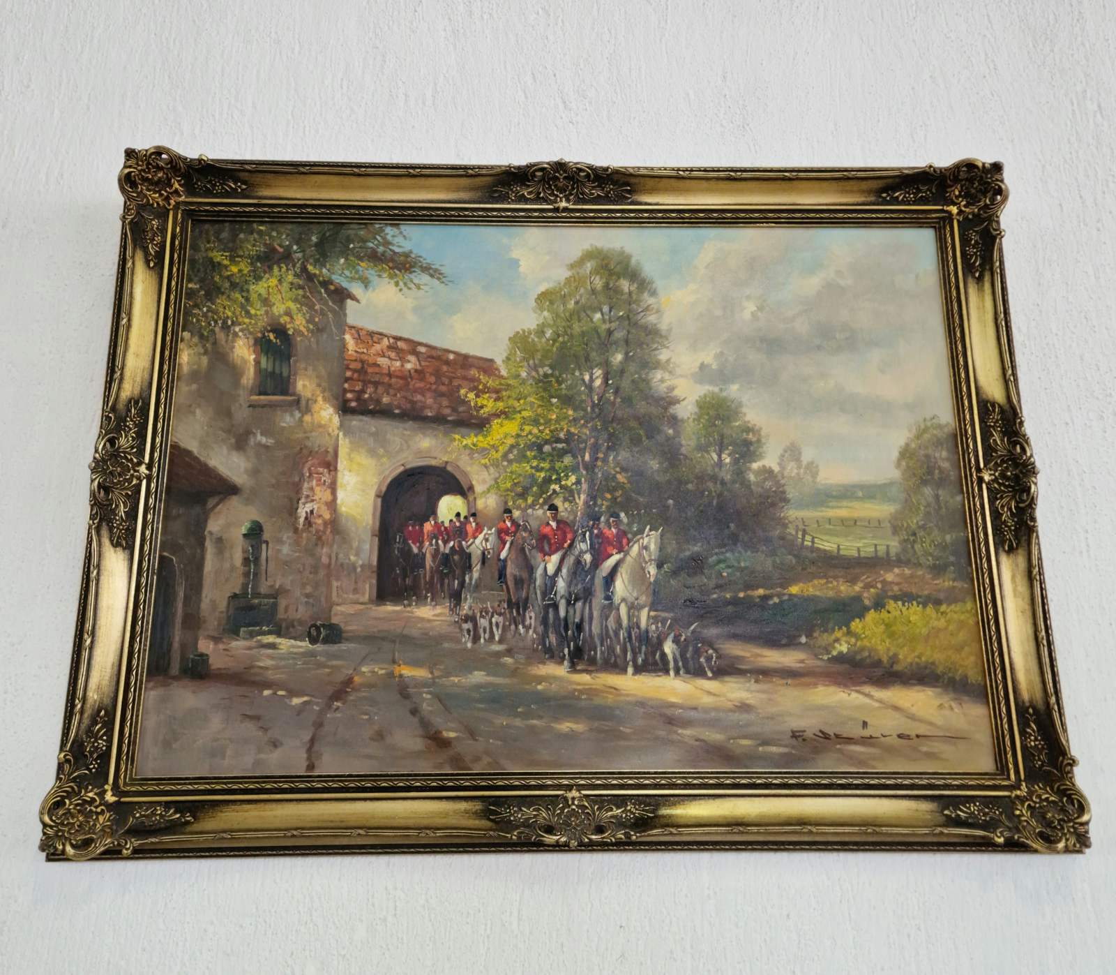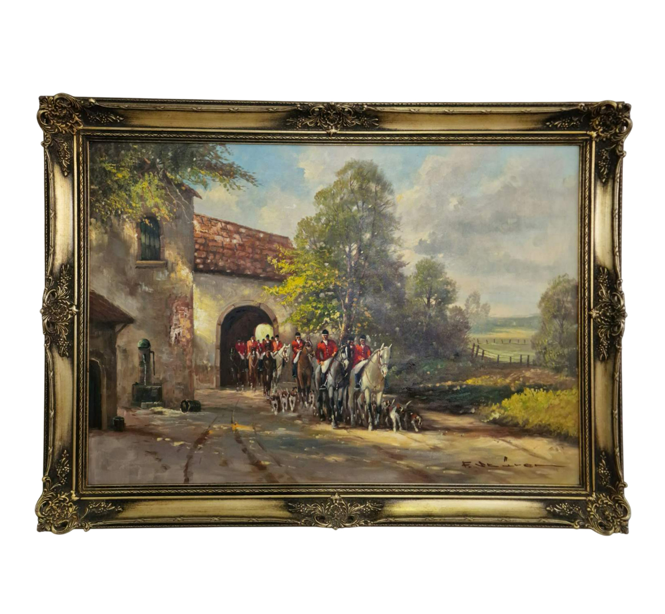 Изключително красива маслена картина, изобразяваща аристократична ловна сцена от XIX век. Композицията представя група ездачи в традиционни червени костюми, следвани от глутница хрътки, сред живописен есенен пейзаж. Топлите цветове и детайлният рисунък създават усещане за движение, елегантност и благородство.