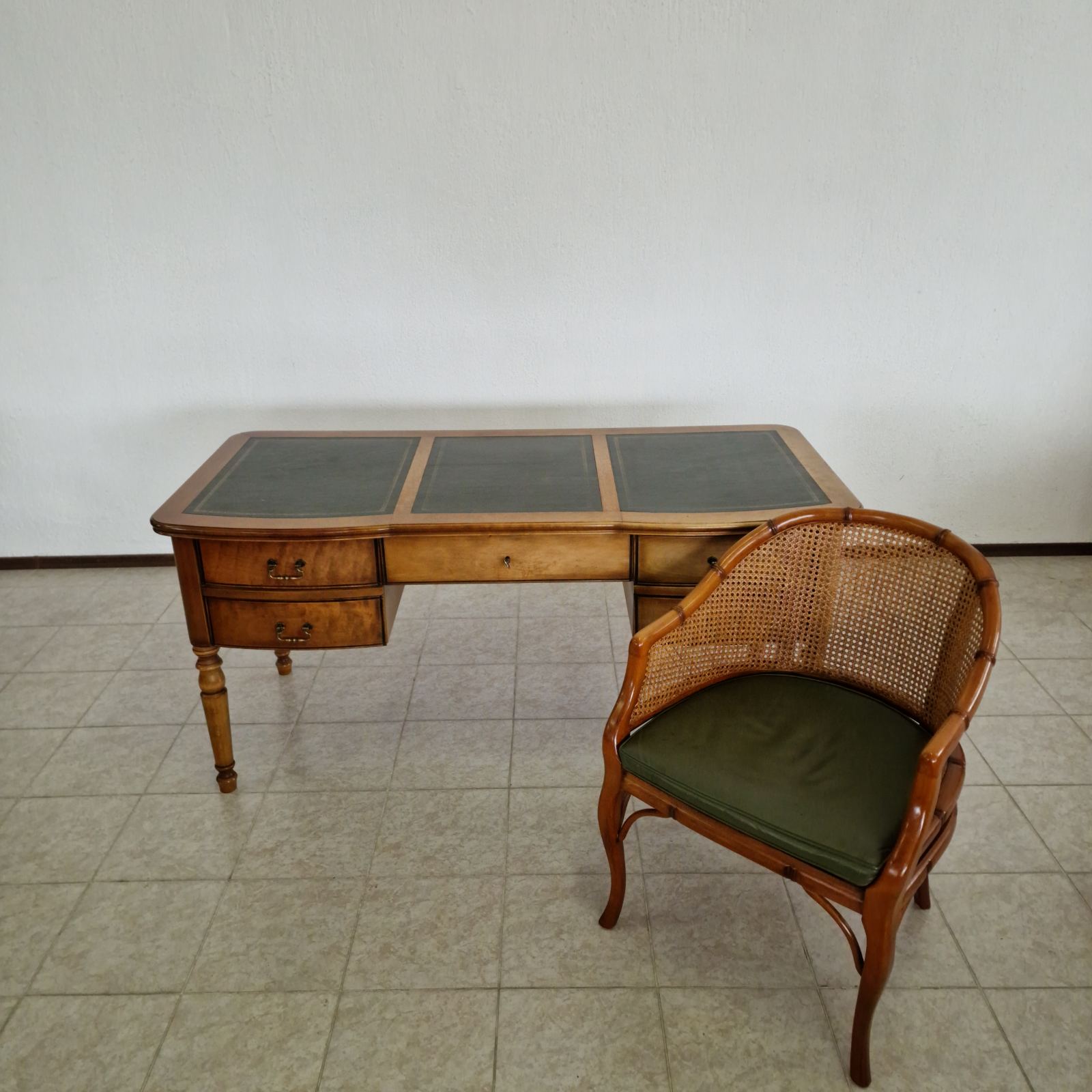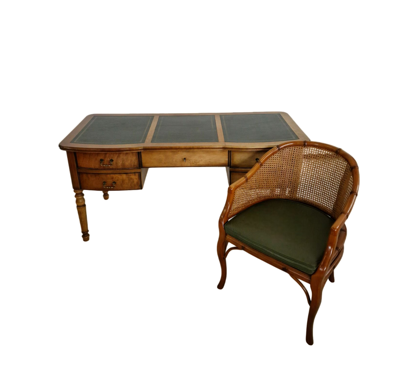 Бюрото разполага с чекмеджета, осигуряващи удобно пространство за съхранение на документи и принадлежности, а топлият кафяв тон на дървесината подчертава естествената й текстура и качеството на изработката. Към комплекта е представен стилен стол с масивна дървена рамка, облегалка от естествена плетка и седалка с мека кожена тапицерия в зелен цвят. Столът е анатомично оформен и предлага отличен комфорт, като визуално и функционално допълва бюрото.