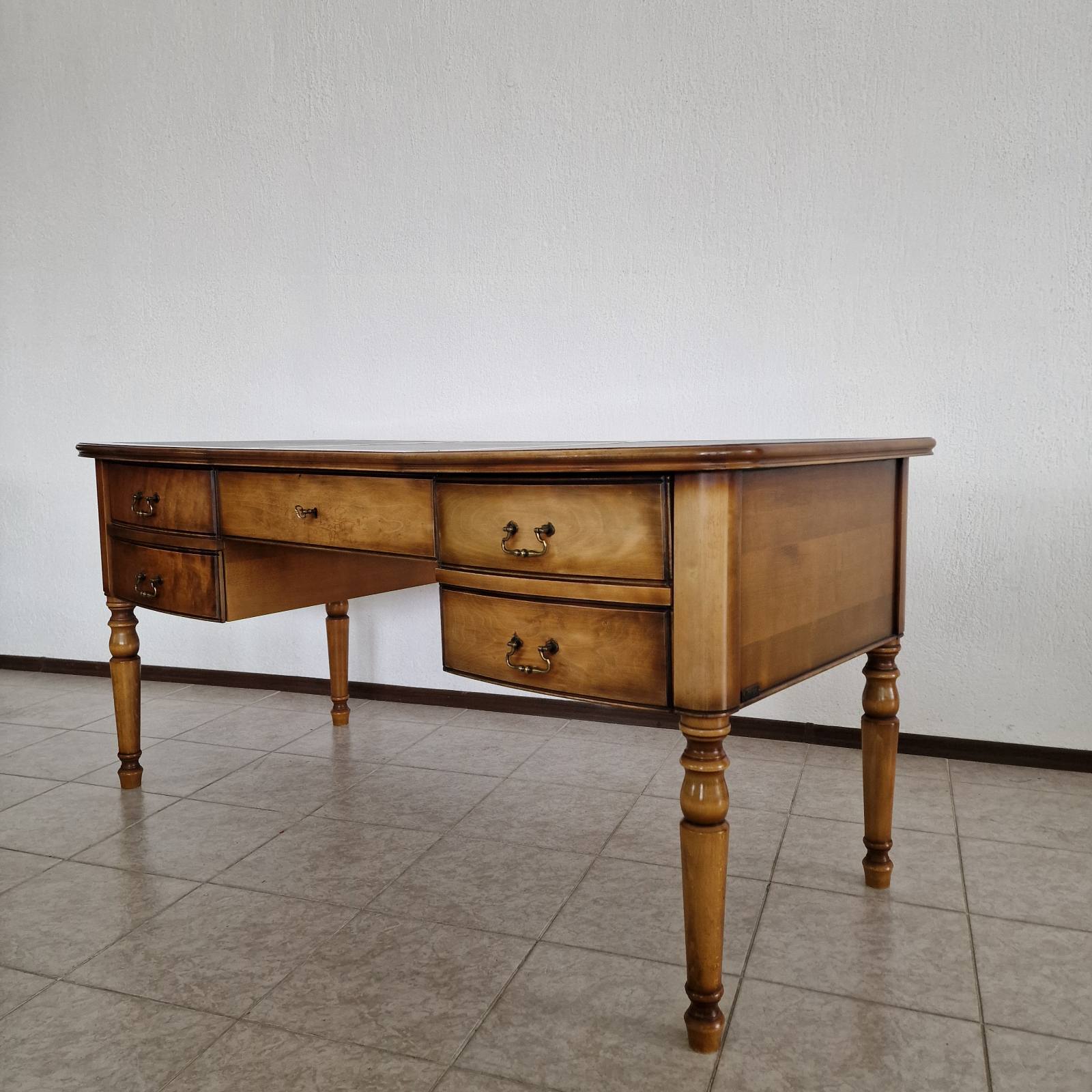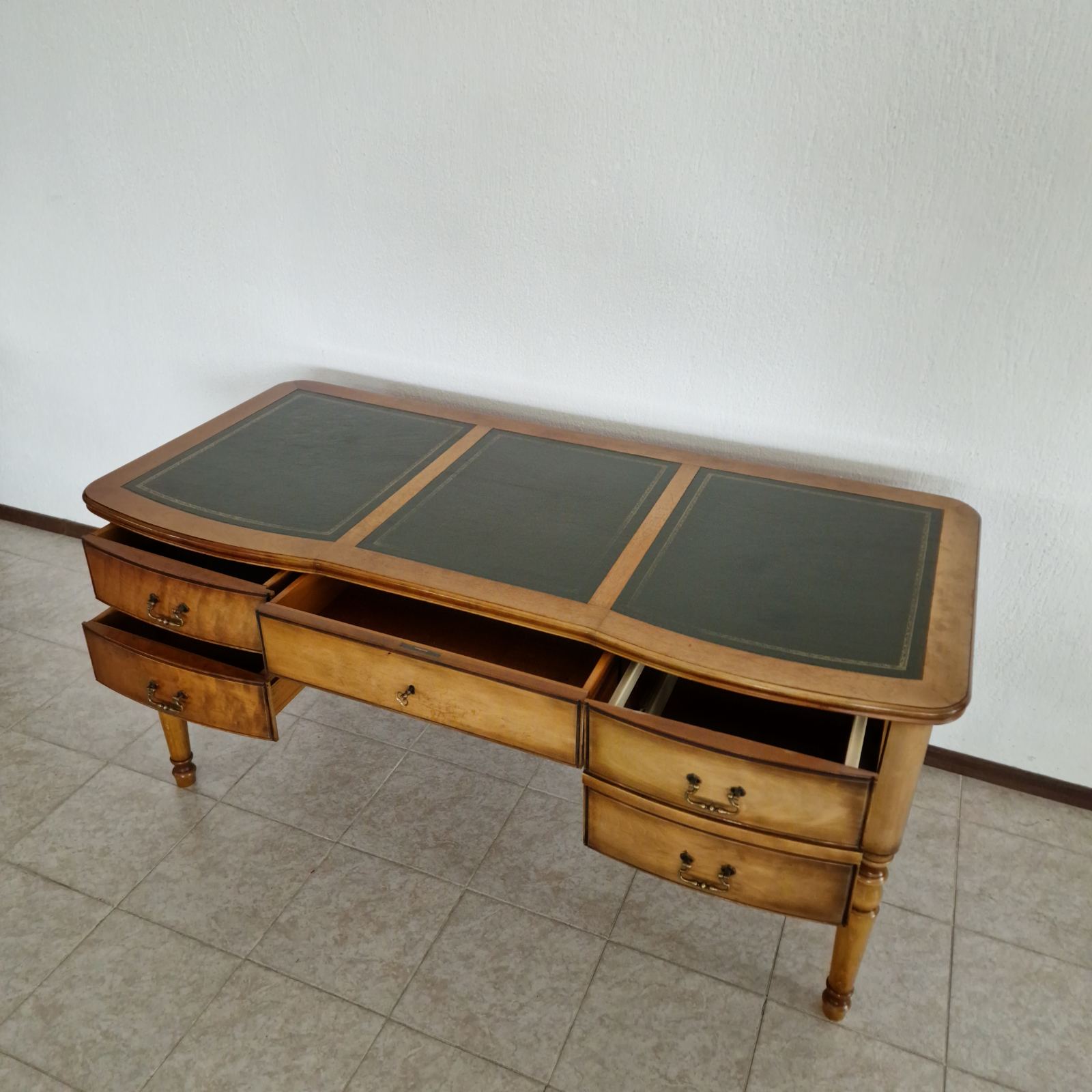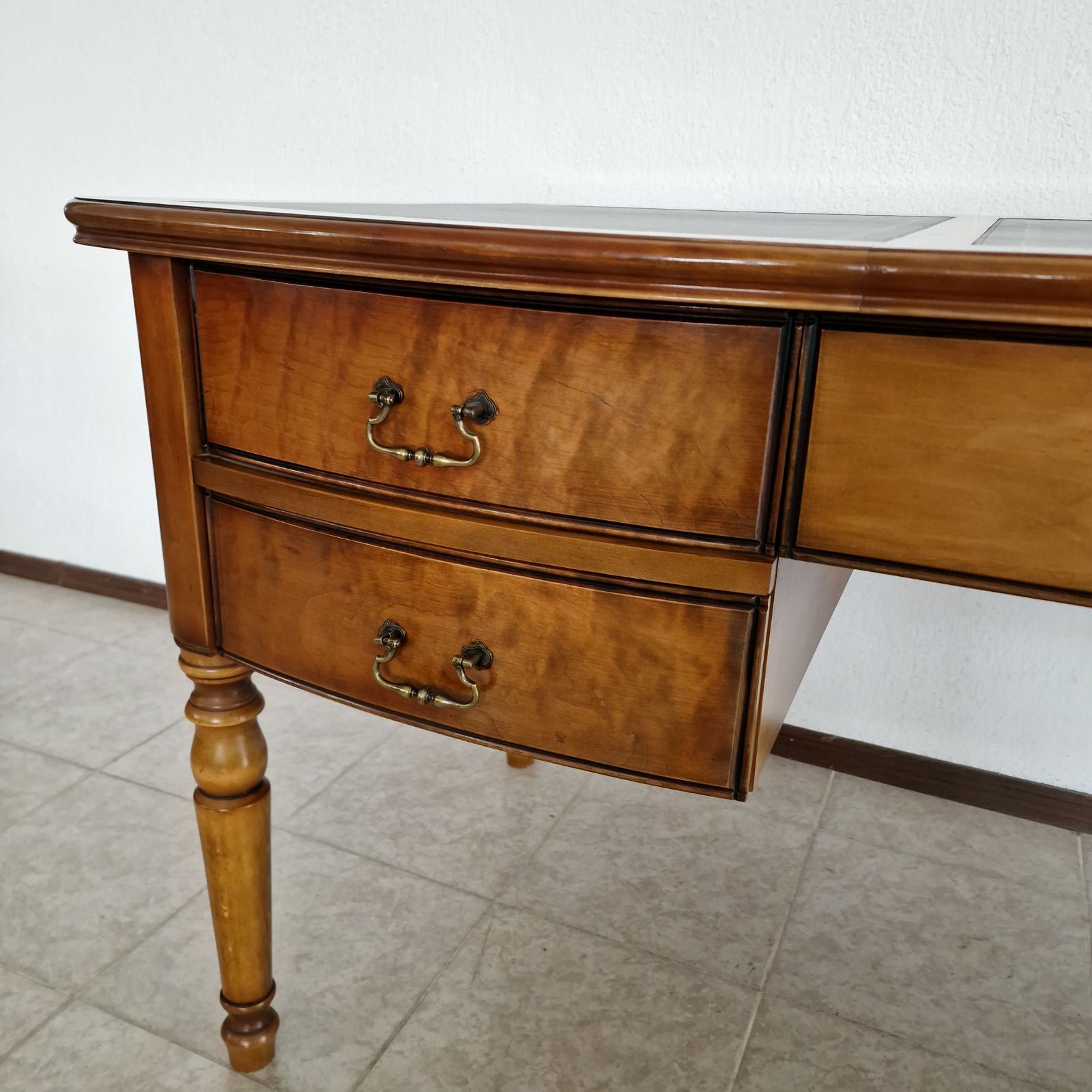 Елегантно класическо бюро с изискан дизайн, изработено от масивно дърво, съчетаващо функционалност и неподвластен на времето стил. Плотът е с кожена облицовка, разделена на панели, което придава аристократичен характер и осигурява комфорт при работа или писане. Формата е балансирана и хармонична, с фино изработени детайли и стабилна конструкция, подходяща както за ежедневна употреба, така и за представителен кабинет или домашен офис.