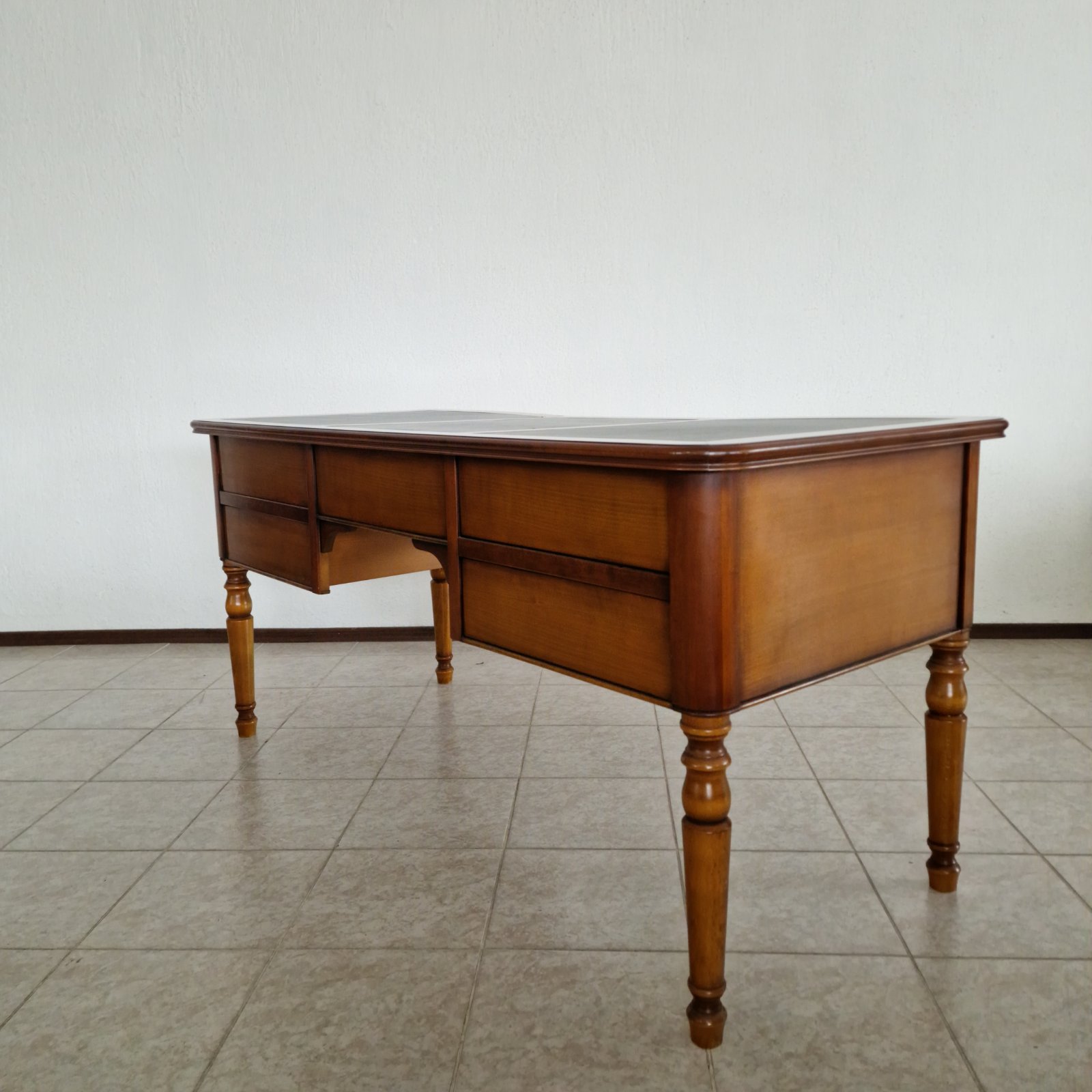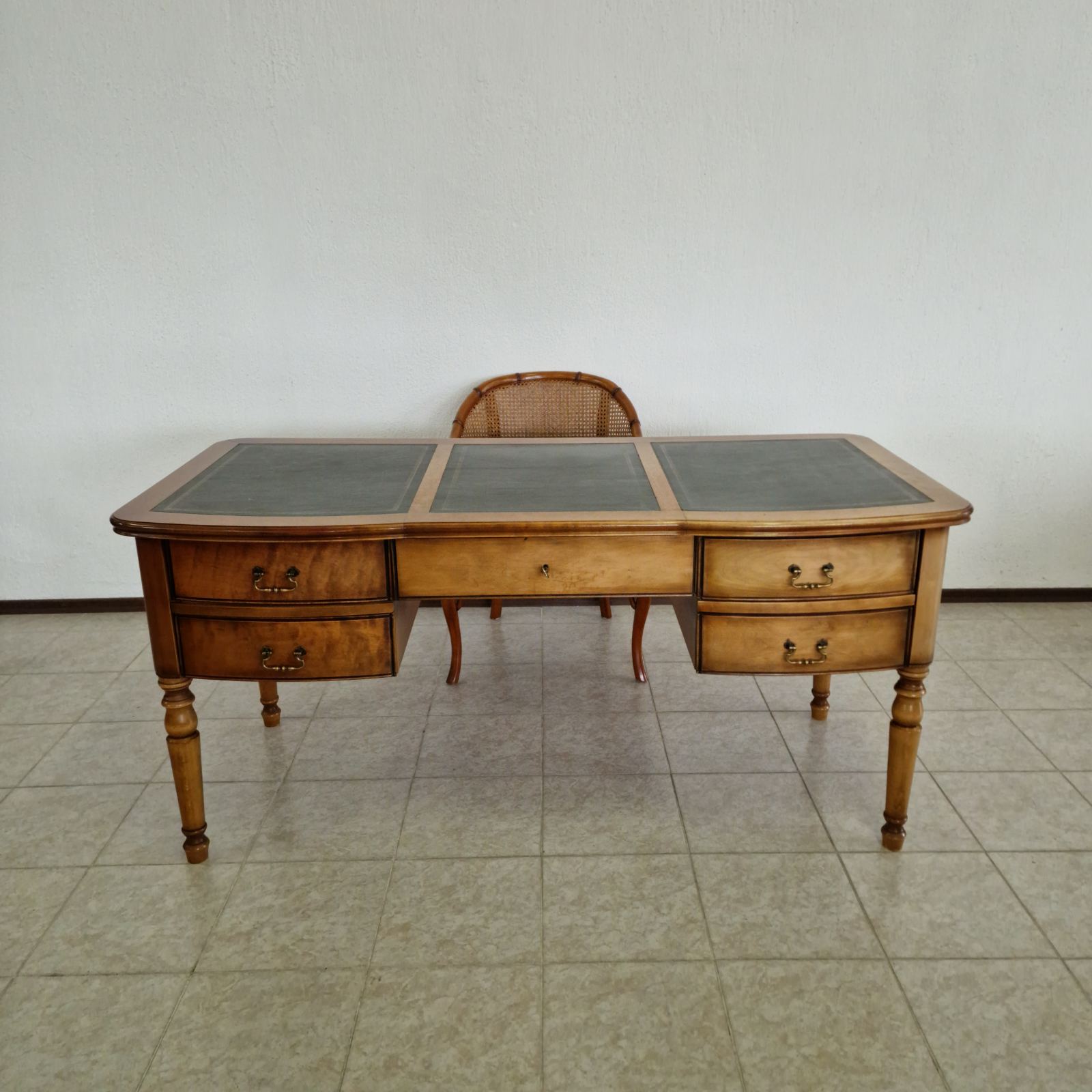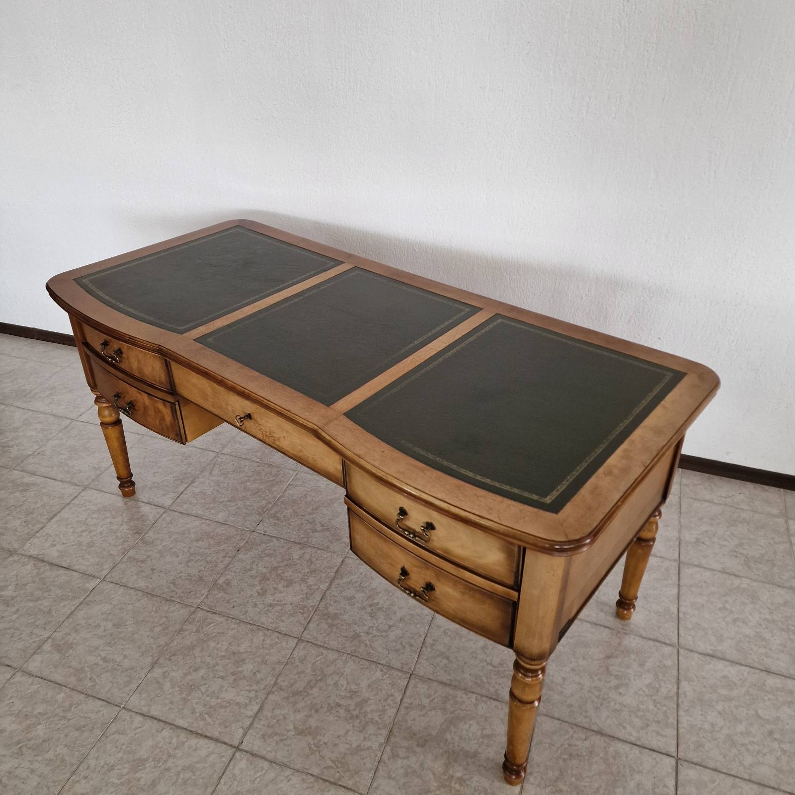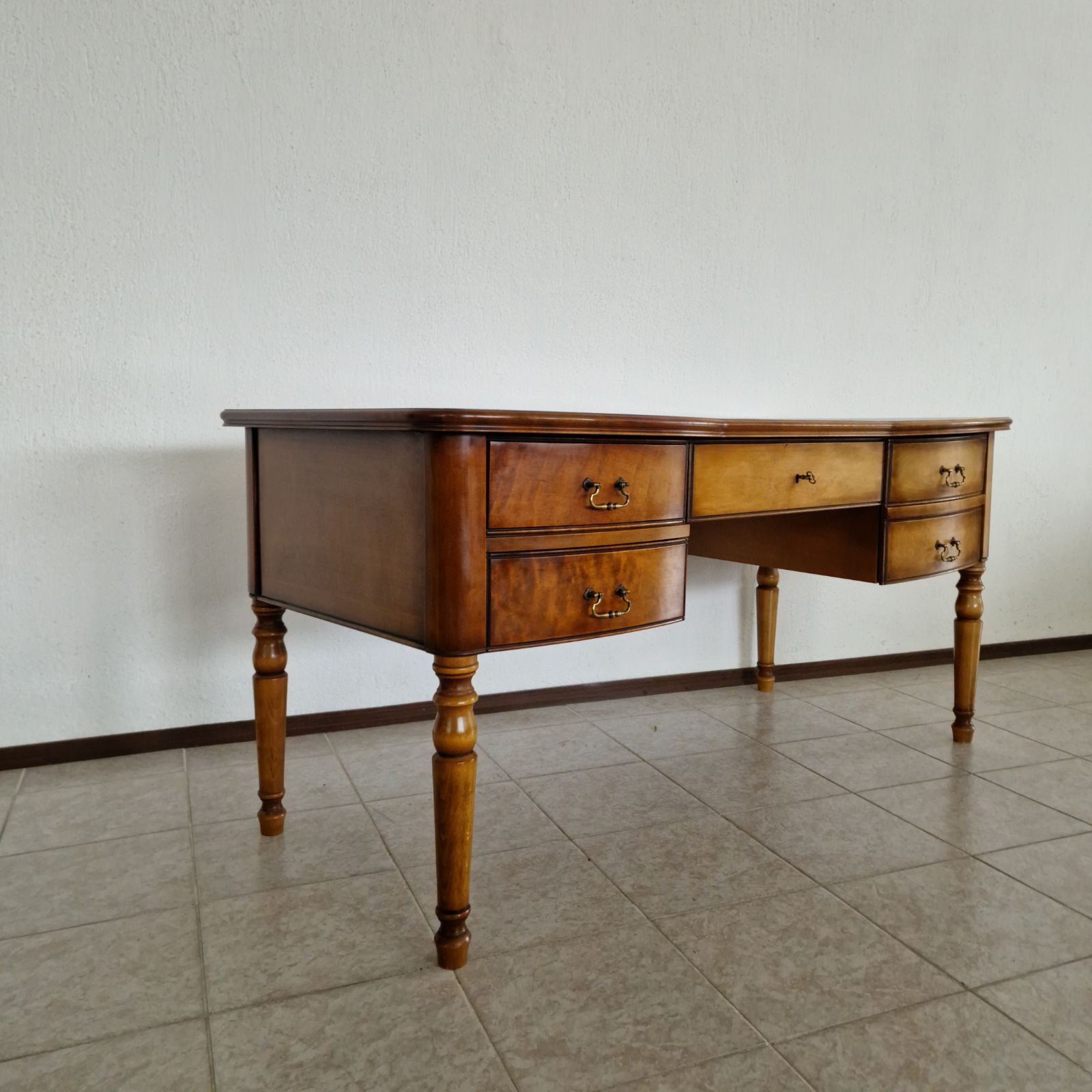 Елегантно класическо бюро с изискан дизайн, изработено от масивно дърво, съчетаващо функционалност и неподвластен на времето стил. Плотът е с кожена облицовка, разделена на панели, което придава аристократичен характер и осигурява комфорт при работа или писане. Формата е балансирана и хармонична, с фино изработени детайли и стабилна конструкция, подходяща както за ежедневна употреба, така и за представителен кабинет или домашен офис.