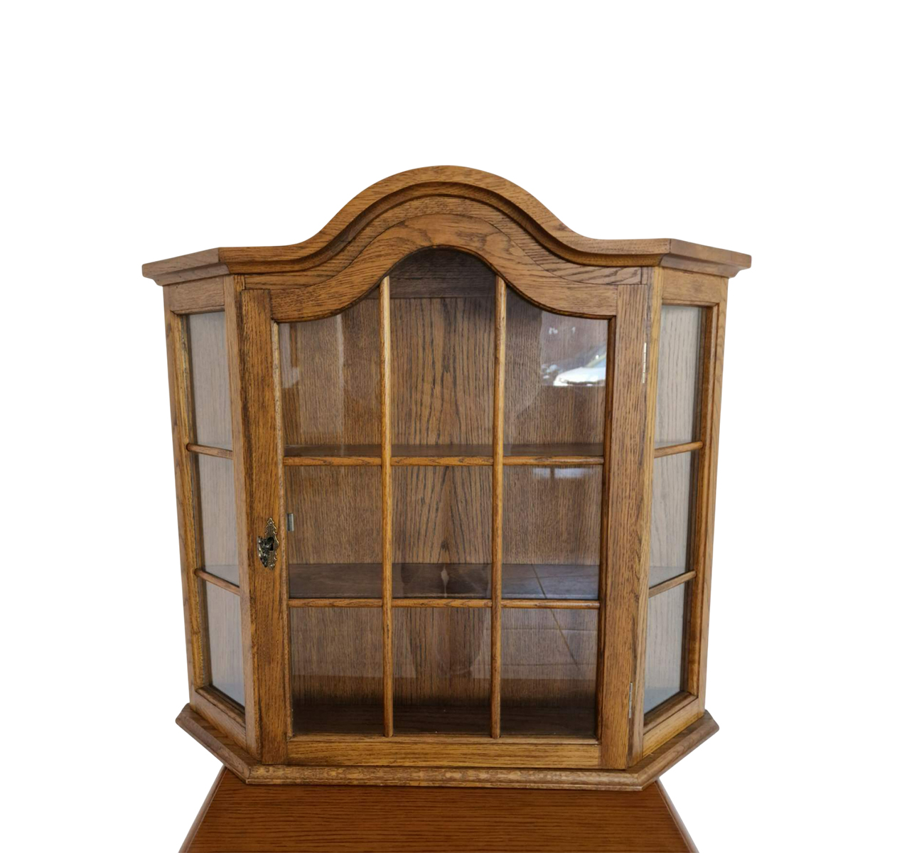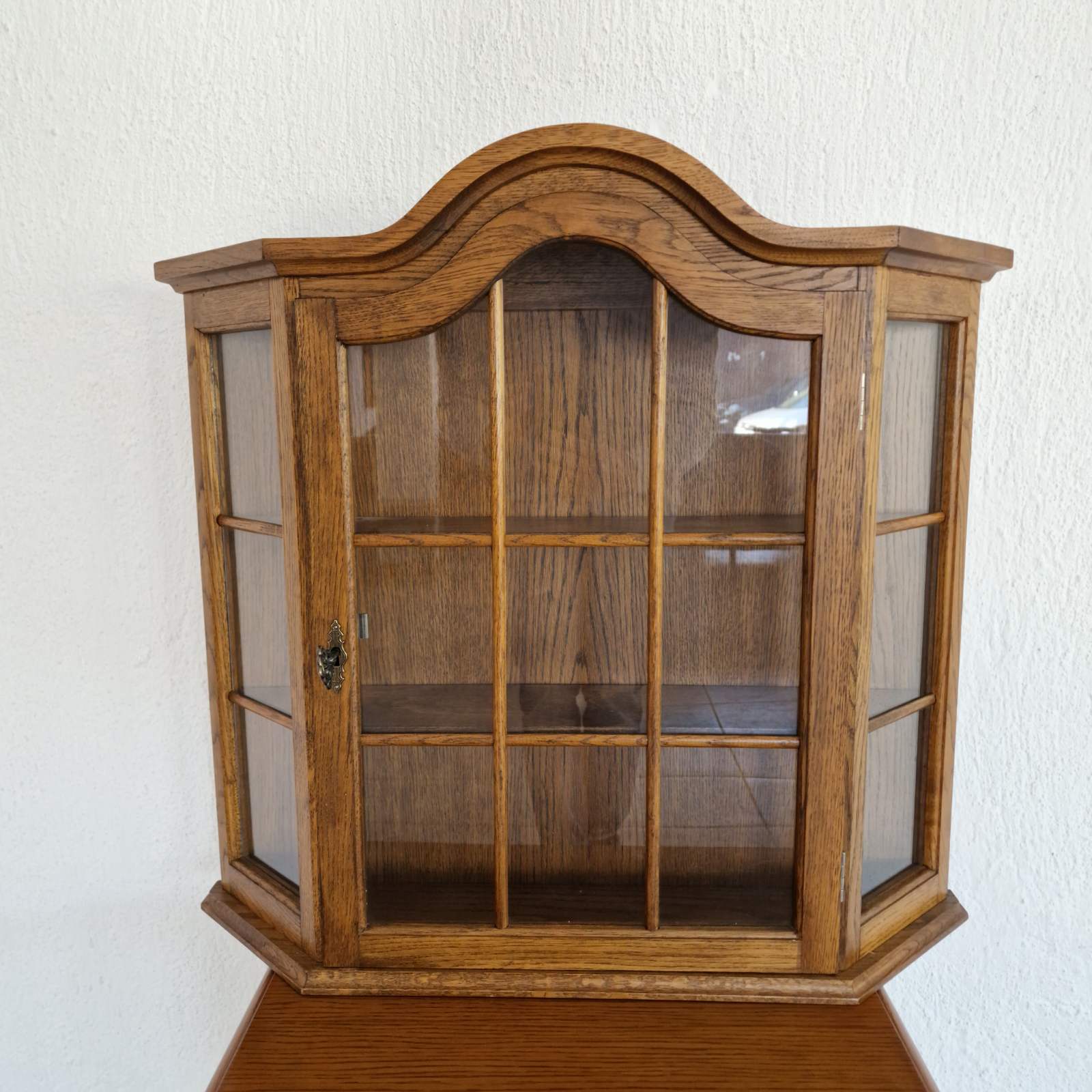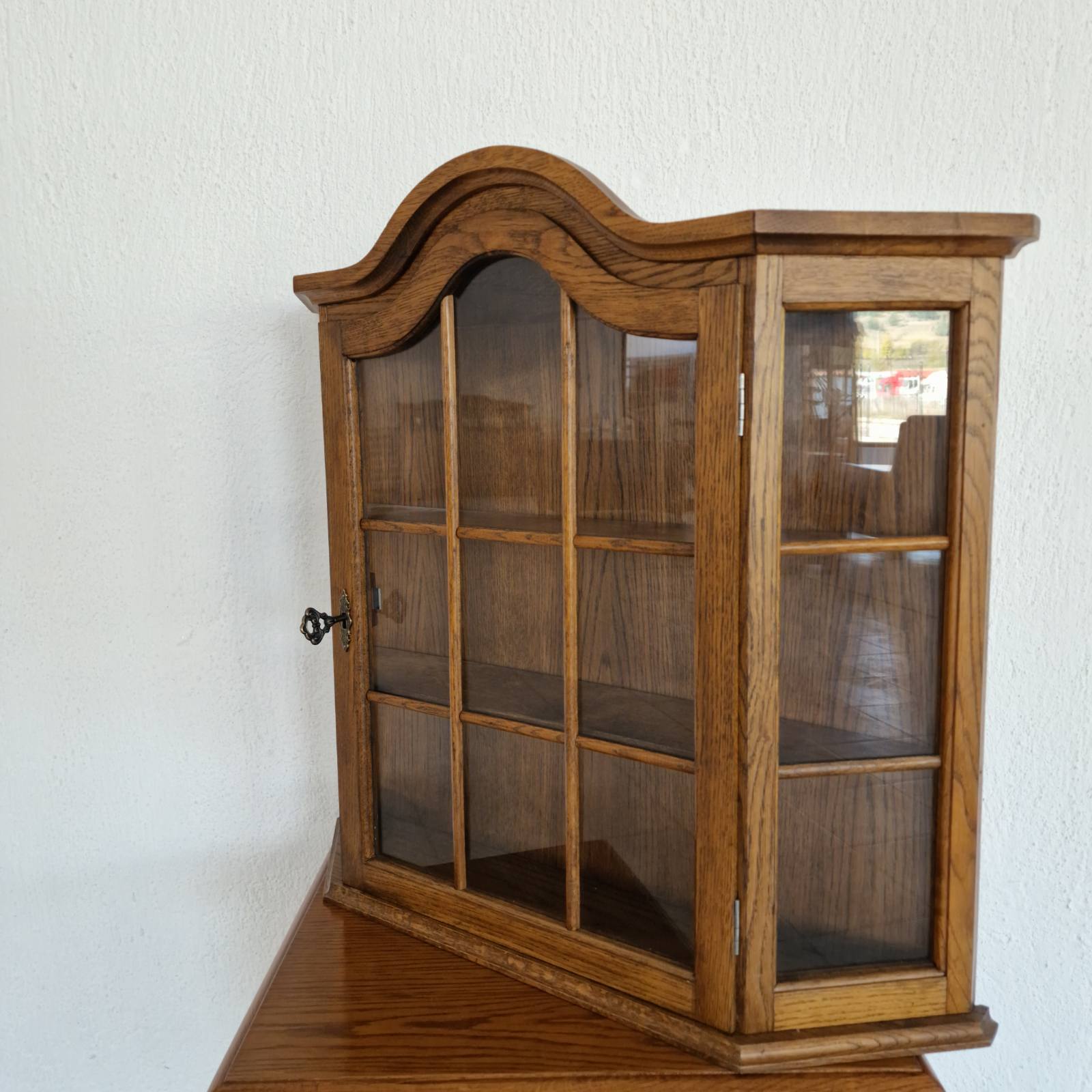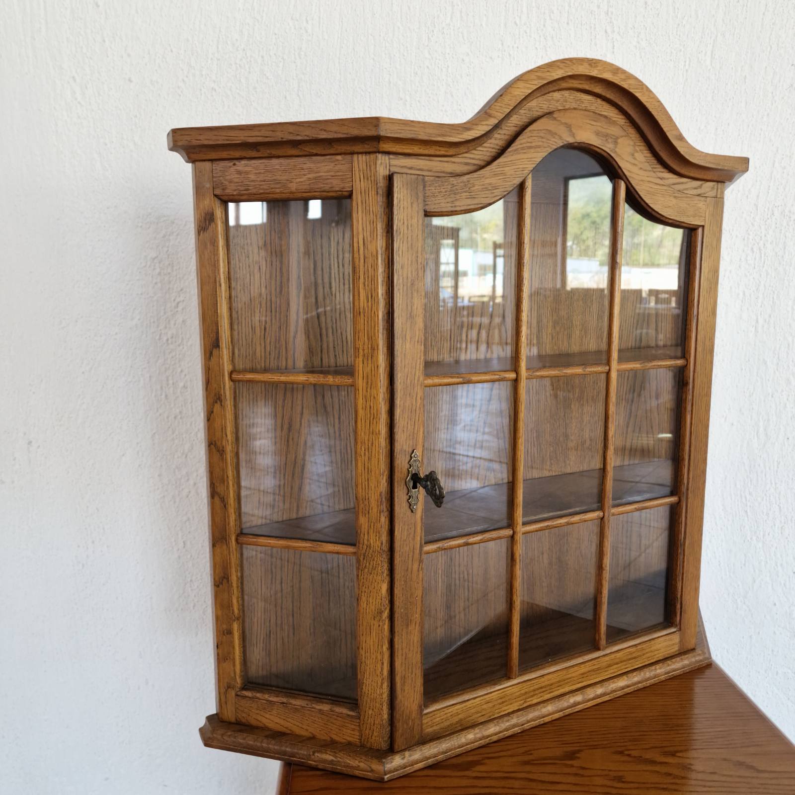 Елегантна и практична, тази малка стена витрина е изработена от здрав масивен дъб. Разполага с три нива за съхранение или експозиция на сувенири, книги или колекционерски предмети. Вратите се заключват с ключе, осигурявайки безопасност и защита на съдържанието. Идеална за хол, спалня или кабинет, тя придава стил и изтънченост на всяко помещение.
