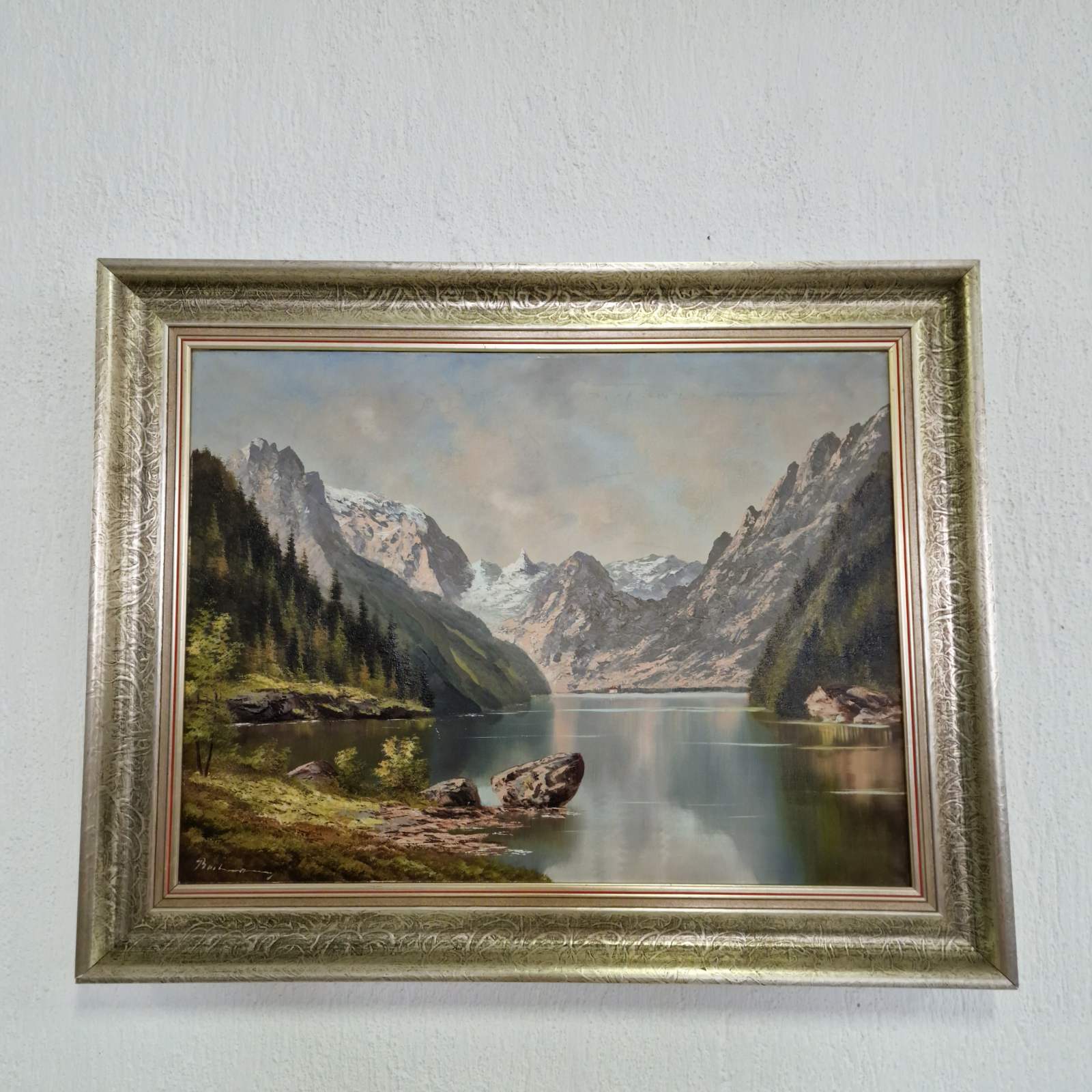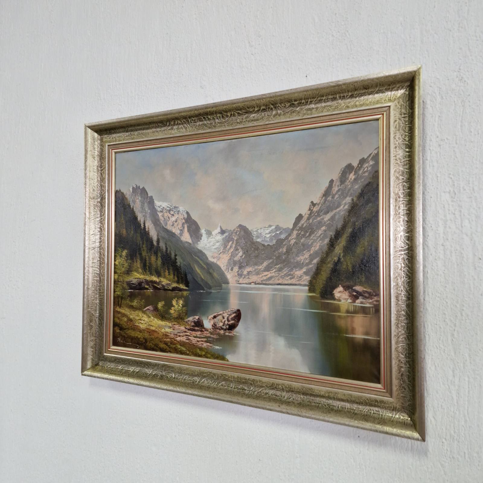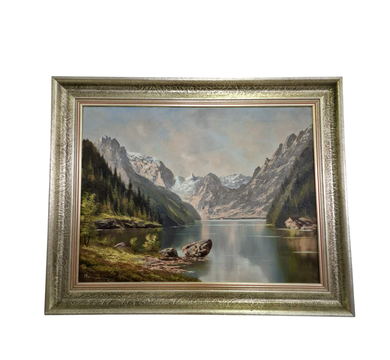 Картината представлява маслена живопис върху платно, изобразяваща планински пейзаж с езеро, заобиколено от стръмни скалисти върхове и гъста иглолистна растителност. Композицията създава усещане за дълбочина и спокойствие, като отраженията на планините и небето във водната повърхност придават хармония и балансираност на цялостното въздействие.