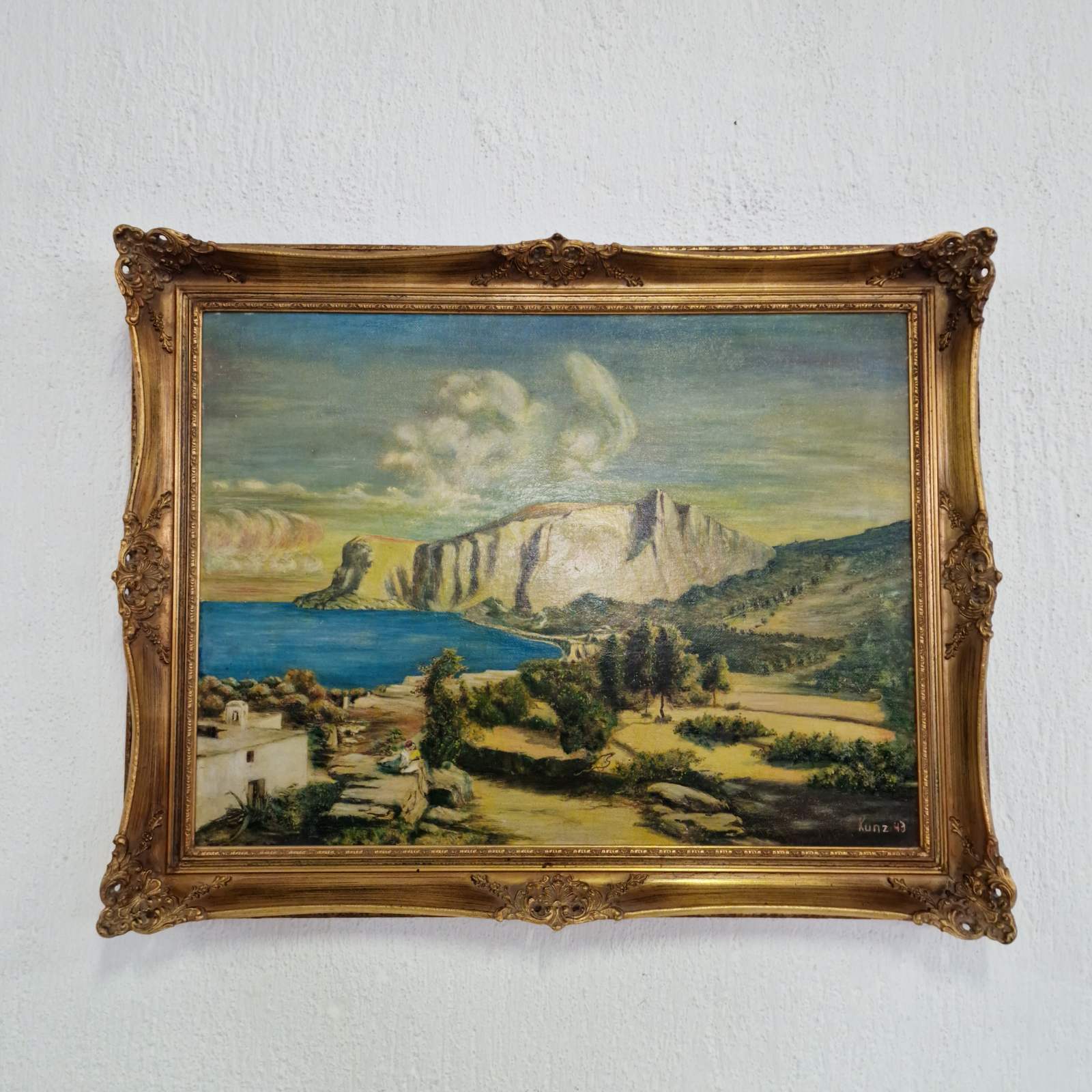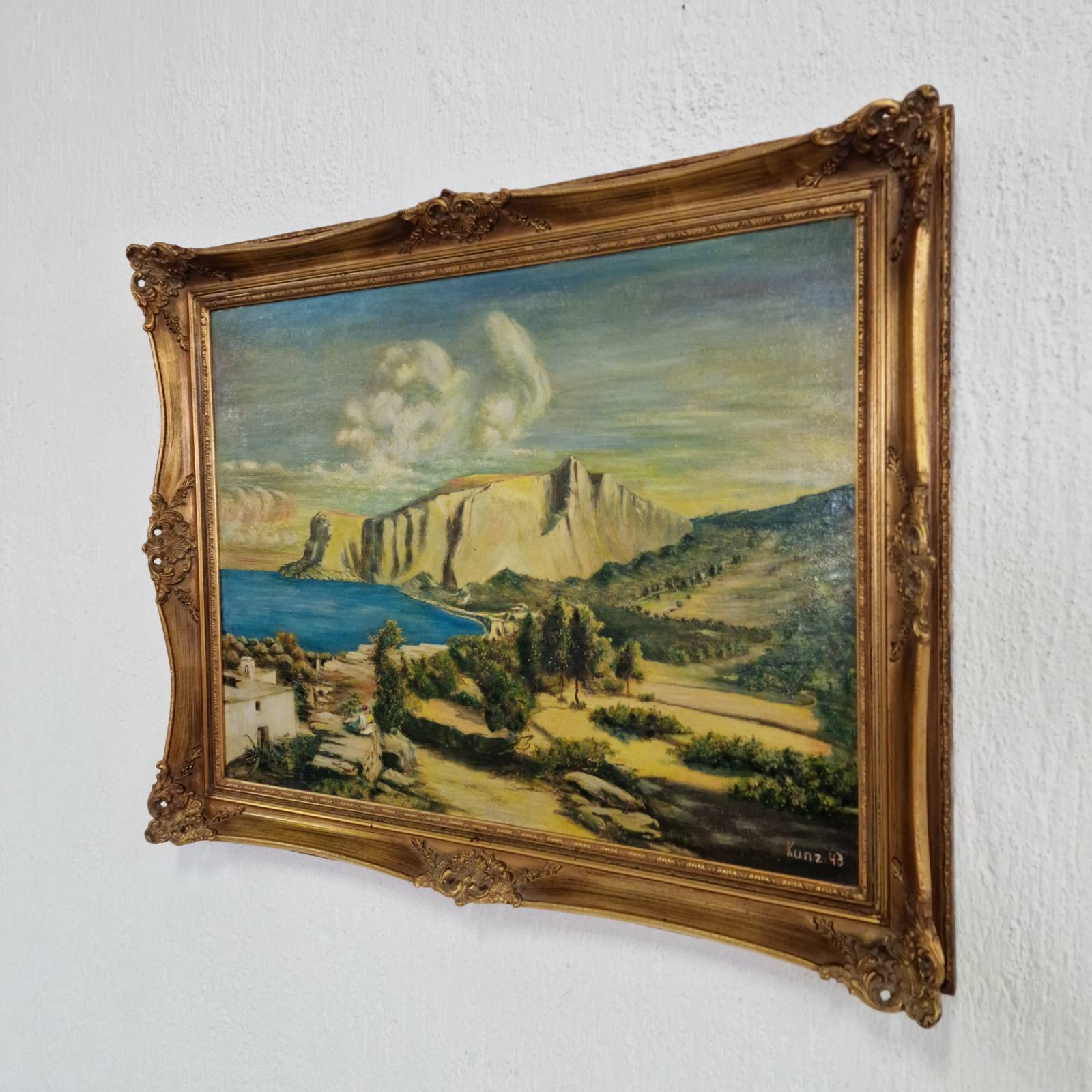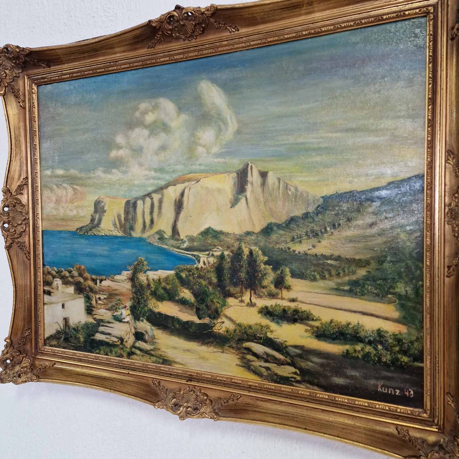 Тази картина представлява пейзаж, изпълнен с маслени бои, който изобразява крайбрежна сцена с внушителни и драматични скални образувания. Композицията напомня за характерни средиземноморски ландшафти. Творбата е подписана в долния десен ъгъл с името „Kunz“ и годината „43“, което свидетелства, че е създадена през 1943 година. Kunz е работил в периода около Втората световна война, като картината носи характерния дух и естетика на времето си.