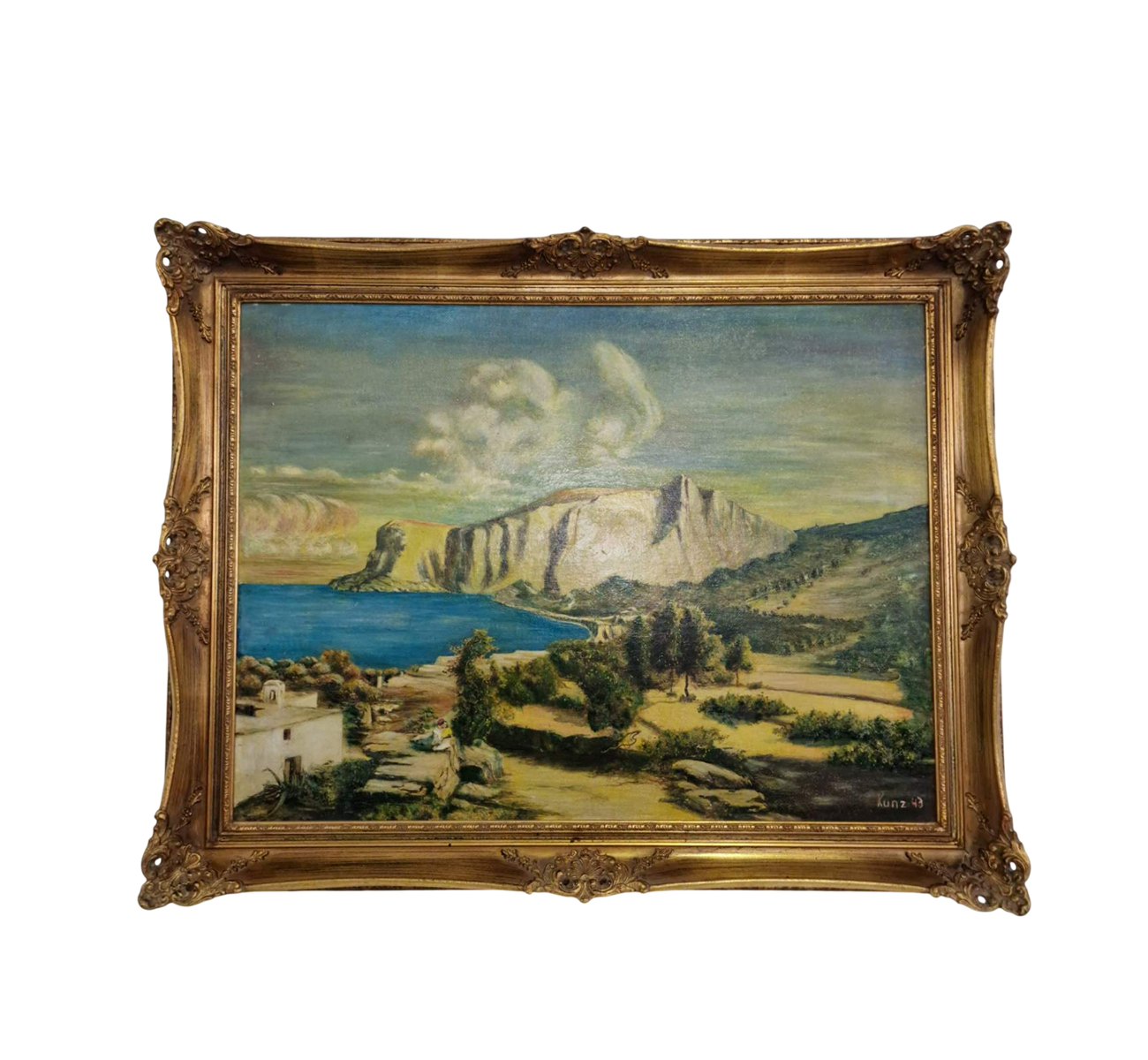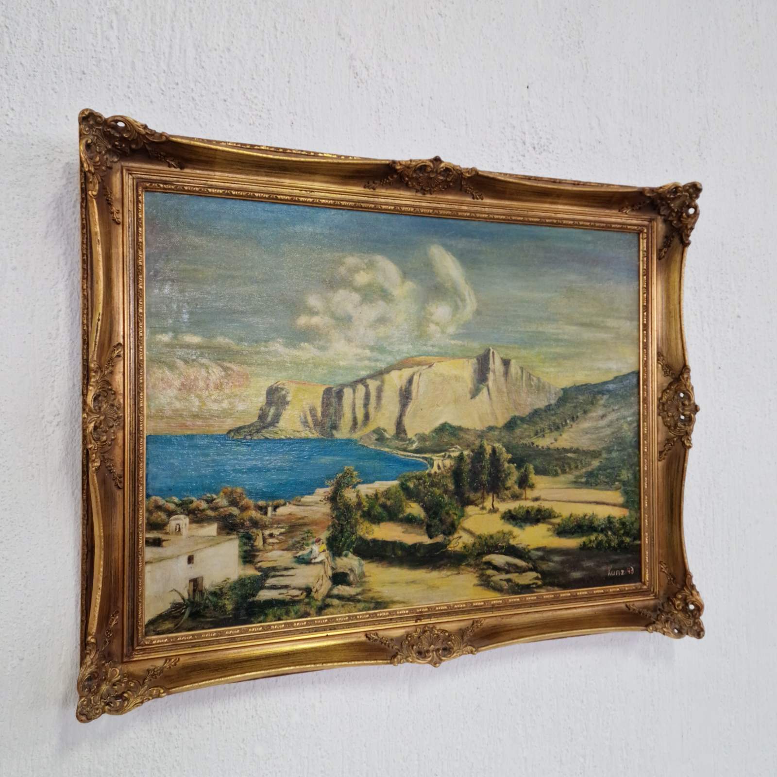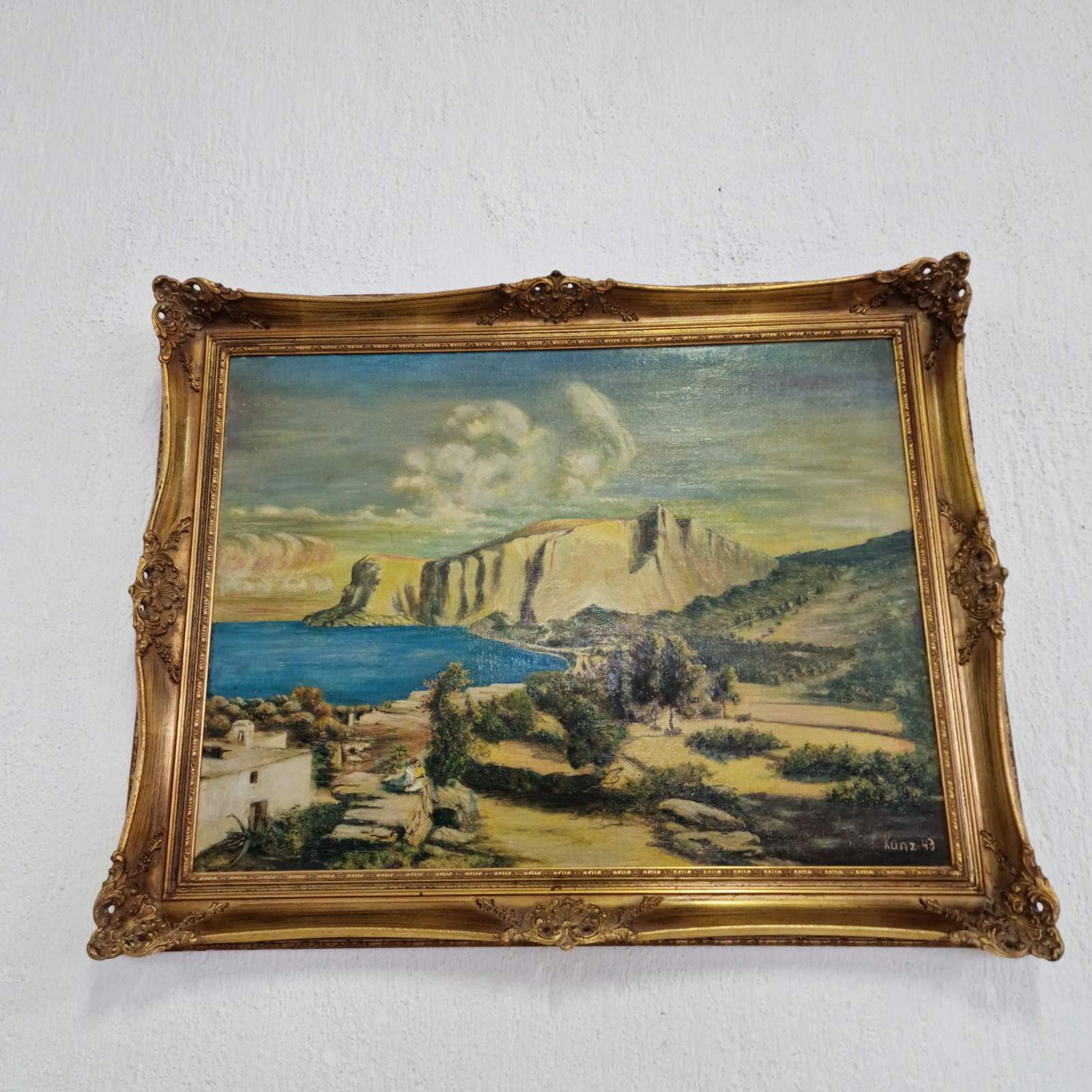 Тази картина представлява пейзаж, изпълнен с маслени бои, който изобразява крайбрежна сцена с внушителни и драматични скални образувания. Композицията напомня за характерни средиземноморски ландшафти. Творбата е подписана в долния десен ъгъл с името „Kunz“ и годината „43“, което свидетелства, че е създадена през 1943 година. Kunz е работил в периода около Втората световна война, като картината носи характерния дух и естетика на времето си.