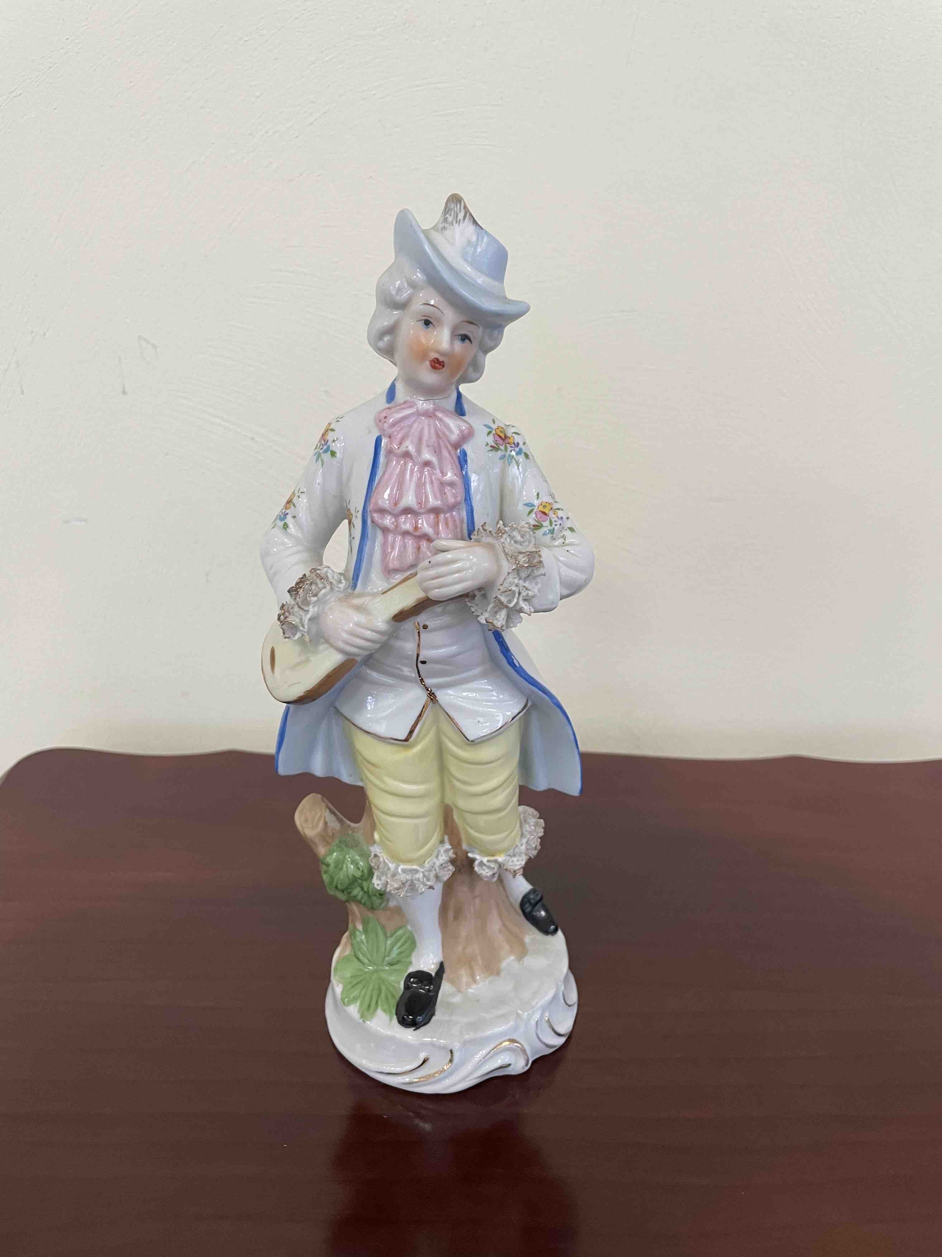 Порцеланова фигура на кавалер, изработена с голямо внимание към детайлите. Той е облечен в елегантен костюм от миналия век, с изискани цветови нюанси и фини детайли, които подчертават неговия стил и грация. Фигурата е ръчно декорирана, с гладка повърхност и фин блясък, което я прави идеален декоративен елемент или част от колекция.