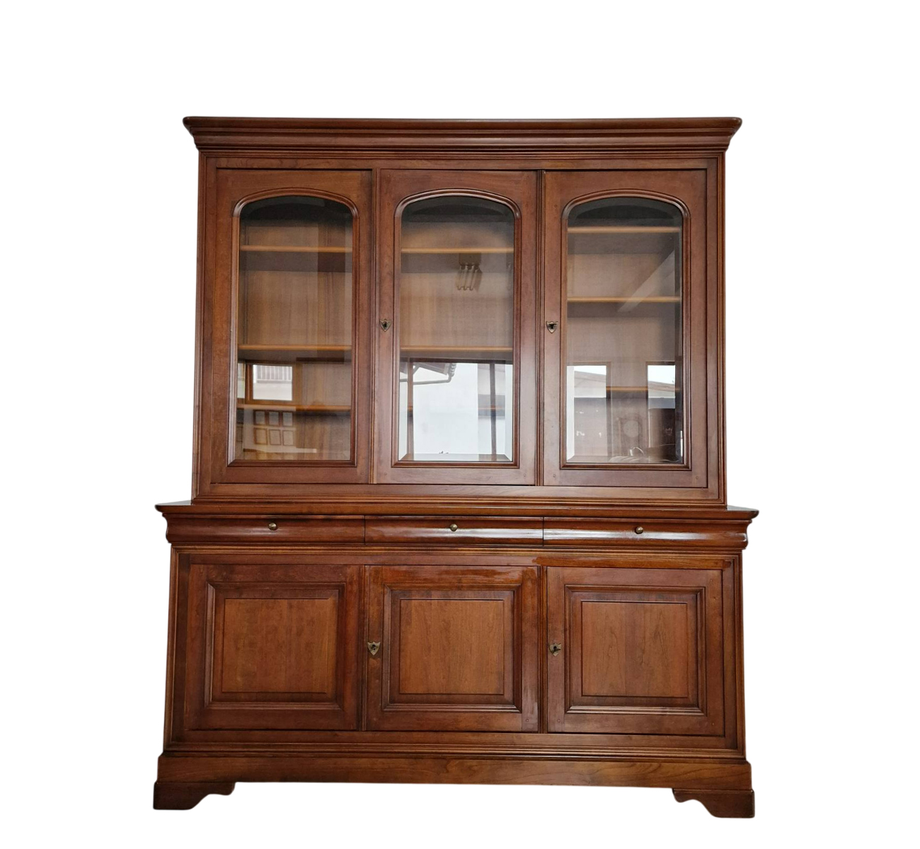 Горната част представлява витрина с три остъклени врати и вътрешни рафтове, чиито нива могат да се коригират според нуждите. Това позволява шкафът да бъде използван както за книги, така и за декоративни предмети. Долната част разполага с три чекмеджета и пространство с плътни врати, осигуряващо практично и дискретно съхранение.