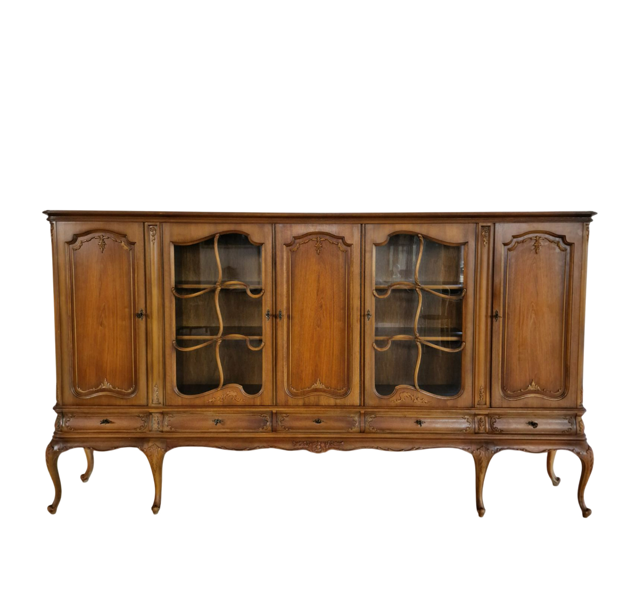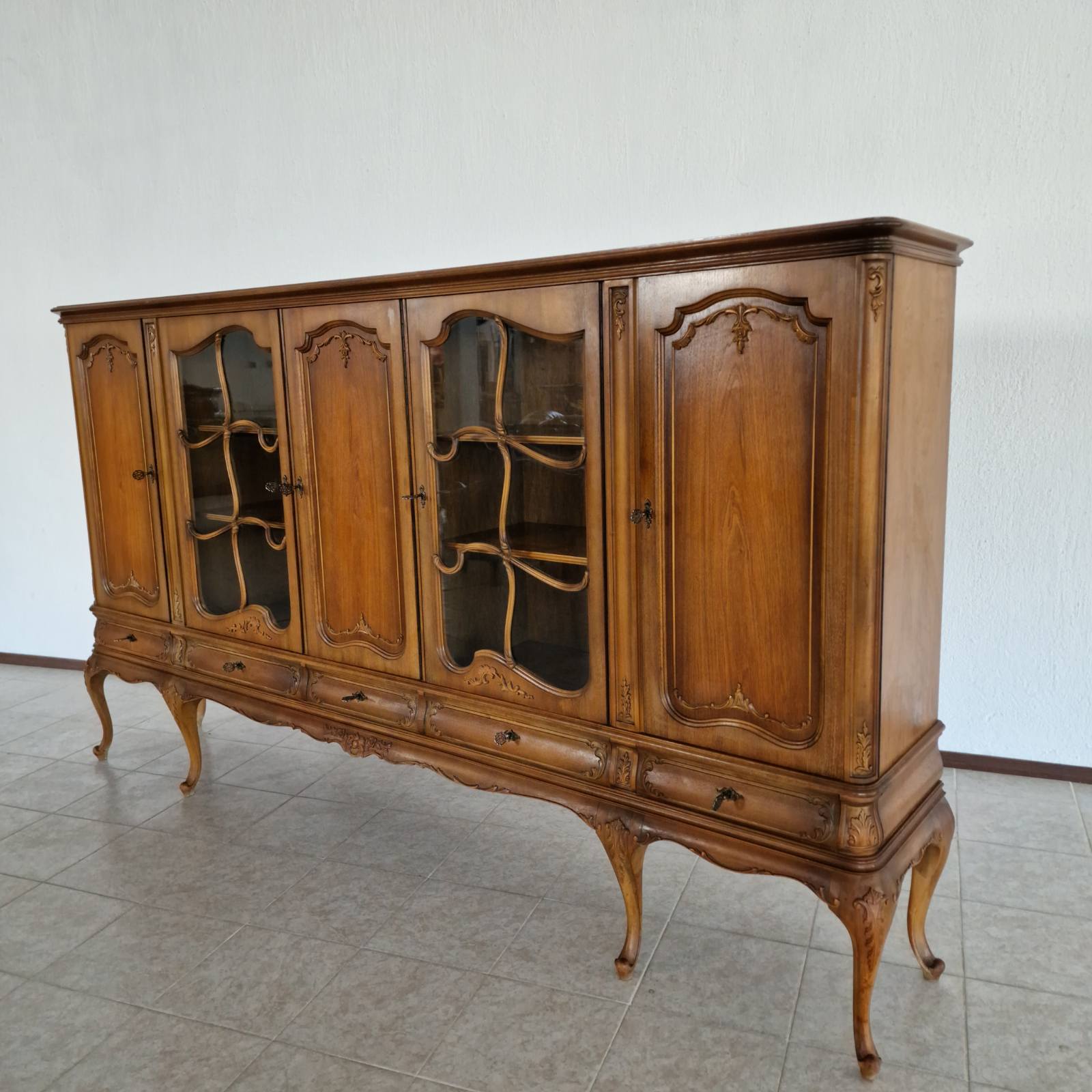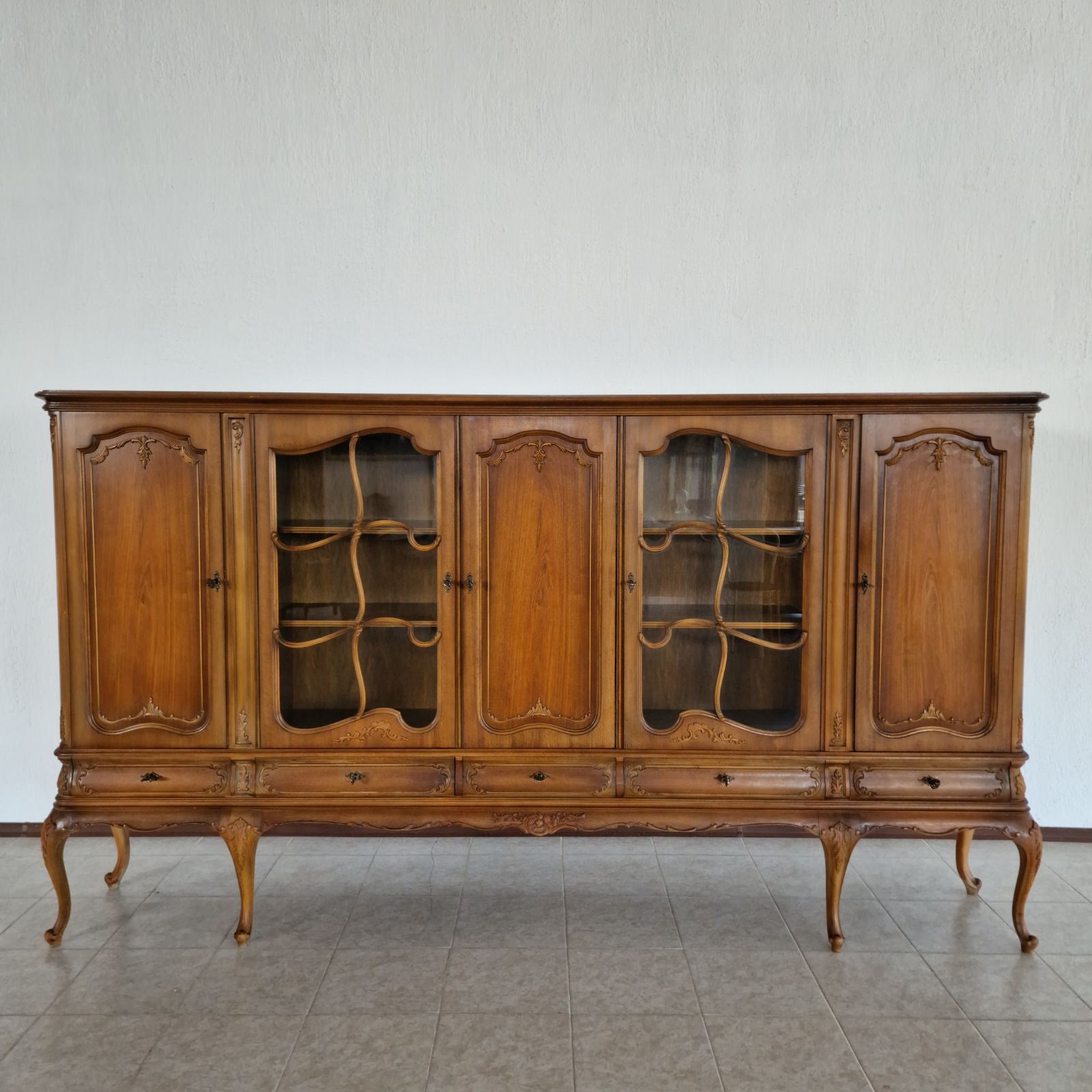 Изработен от масивен орех, този шкаф-витрина съчетава здравина и елегантност. Разполага с пет чекмеджета и пет вратички на три нива, които могат да се коригират според вашите нужди. Това осигурява максимално пространство за съхранение и организиране на всички ваши предмети.