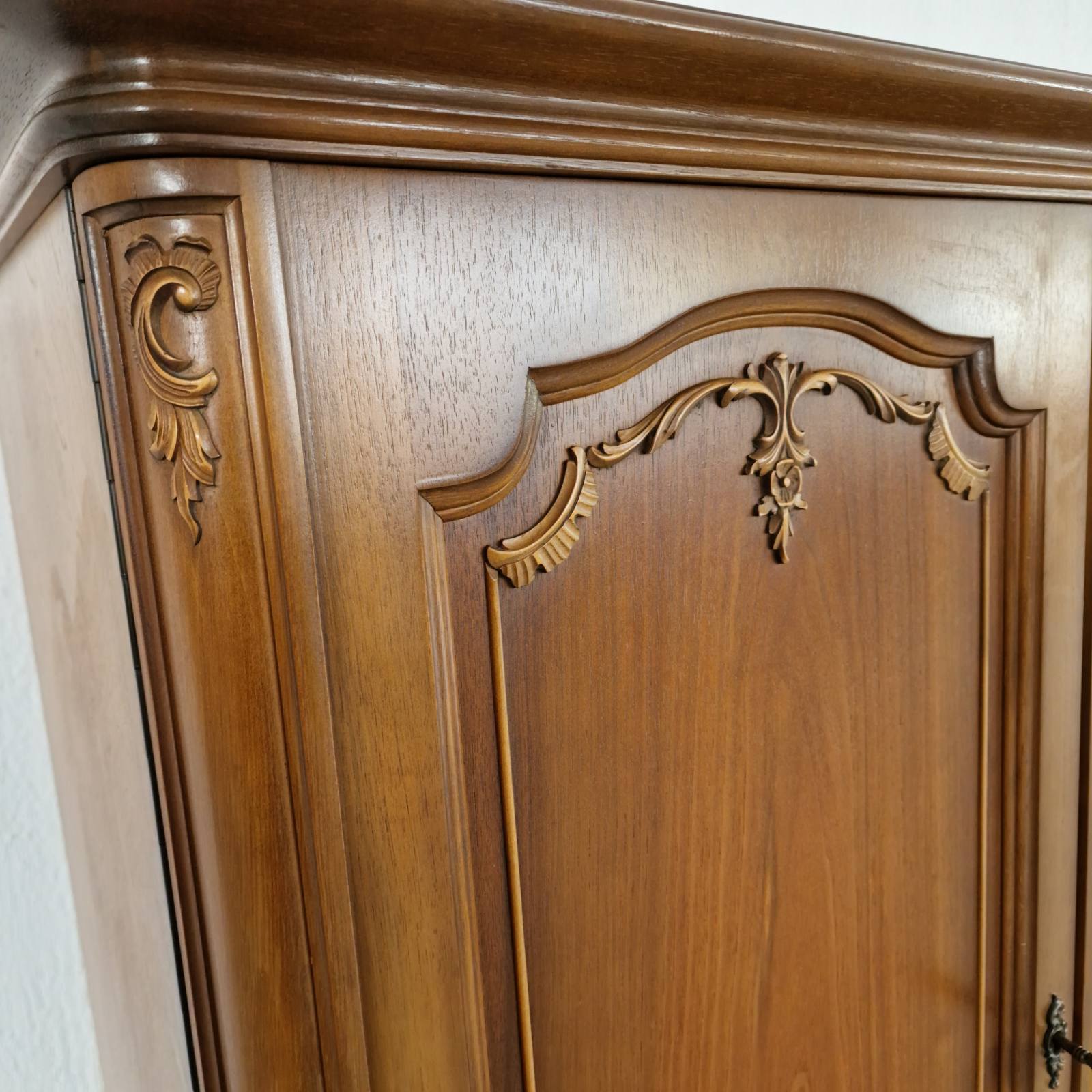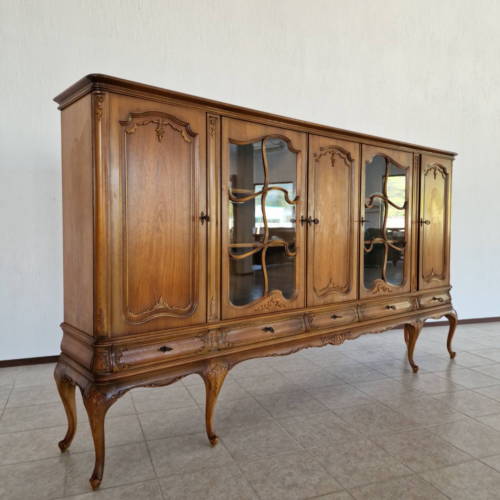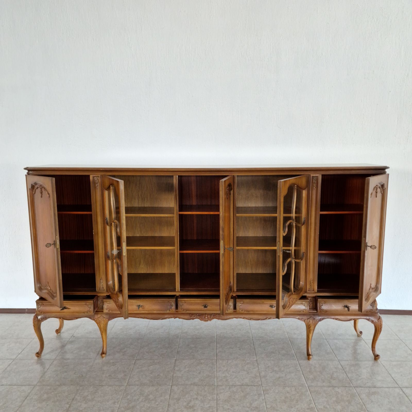 Изработен от масивен орех, този шкаф-витрина съчетава здравина и елегантност. Разполага с пет чекмеджета и пет вратички на три нива, които могат да се коригират според вашите нужди. Това осигурява максимално пространство за съхранение и организиране на всички ваши предмети.