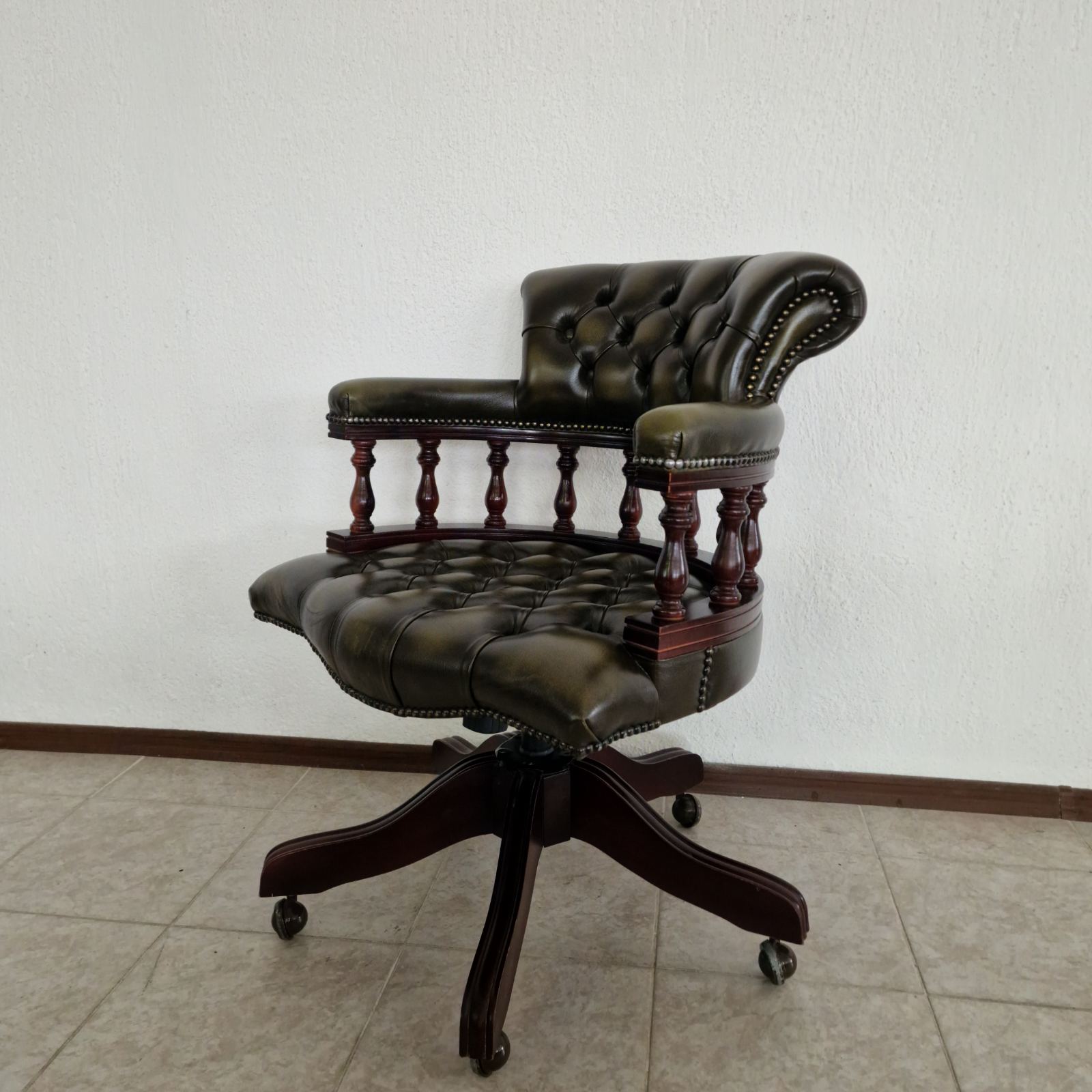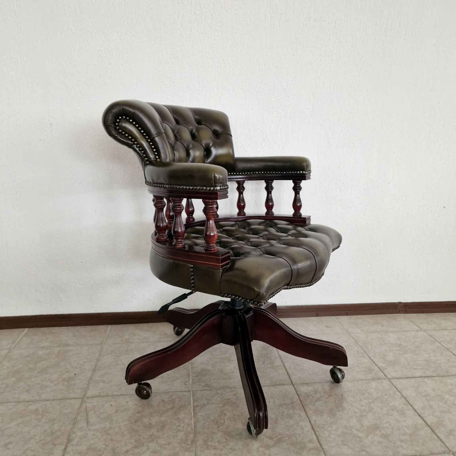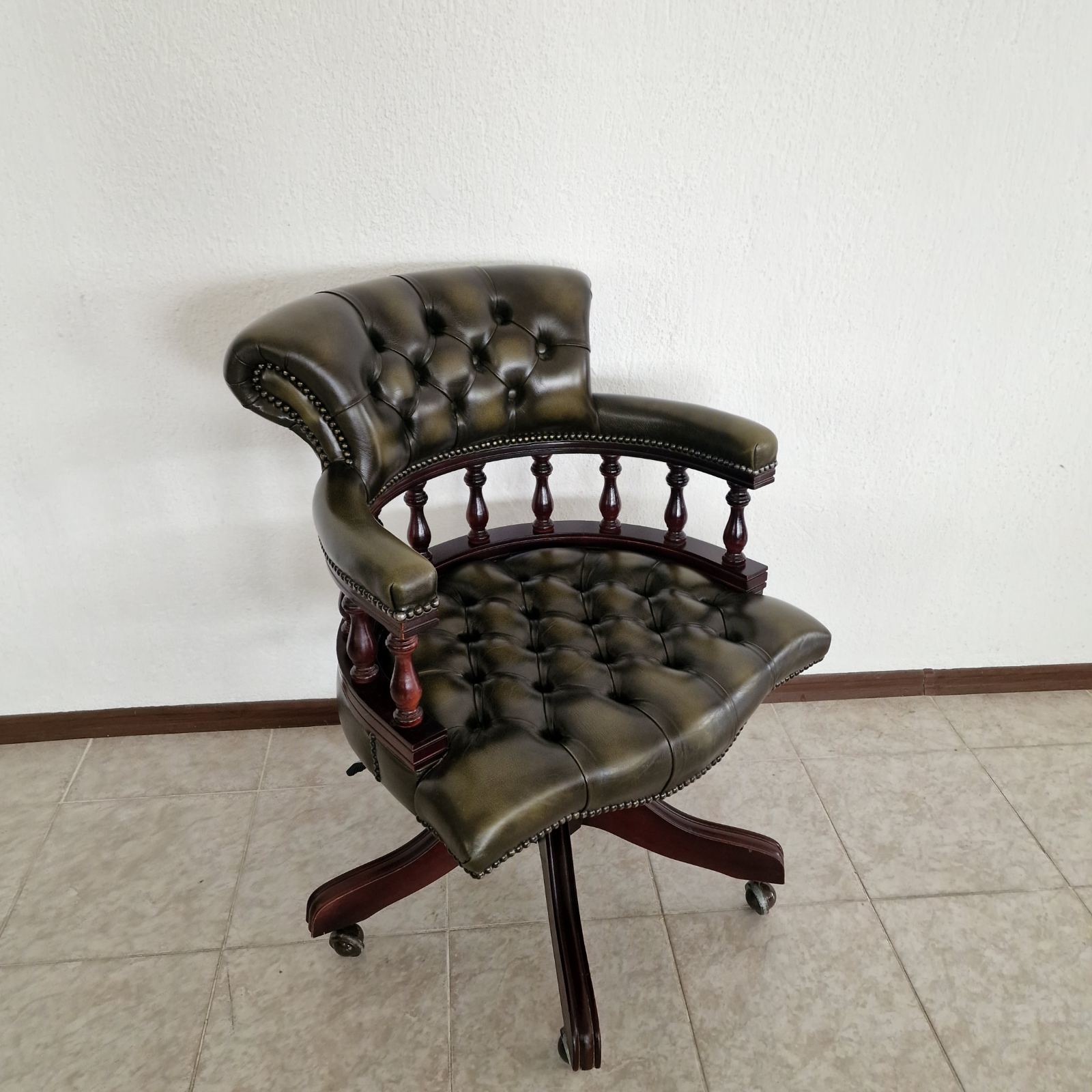 Стол за бюро Chesterfield с класическо и представително излъчване, изработен с внимание към комфорта и детайла. Моделът е тапициран с естествена телешка кожа в елегантна зелено-черна цветова комбинация, която подчертава луксозния характер на стола и го прави подходящ както за класически, така и за модерен кабинет.