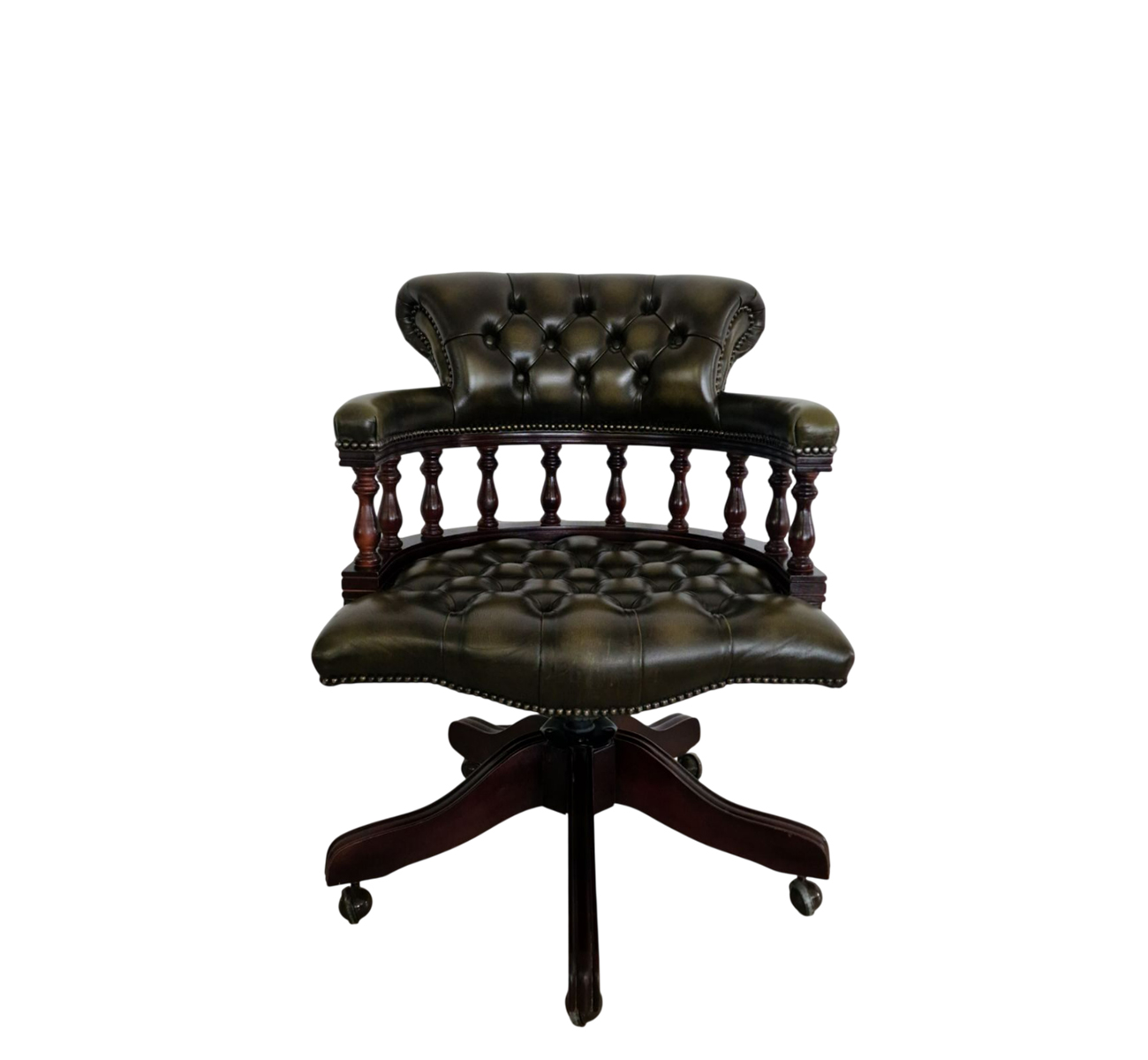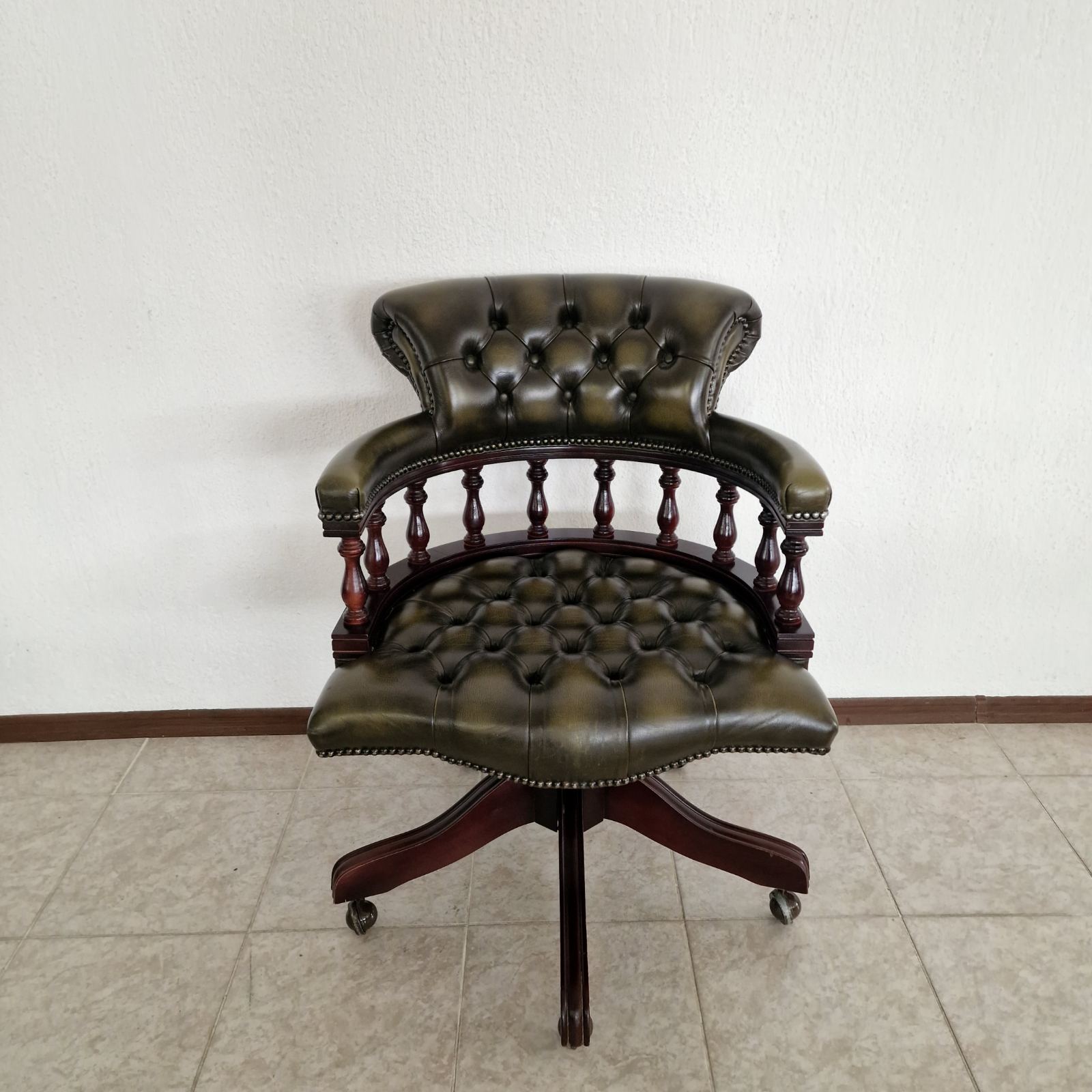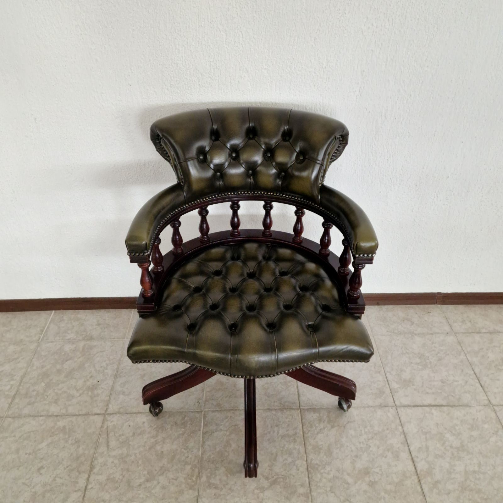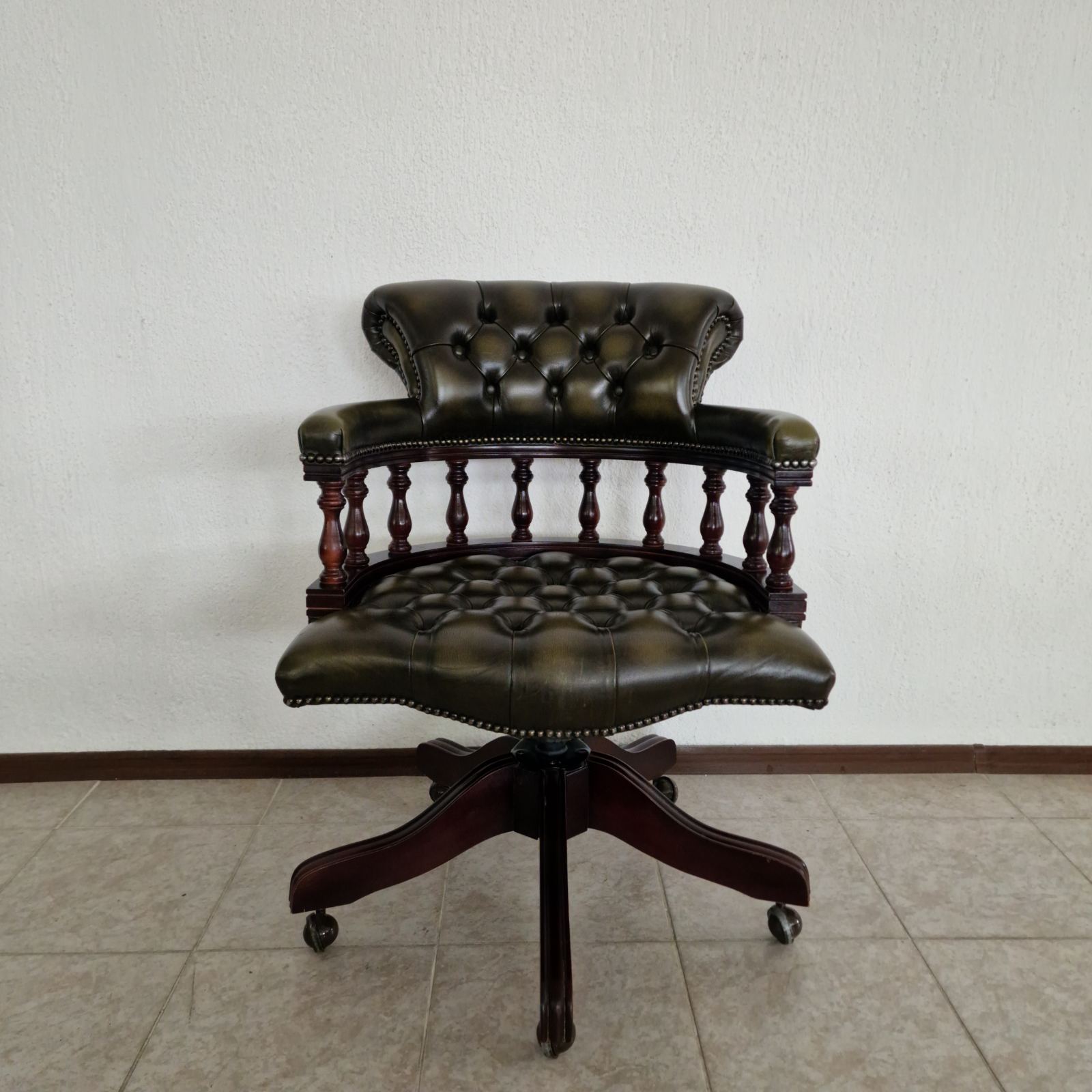 Стол за бюро Chesterfield с класическо и представително излъчване, изработен с внимание към комфорта и детайла. Моделът е тапициран с естествена телешка кожа в елегантна зелено-черна цветова комбинация, която подчертава луксозния характер на стола и го прави подходящ както за класически, така и за модерен кабинет.