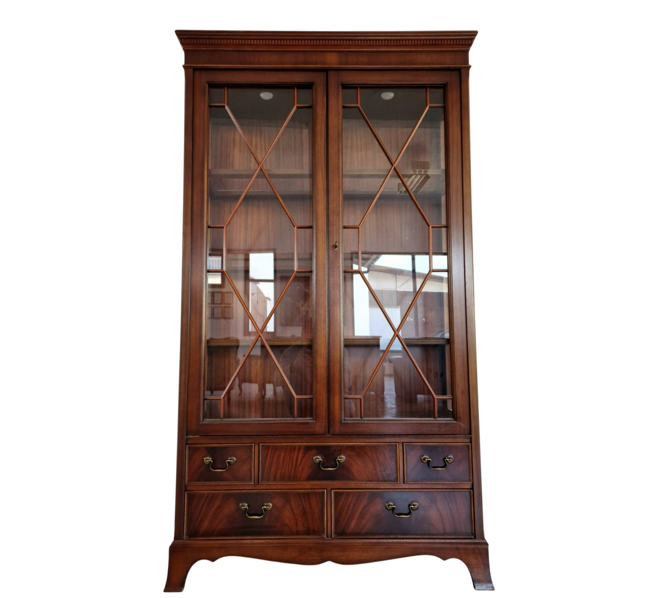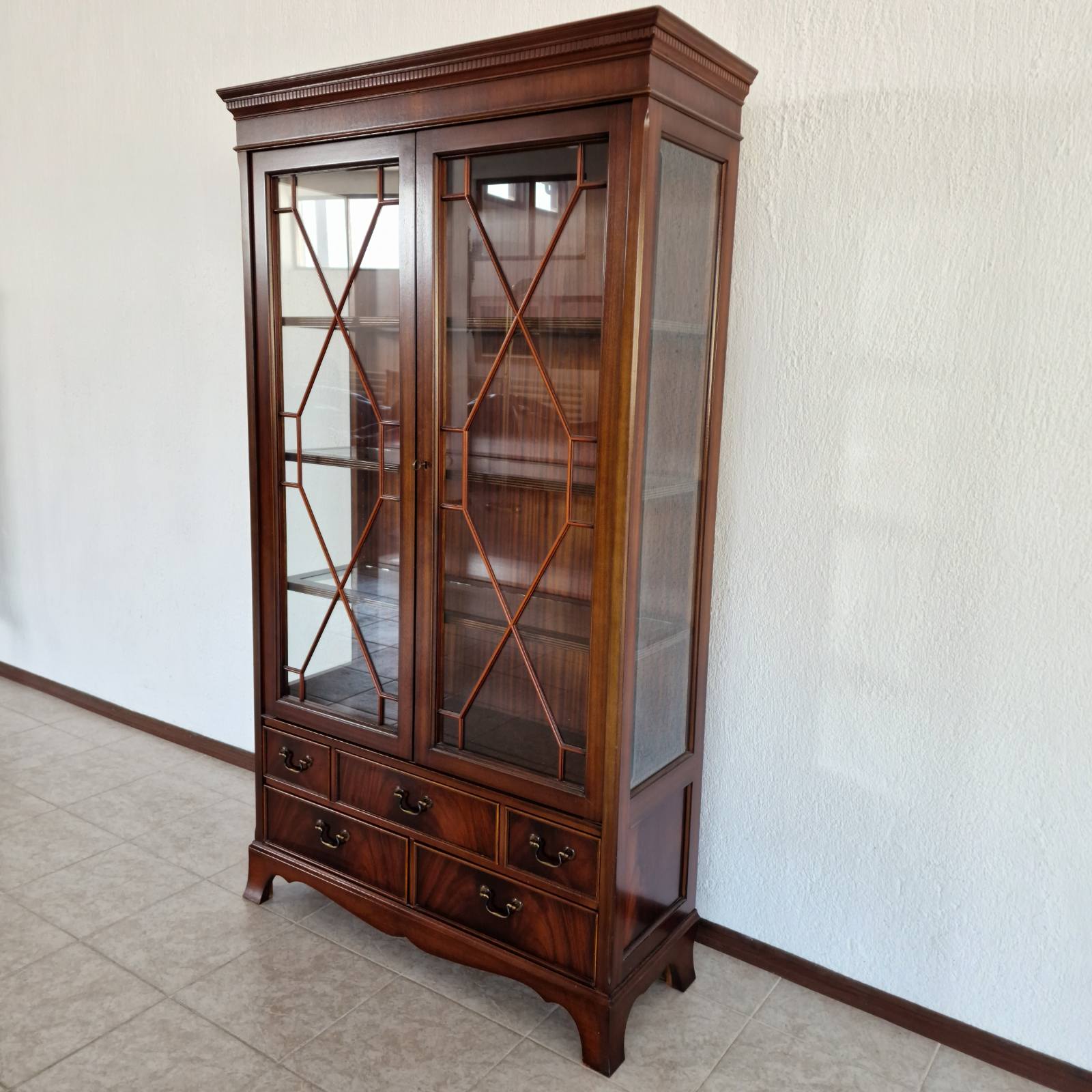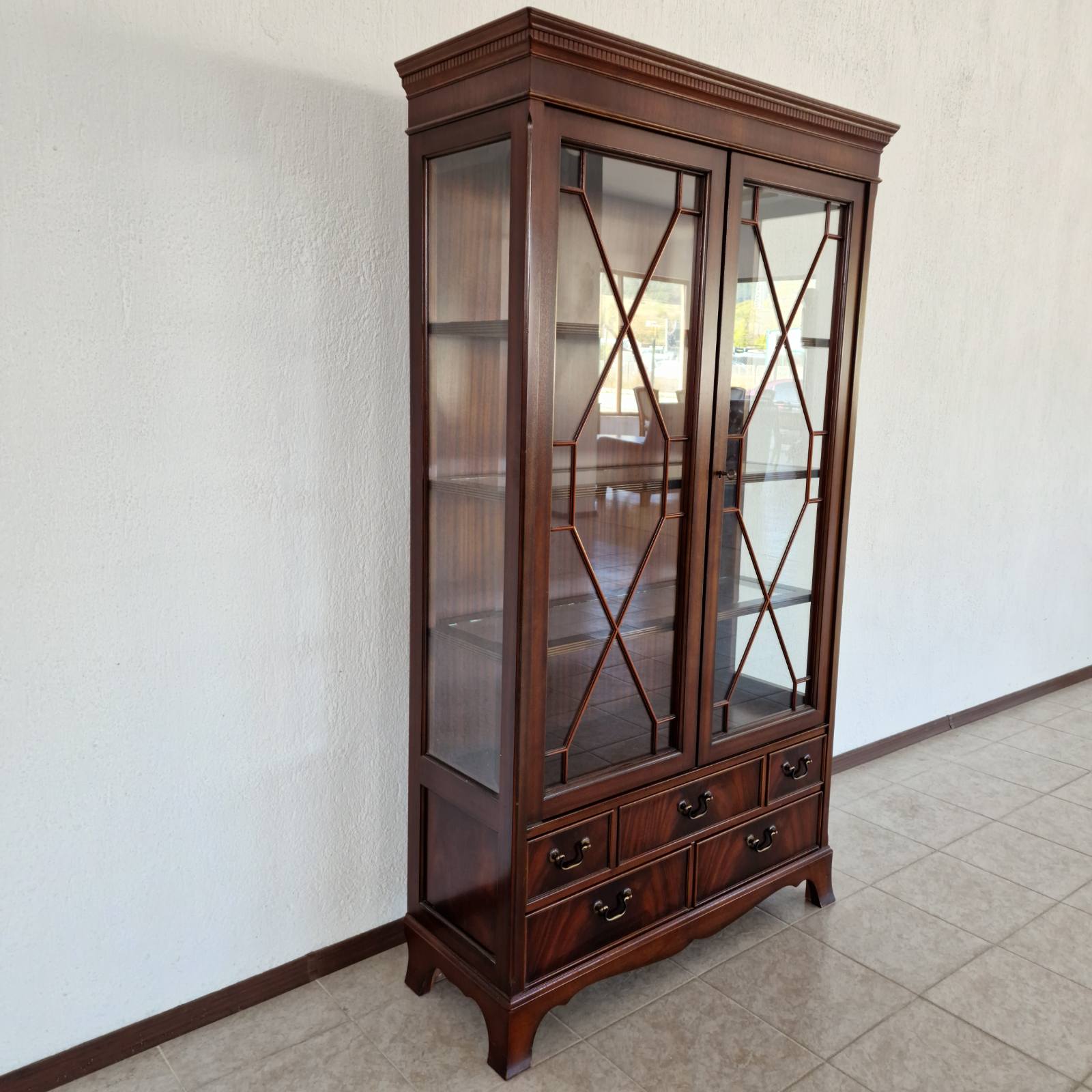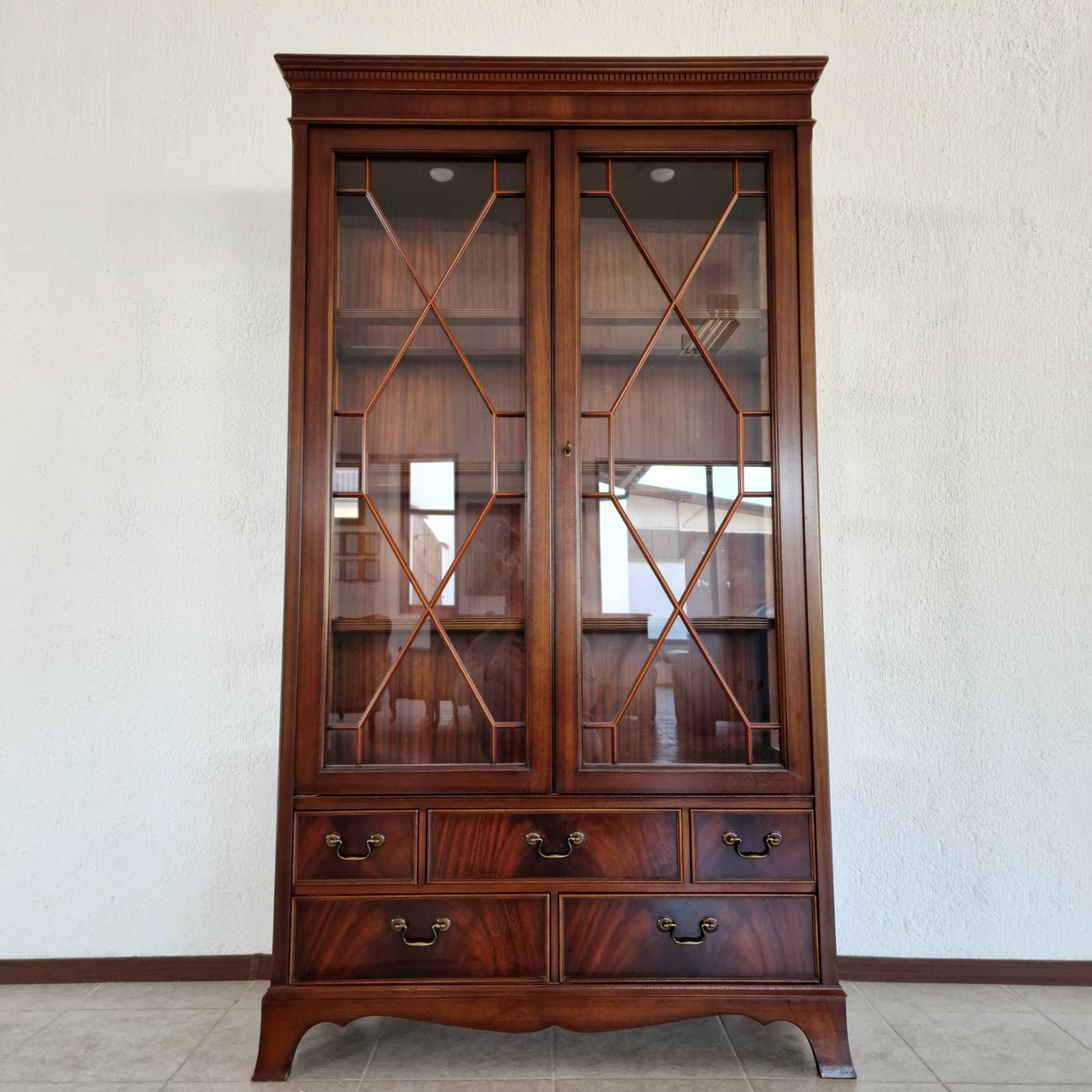 Впечатляваща витрина–библиотека в стил Chesterfield, изцяло ръчна изработка от масивен махагон – символ на класа, вкус и английска елегантност. Всеки детайл е изработен с изключителна прецизност и внимание, подчертавайки неповторимия характер на тази мебел.