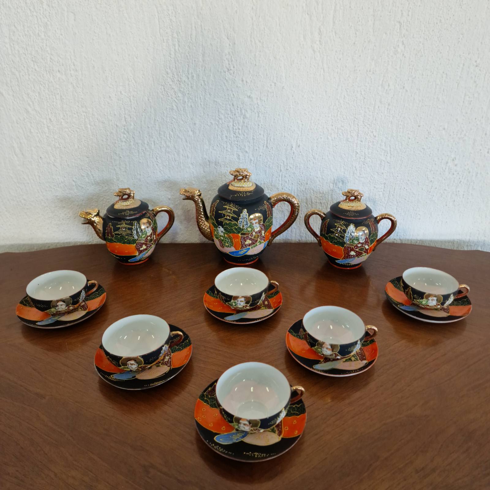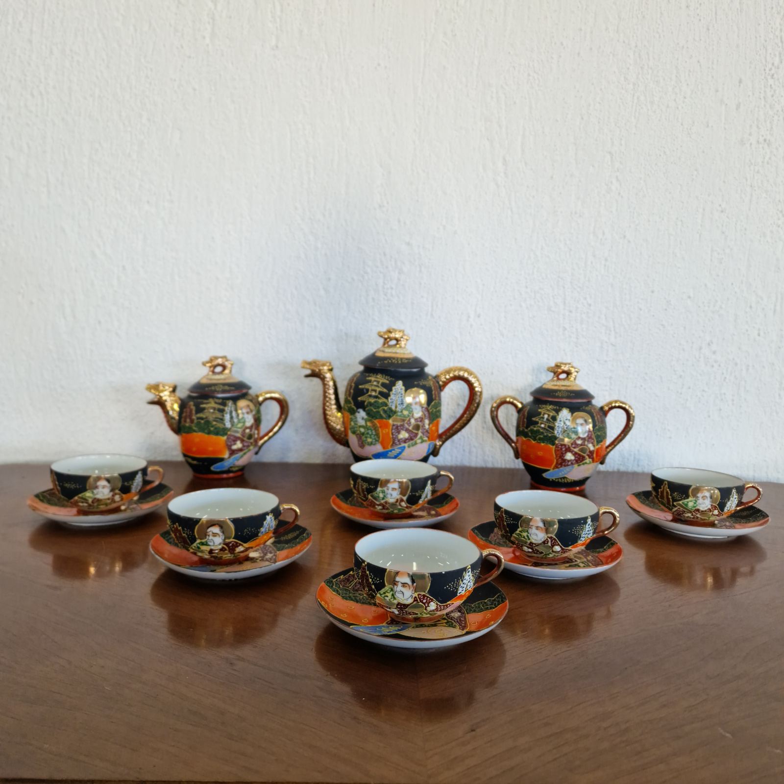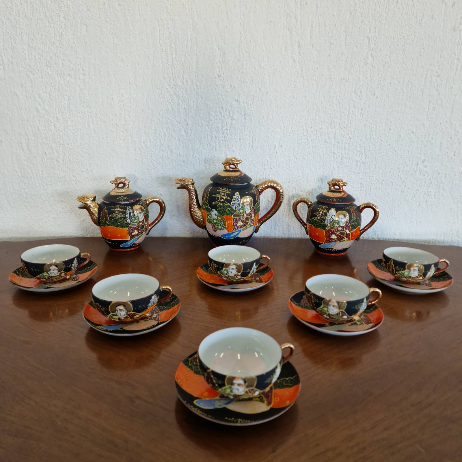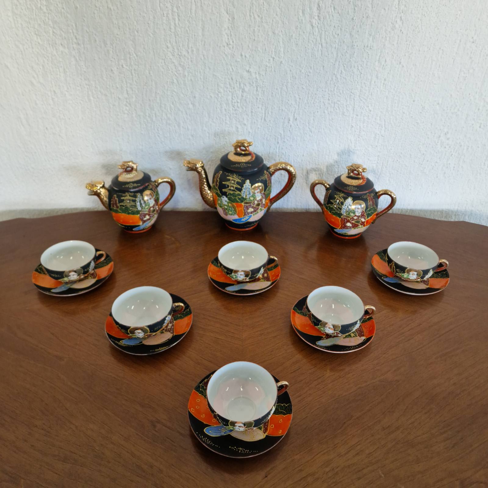 Фин японски костен порцелан в стил Satsuma, разпознаваем по своята богата орнаментика и детайлно изпълнени ориенталски мотиви. Декорацията е наситена със златни акценти и сцени, които придават дълбочина и художествена стойност. Формите са елегантни, а порцеланът е лек и с характерен мек блясък. Изделие с характер, традиция и изразено източно излъчване.