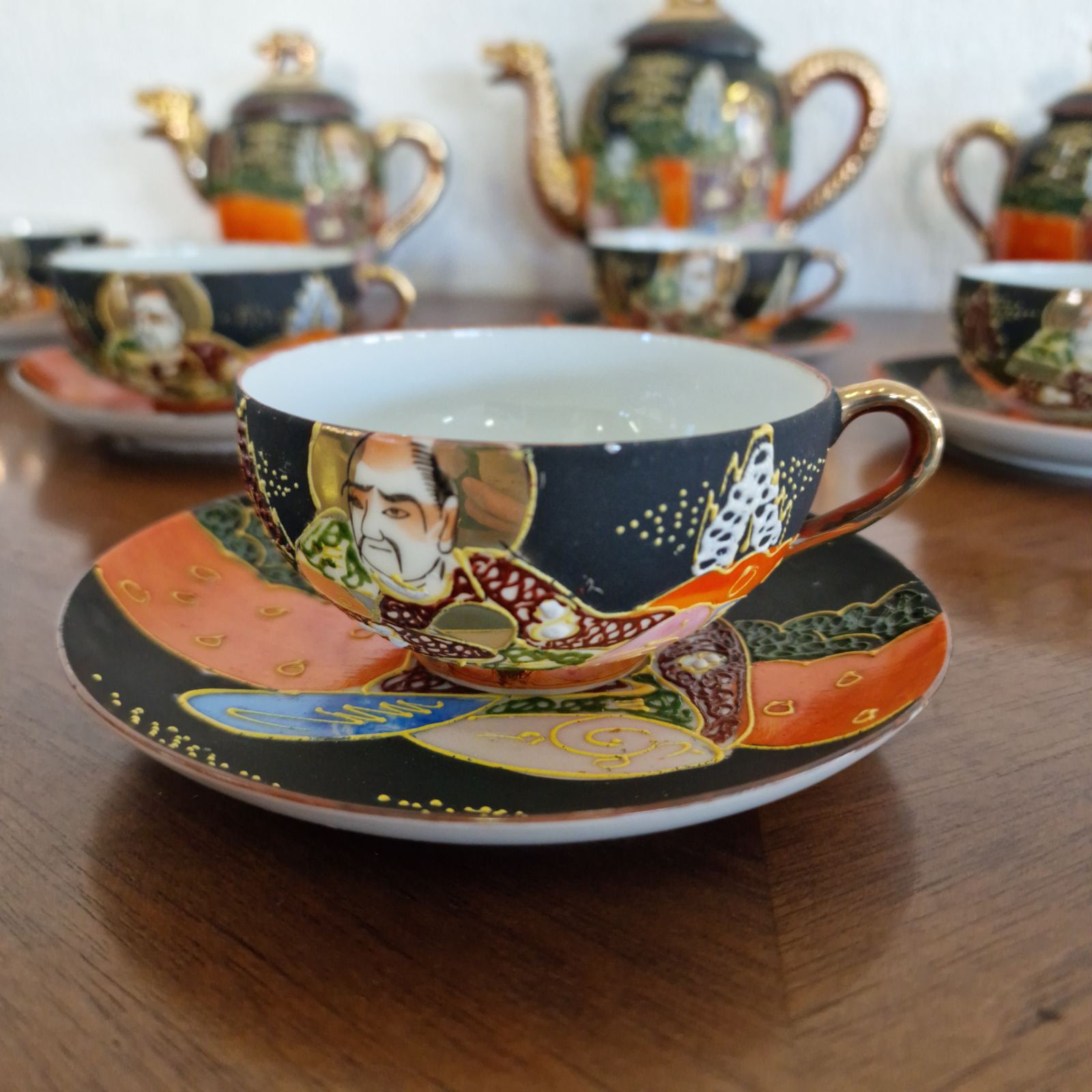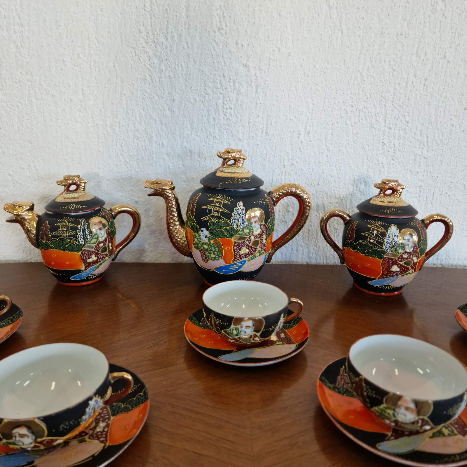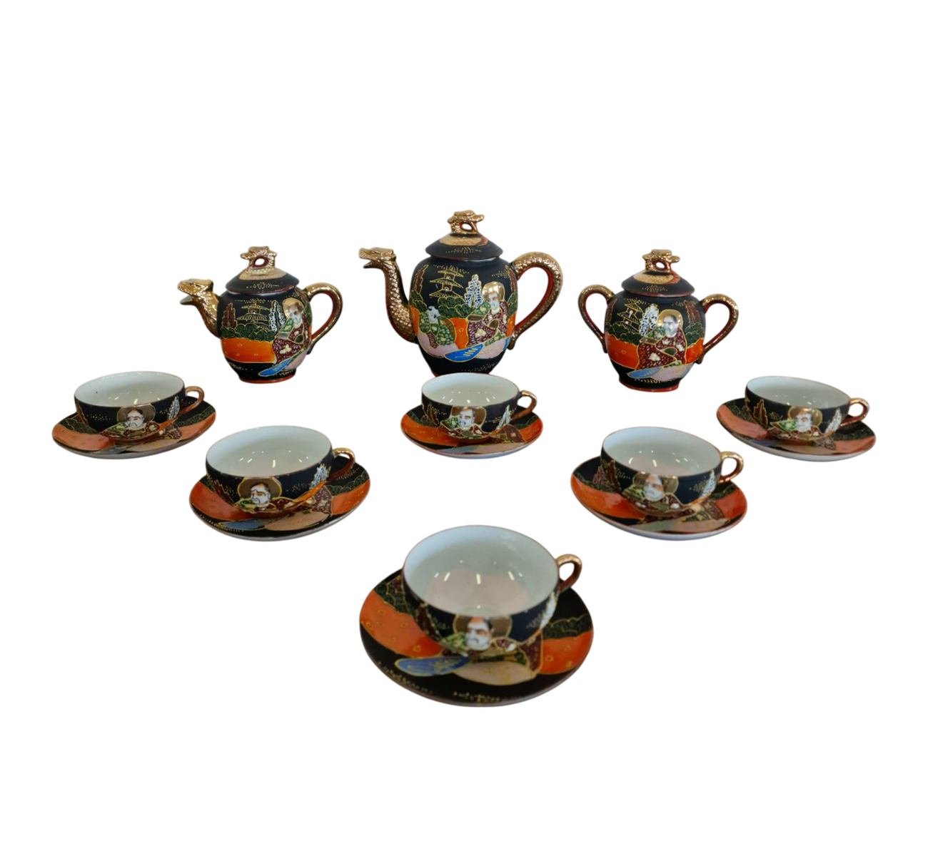 Фин японски костен порцелан в стил Satsuma, разпознаваем по своята богата орнаментика и детайлно изпълнени ориенталски мотиви. Декорацията е наситена със златни акценти и сцени, които придават дълбочина и художествена стойност. Формите са елегантни, а порцеланът е лек и с характерен мек блясък. Изделие с характер, традиция и изразено източно излъчване.