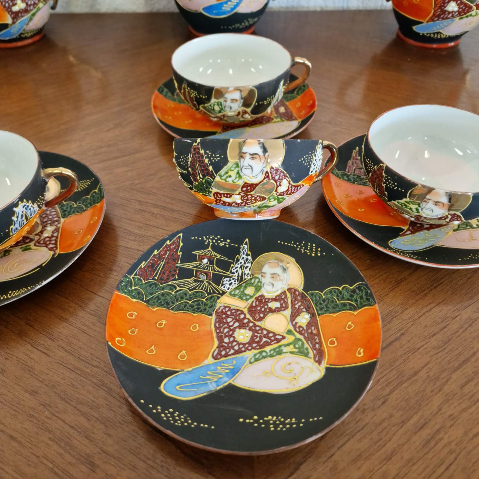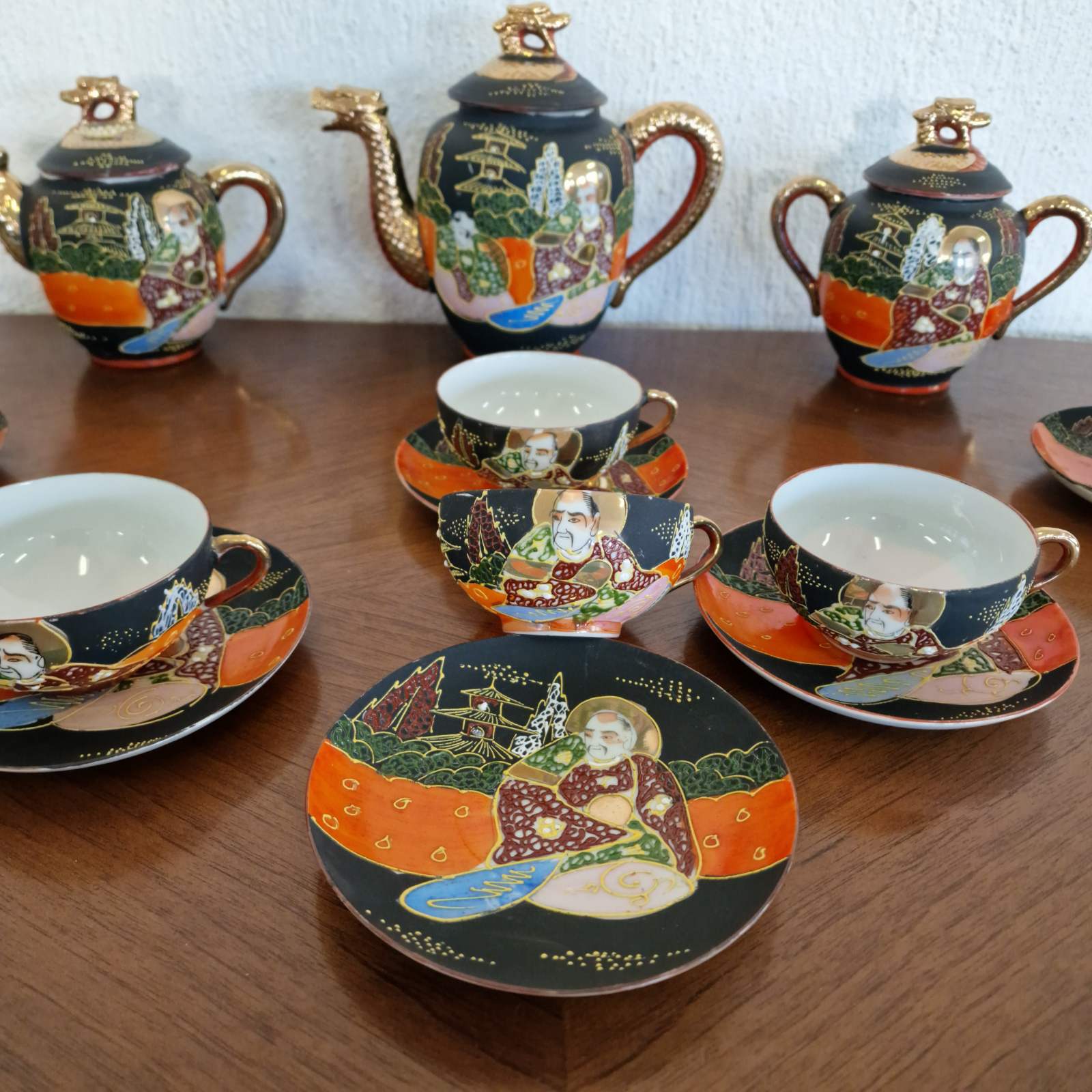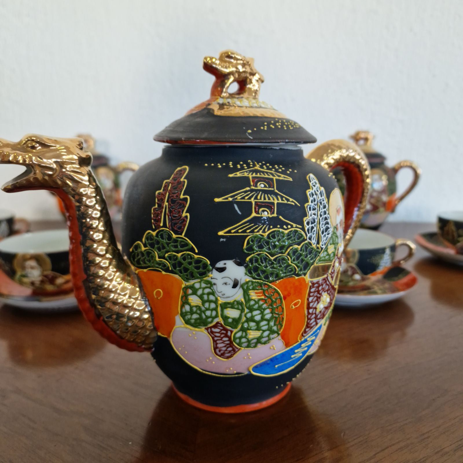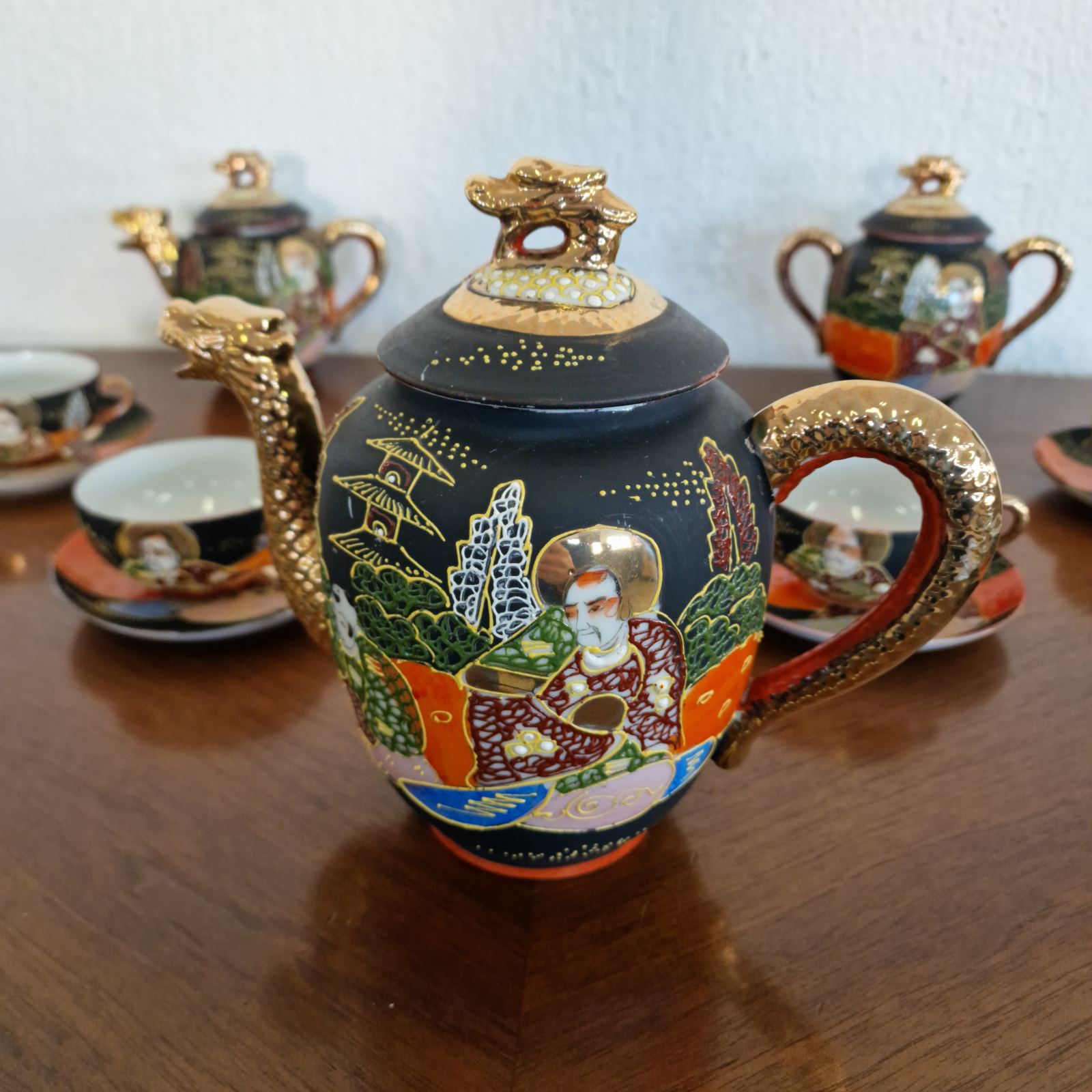 Фин японски костен порцелан в стил Satsuma, разпознаваем по своята богата орнаментика и детайлно изпълнени ориенталски мотиви. Декорацията е наситена със златни акценти и сцени, които придават дълбочина и художествена стойност. Формите са елегантни, а порцеланът е лек и с характерен мек блясък. Изделие с характер, традиция и изразено източно излъчване.